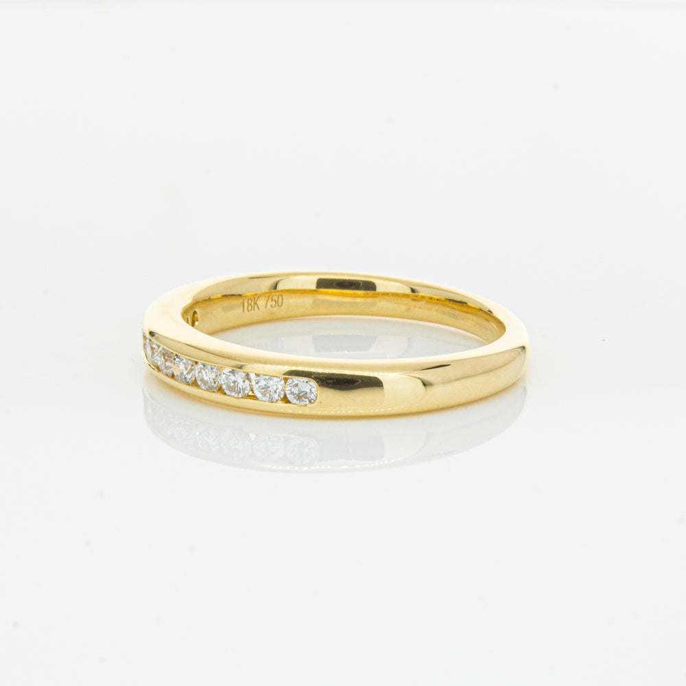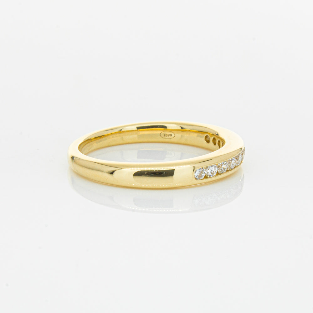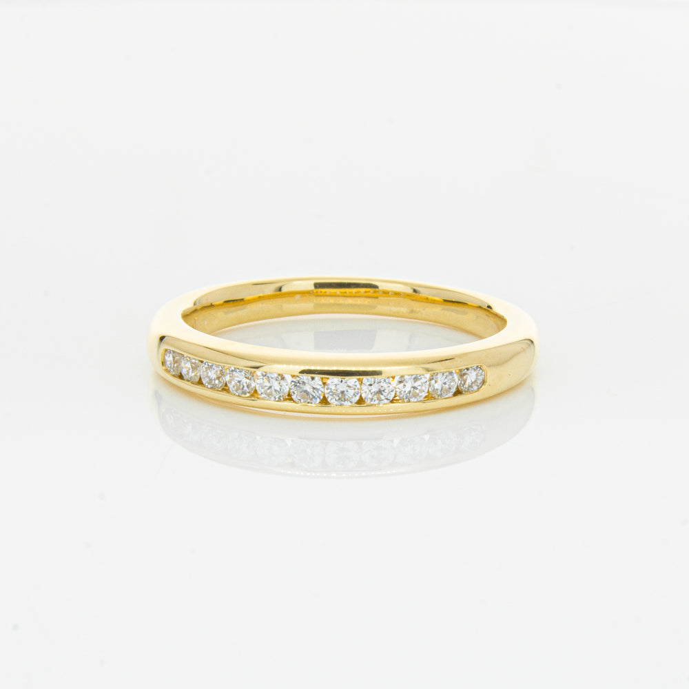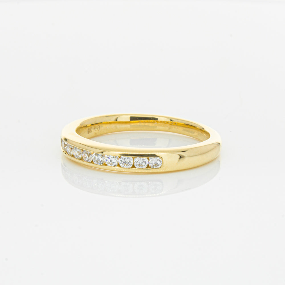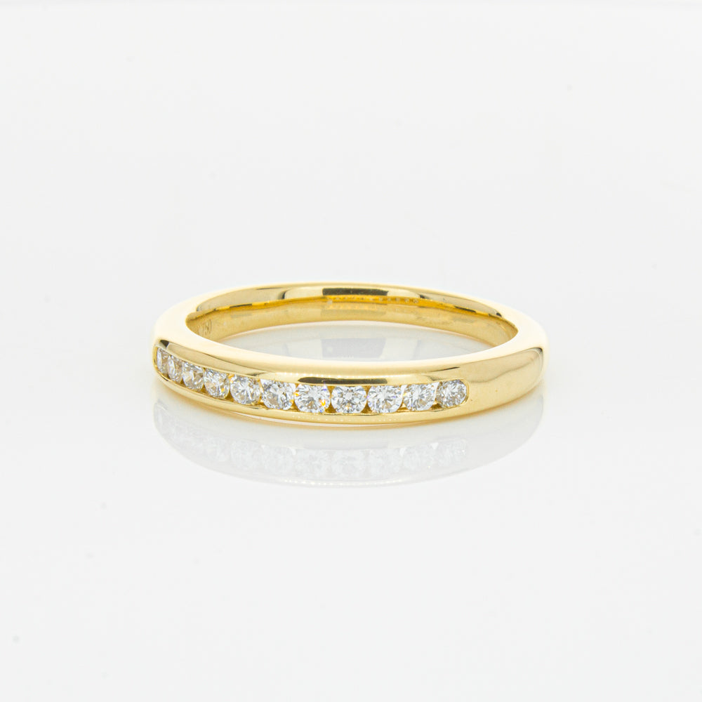This diamond band boasts a refined and sophisticated design, adorned with shimmering round brilliant cut diamonds and crafted from 18ct yellow gold.