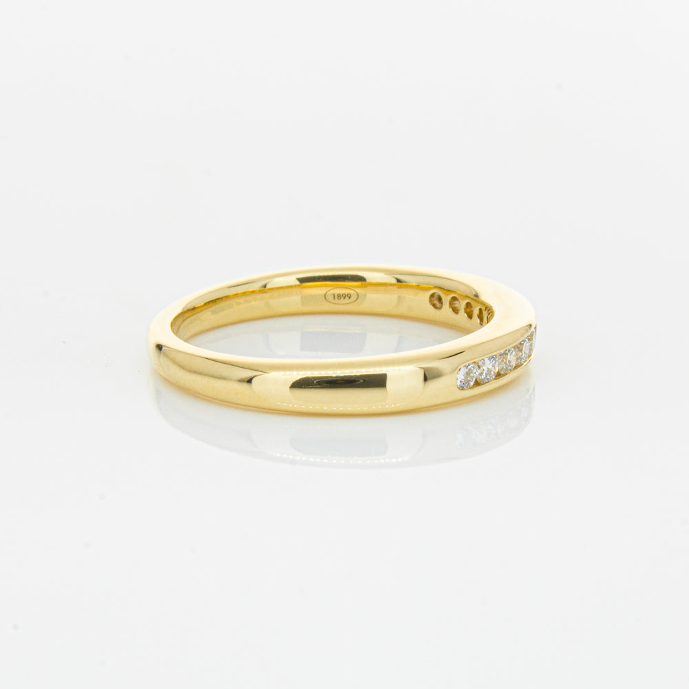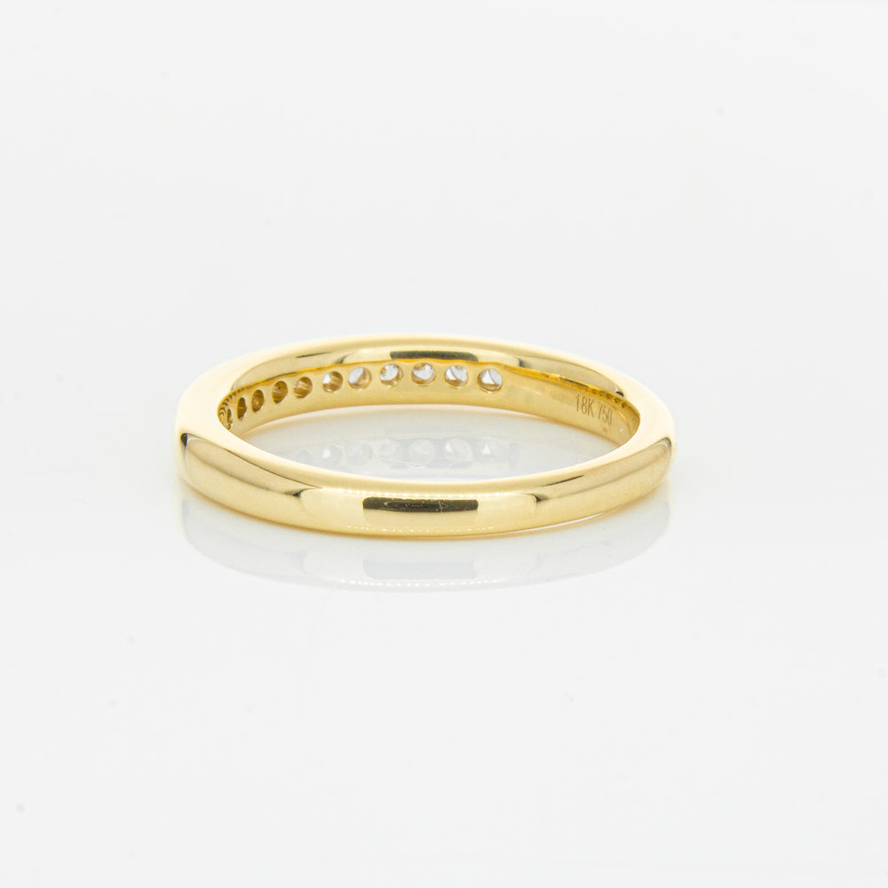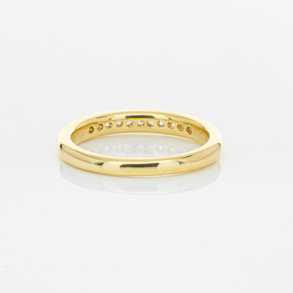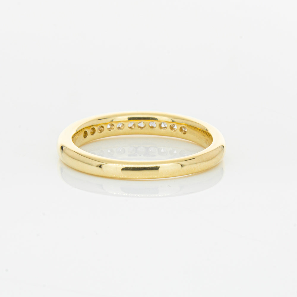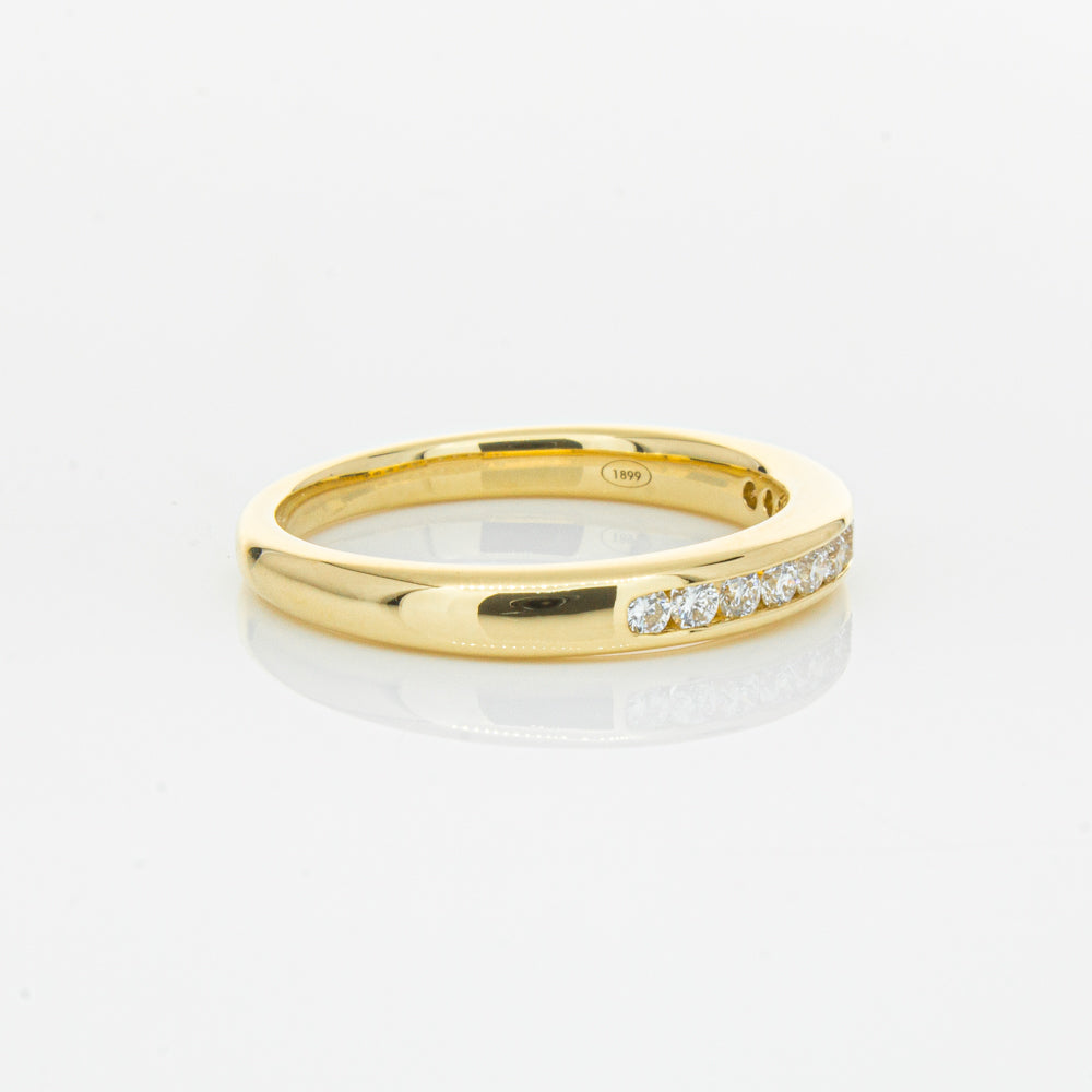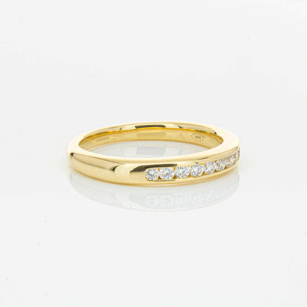 This diamond band boasts a refined and sophisticated design, adorned with shimmering round brilliant cut diamonds and crafted from 18ct yellow gold.
