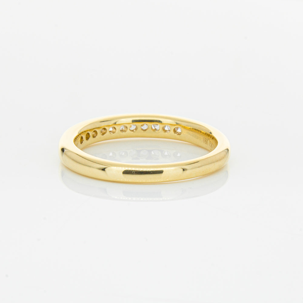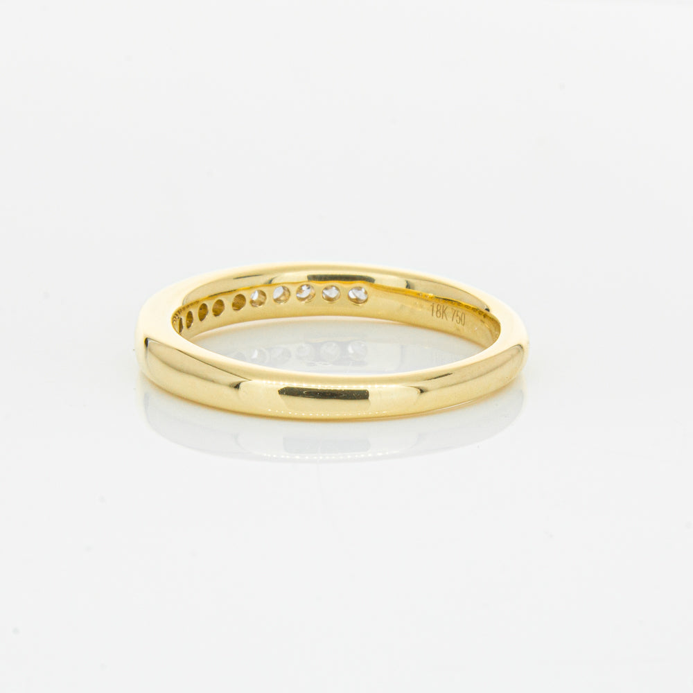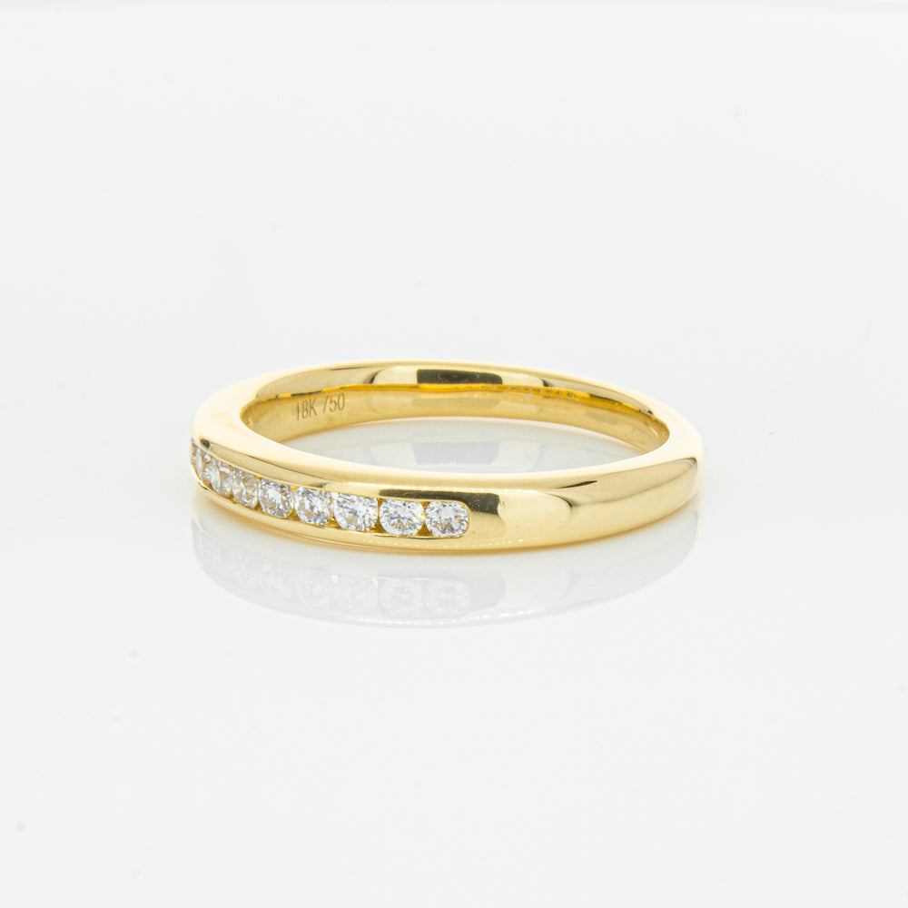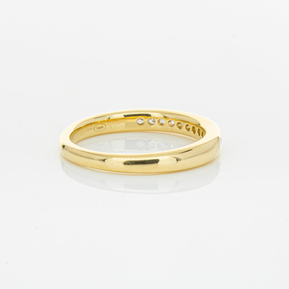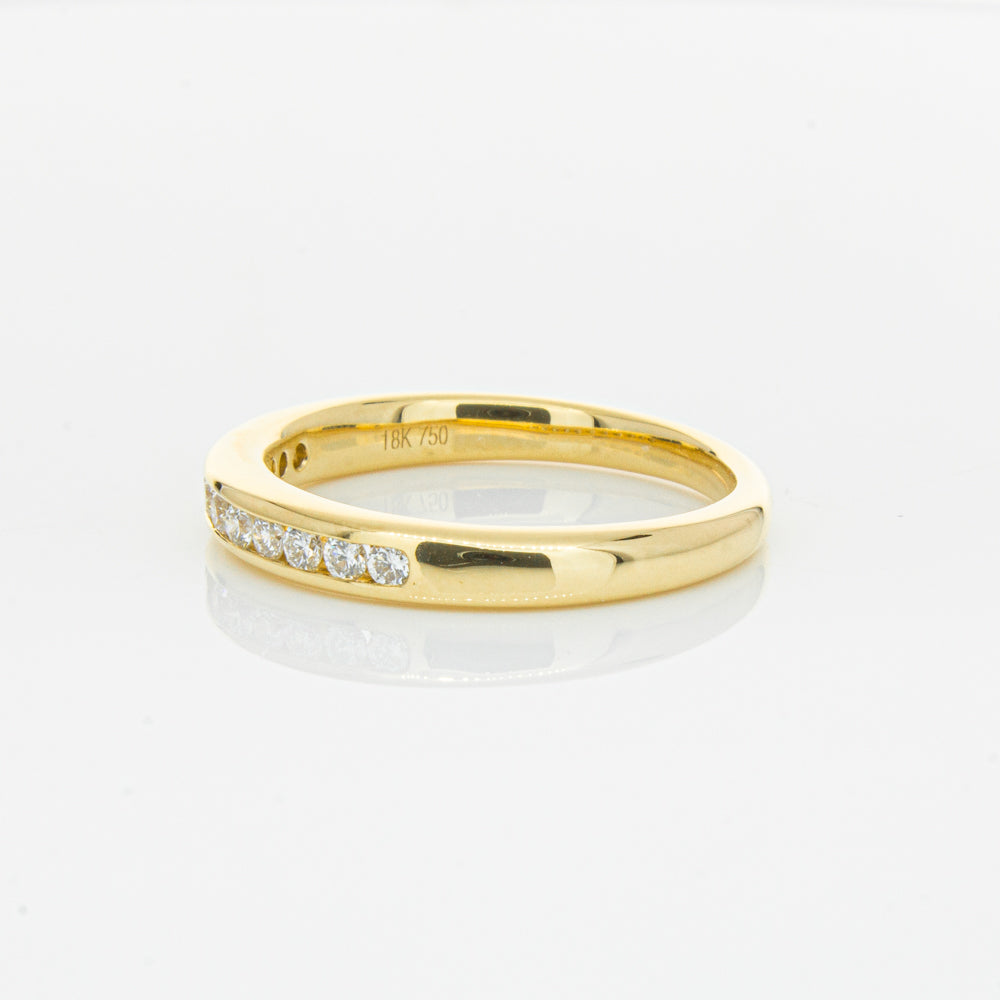This diamond band boasts a refined and sophisticated design, adorned with shimmering round brilliant cut diamonds and crafted from 18ct yellow gold.