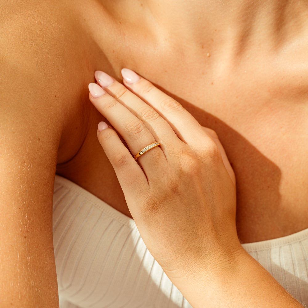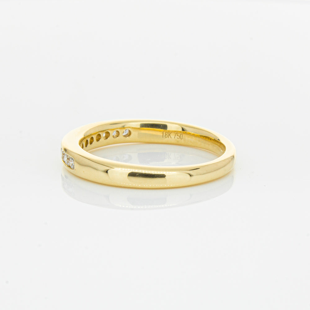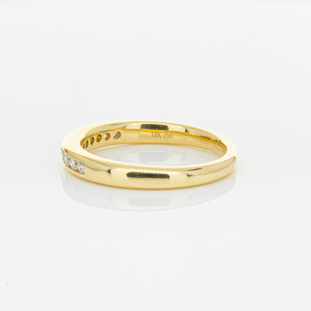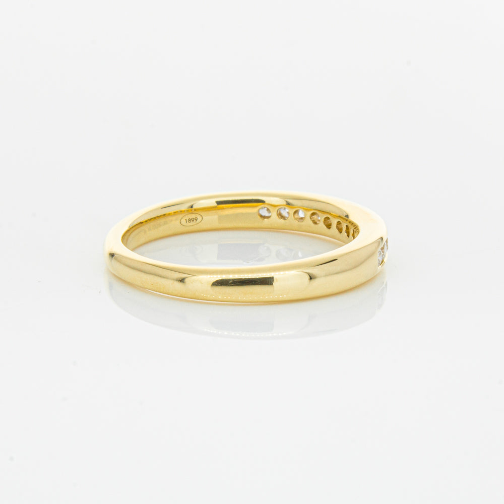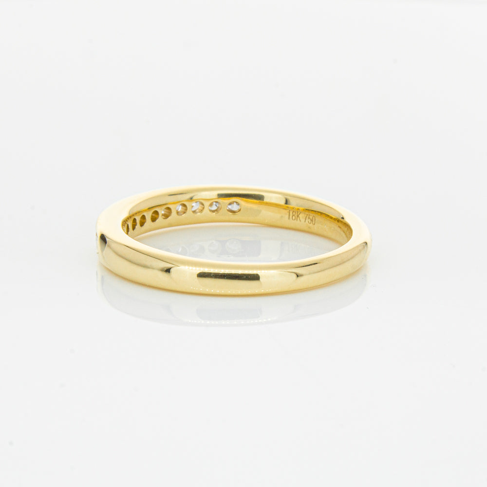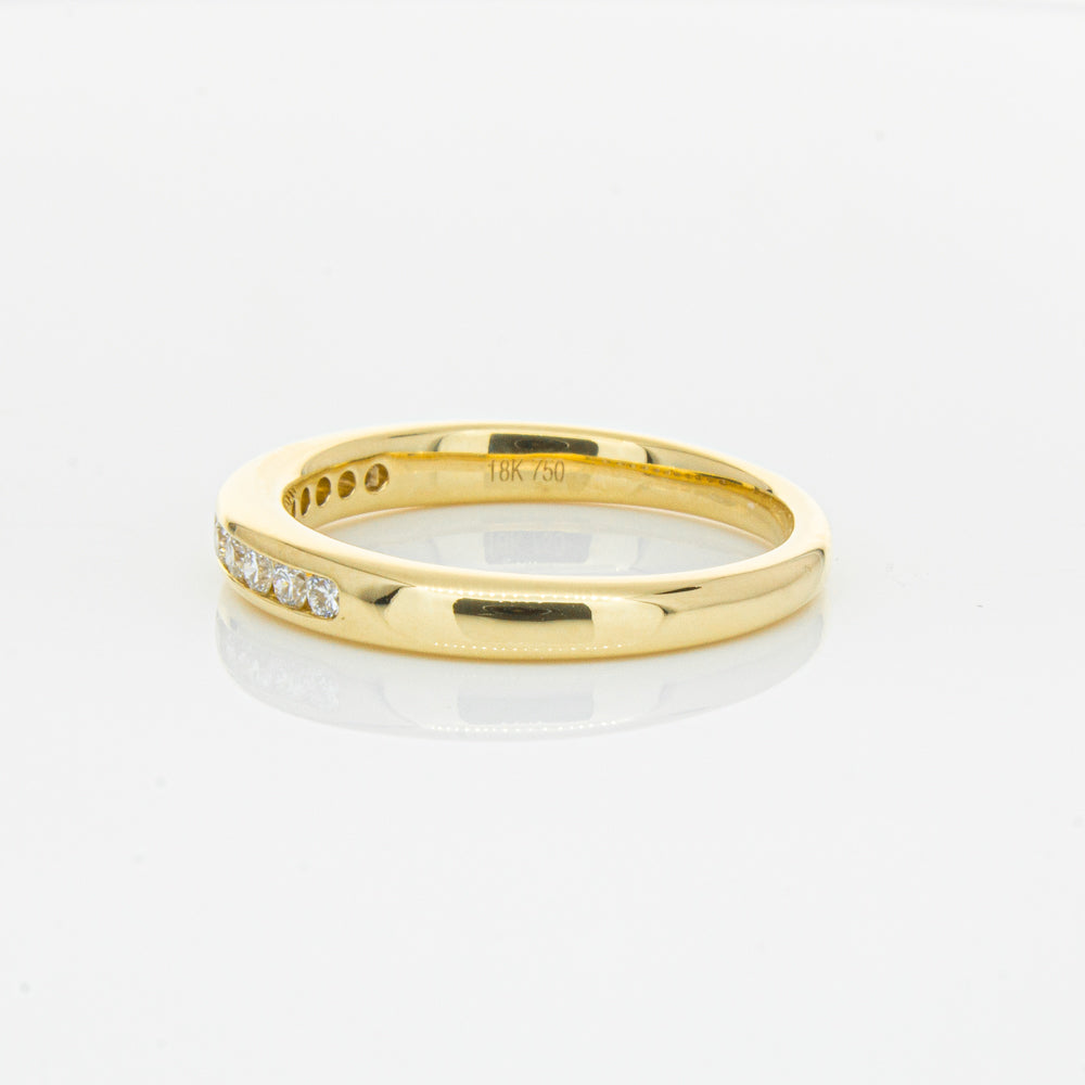 This diamond band boasts a refined and sophisticated design, adorned with shimmering round brilliant cut diamonds and crafted from 18ct yellow gold.