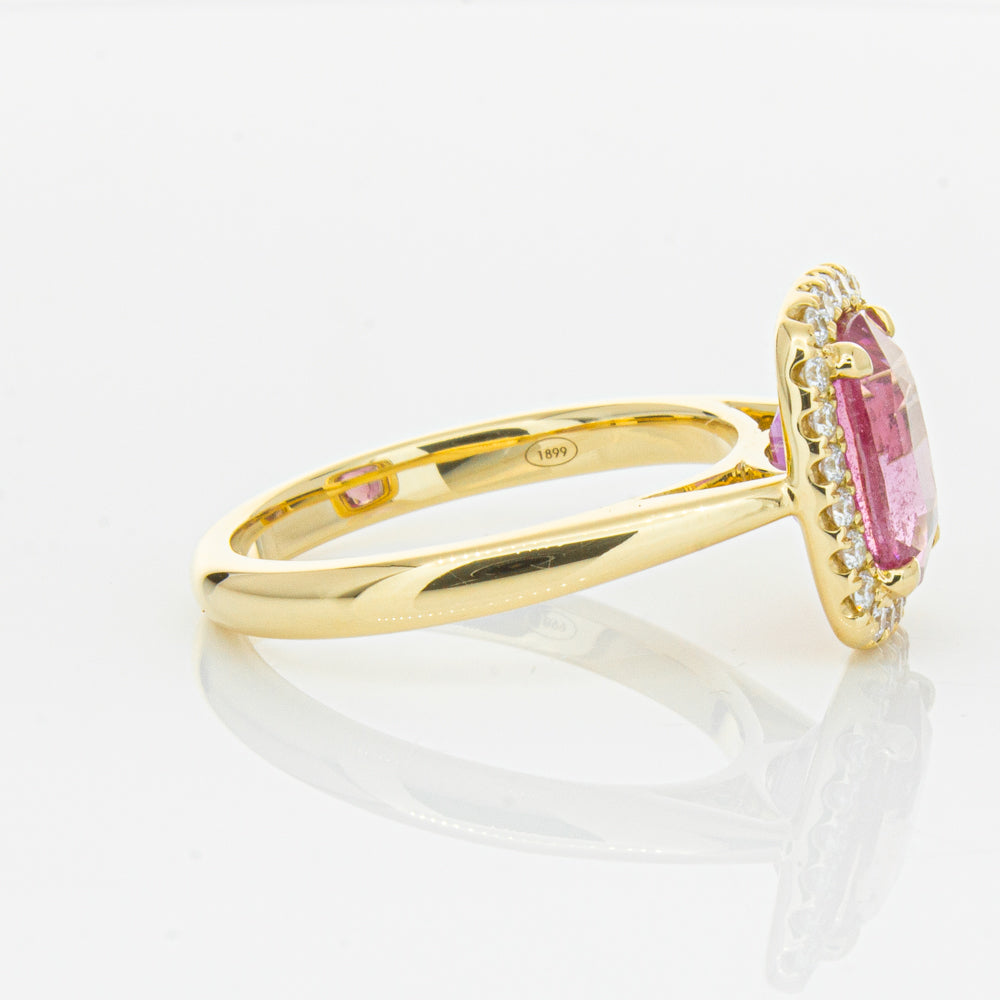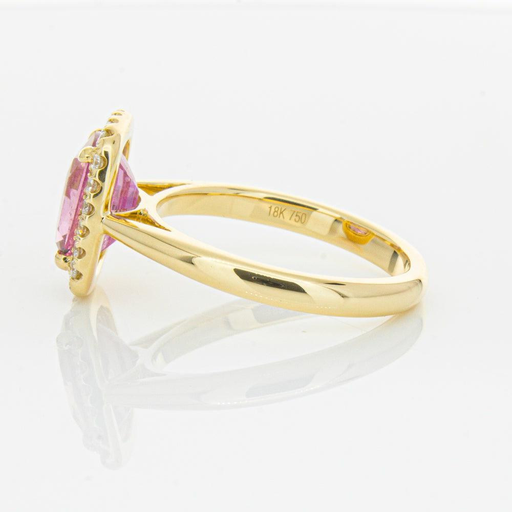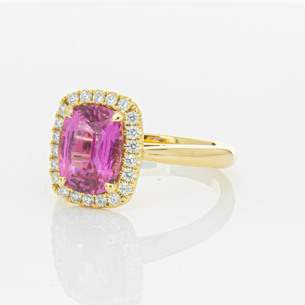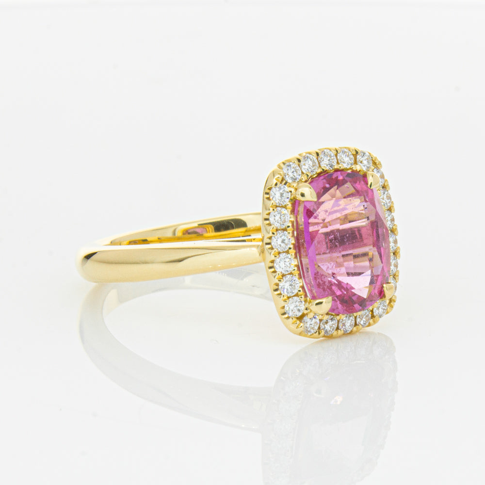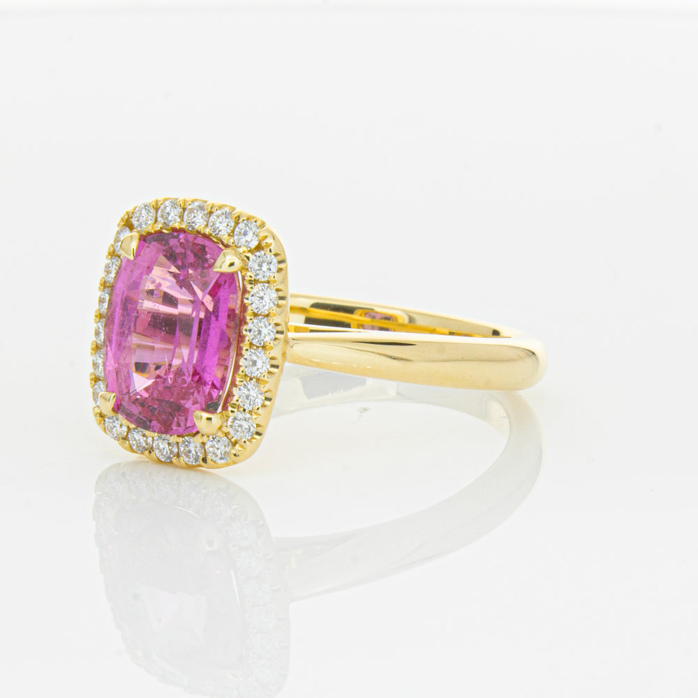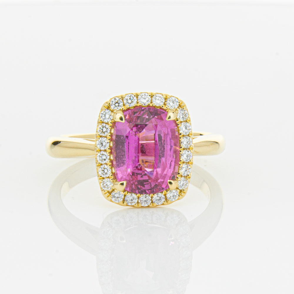 Elegant and sophisticated... This piece is carefully crafted in our signature 18ct yellow gold and boasts a gorgeous four claw set cushion faceted pink sapphire which rests on flow up diamond set shoulders. You will love showing off this piece!