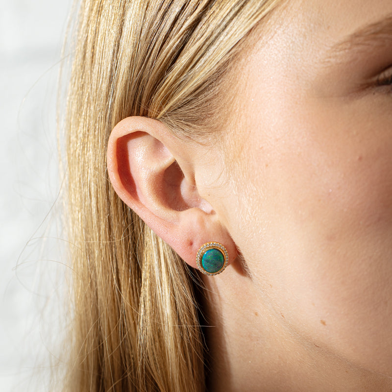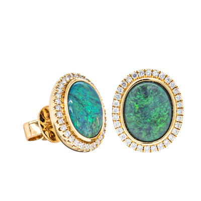Elegant in every way, this opal and diamond earring features oval faceted opals from Australia framed by round brilliant cut diamonds each in 18ct yellow gold secured with our specialty 1899 posts and butterflies.