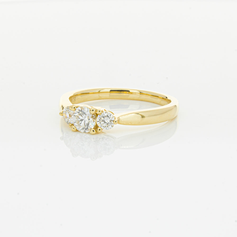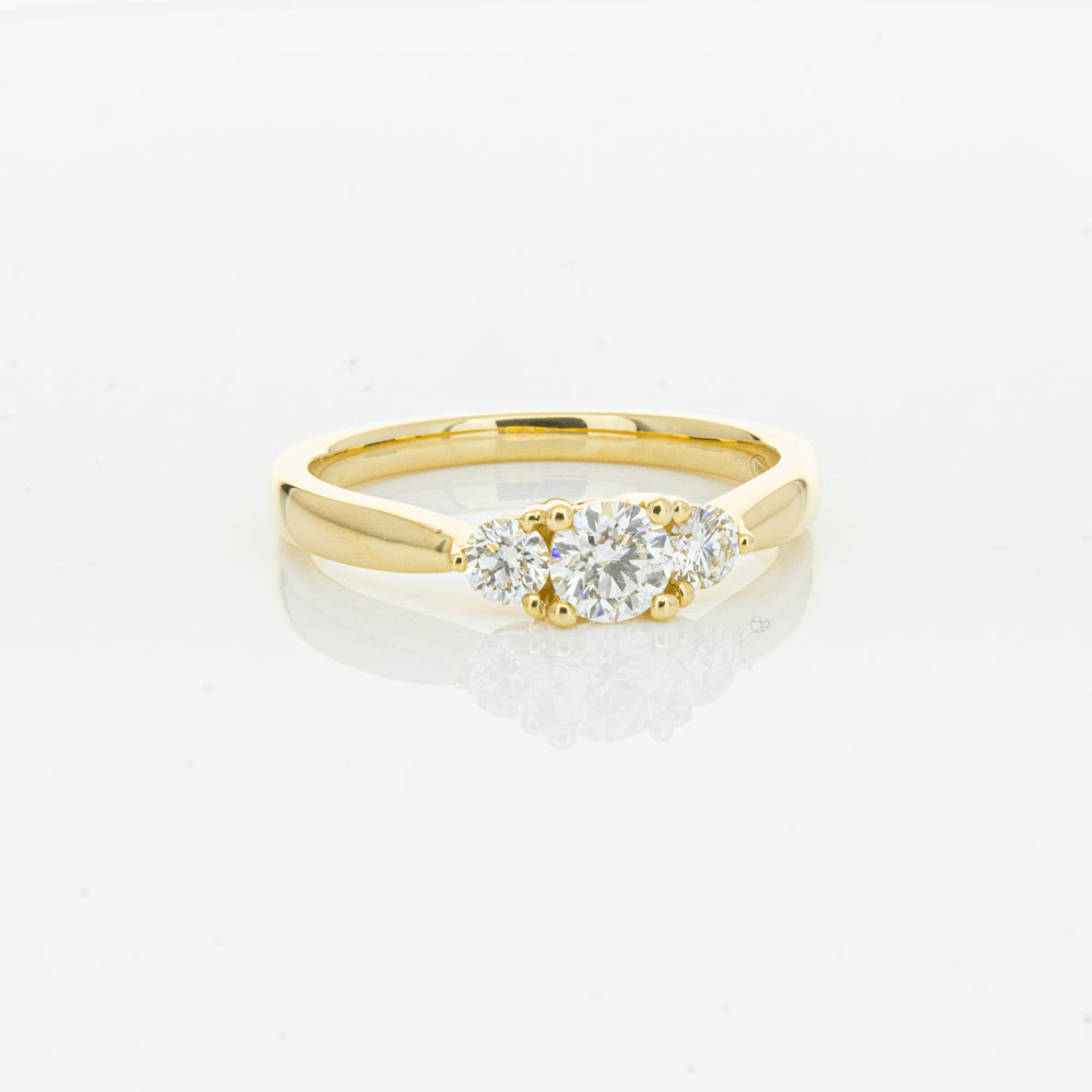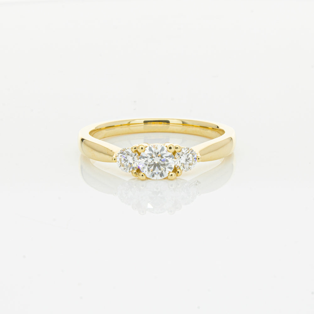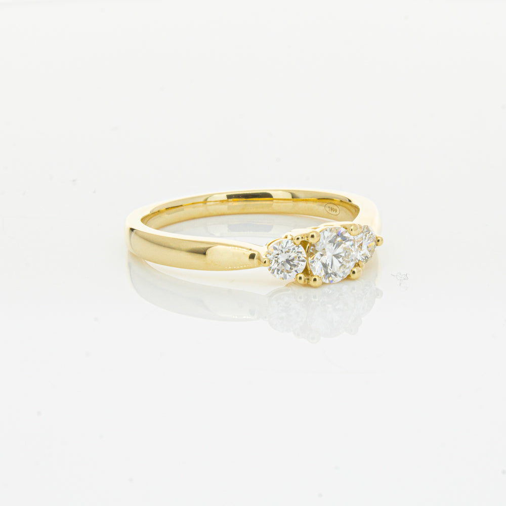 Symmetry is assured with harmoniously balanced accent diamonds highlighting an elevated centre diamond.