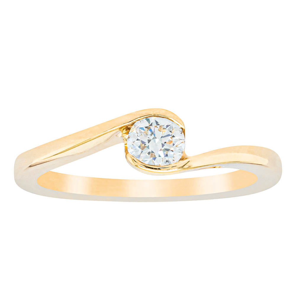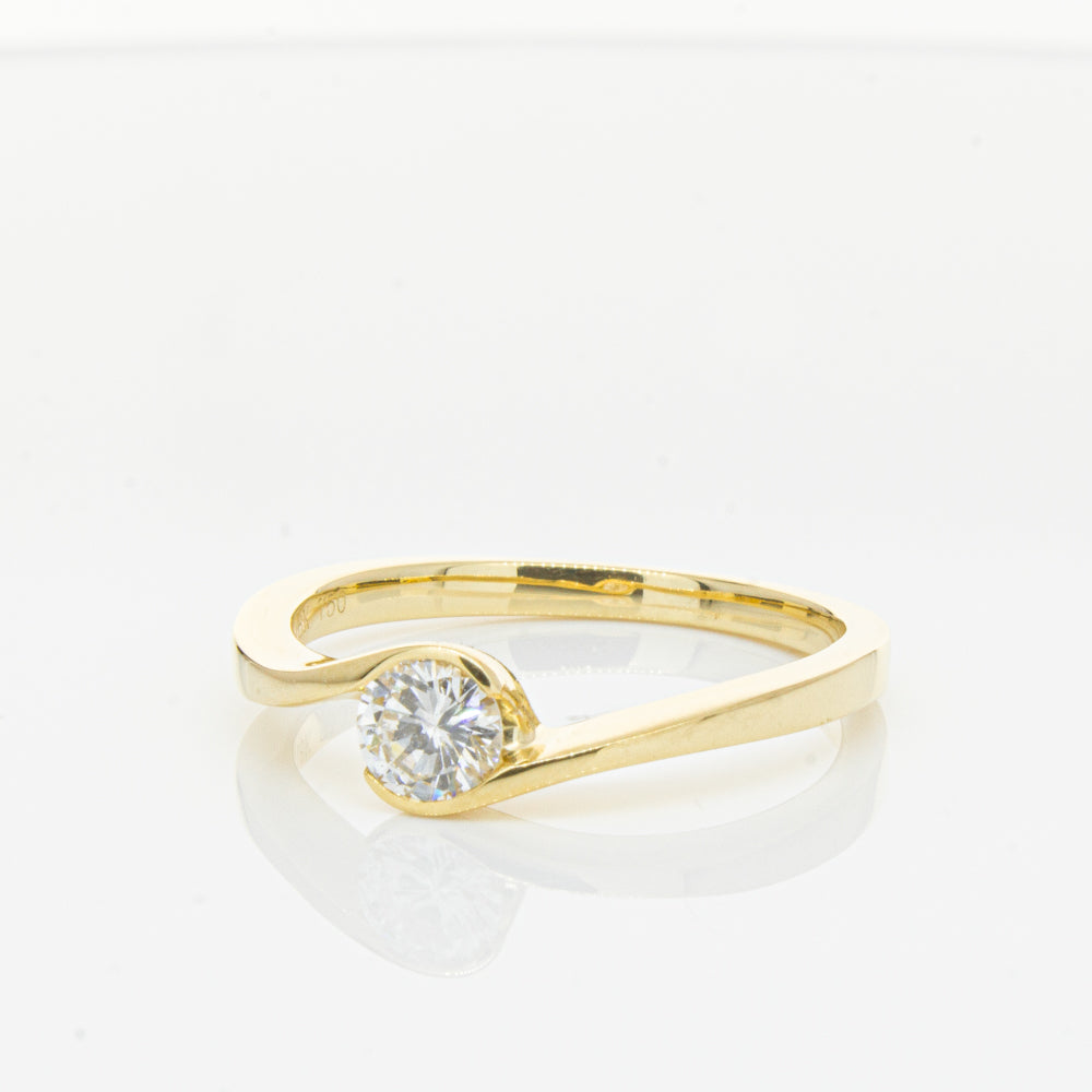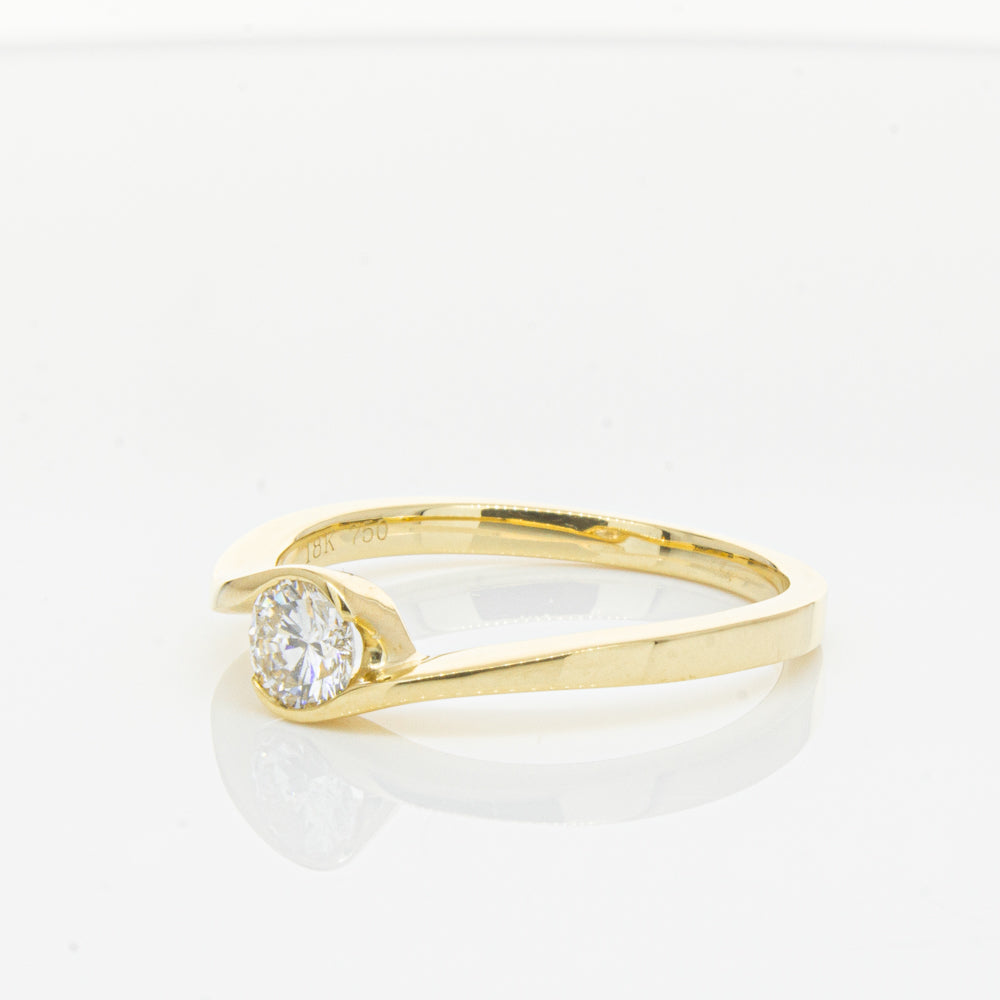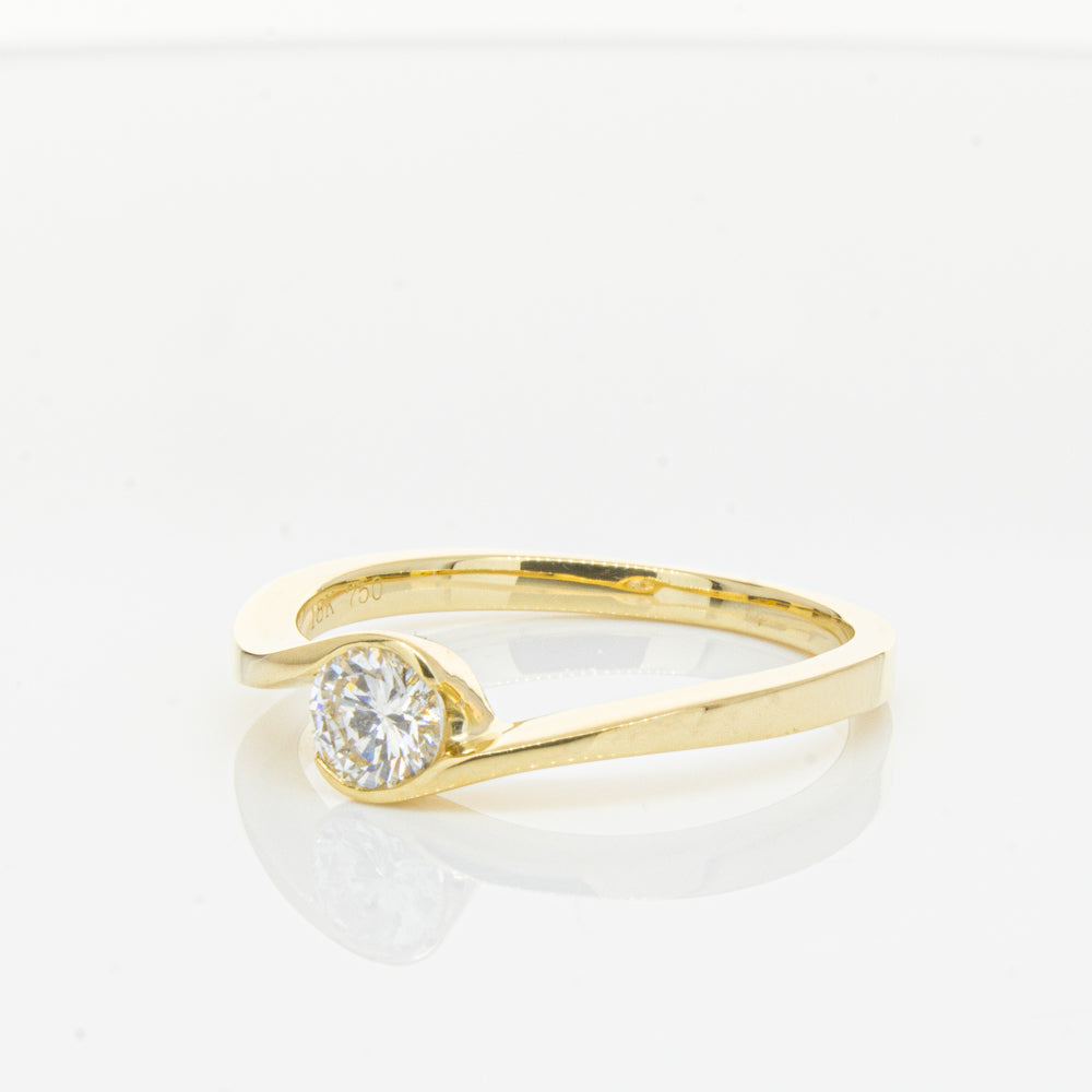 A unique solitaire style where the band embraces the sides of the diamond in a swirling motion. Crafted beautifully in 18ct yellow gold this piece boasts a stunning round brilliant cut .30ct centre diamond. Your eyes will light up when you see this beautiful ring!
