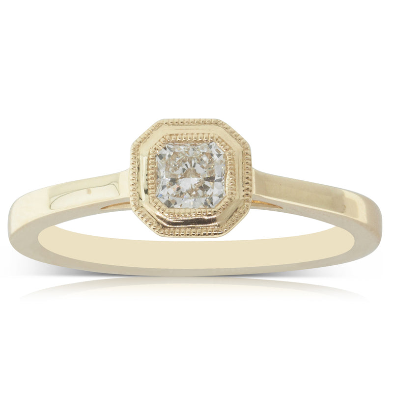 Surprise her with this dainty diamond solitaire ring. Crafted beautifully in 18ct yellow gold this classic piece features an octagonal head with a millgrain set radiant cut diamond. Complete with flow up shoulders to complete a vision of elegance this piece is sure to sweep her off her feet.