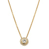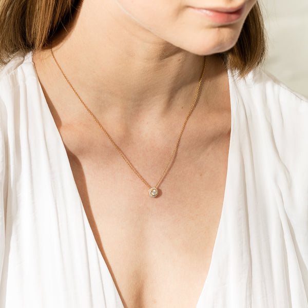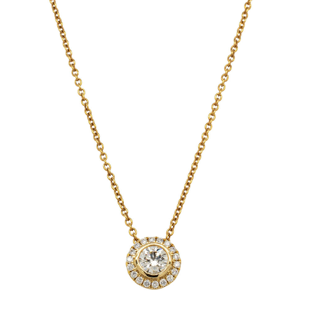 Isla - a favourite from our signature 1899 collection. Elegant in every way, this diamond pendant features a single round brilliant cut diamond framed by eighteen bead set diamonds in 18ct yellow gold.