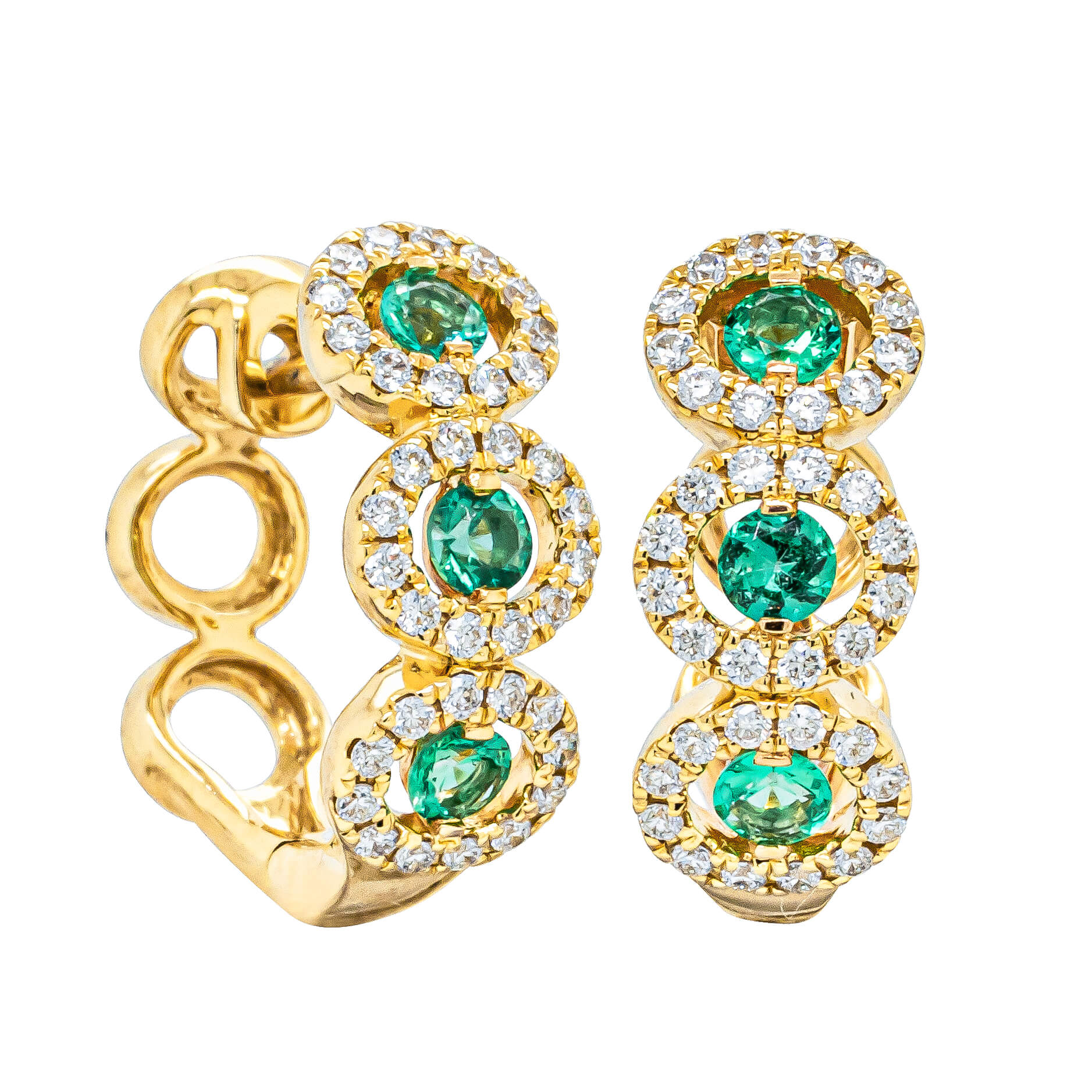 You will absolutely glow in these beautiful emerald and diamond hoop earrings crafted in luxurious 18ct yellow gold. Boasting round faceted emeralds and twinkling round brilliant cut diamonds, these are the perfect earrings to spoil yourself with!