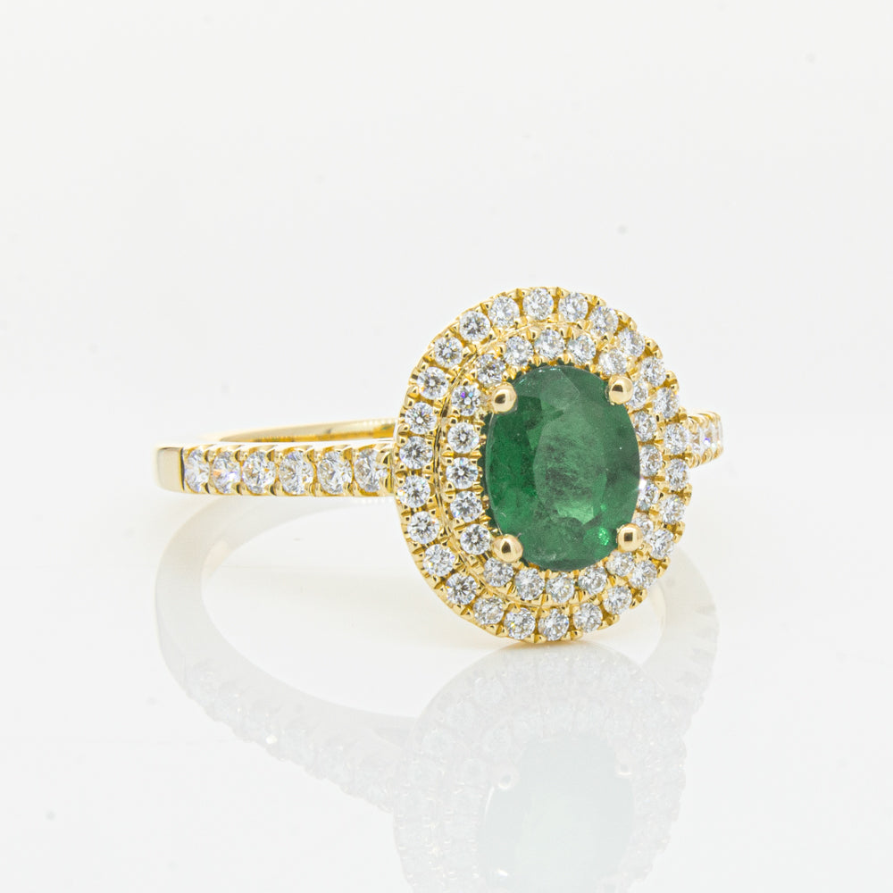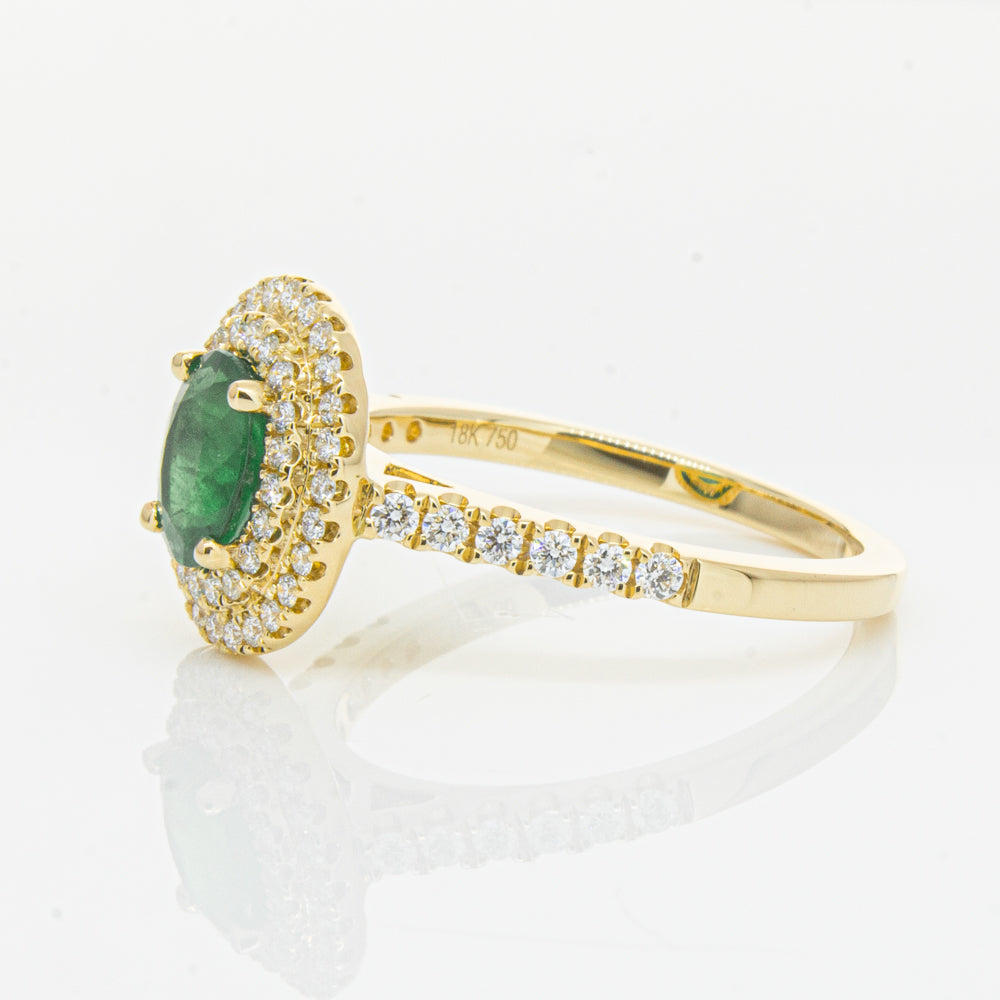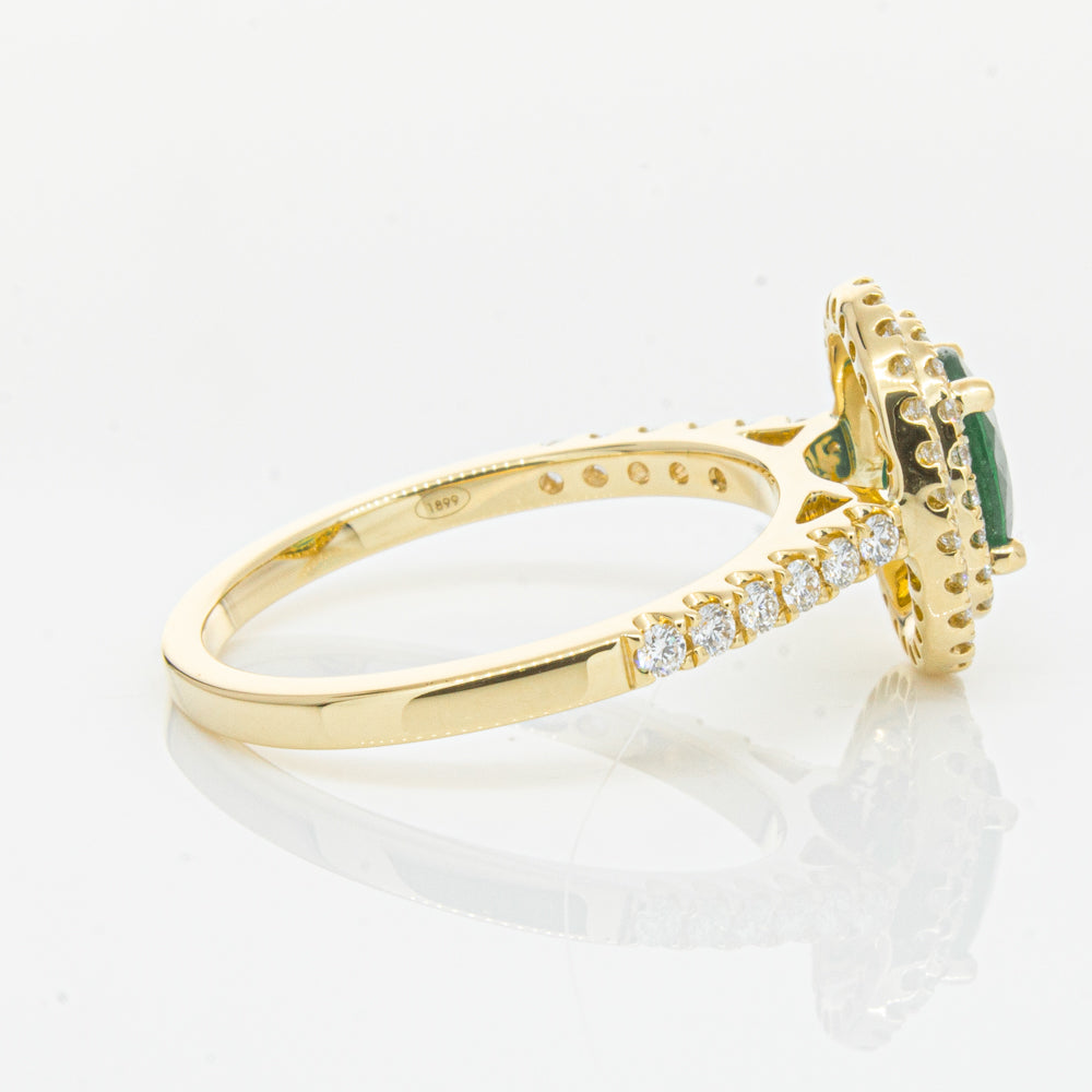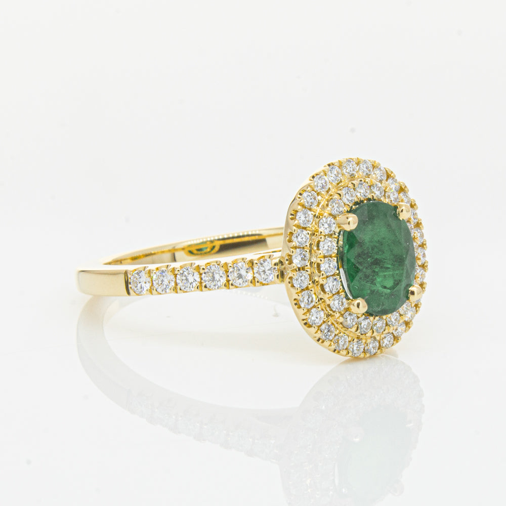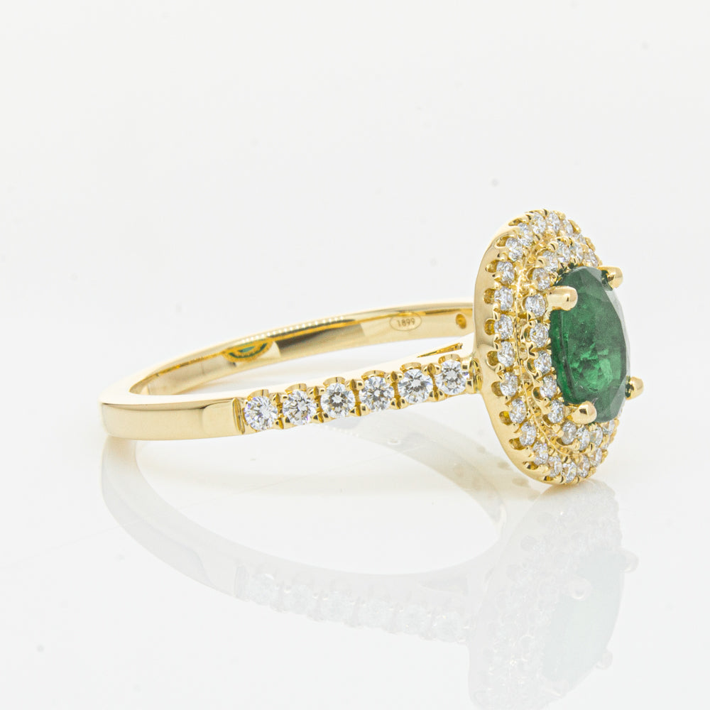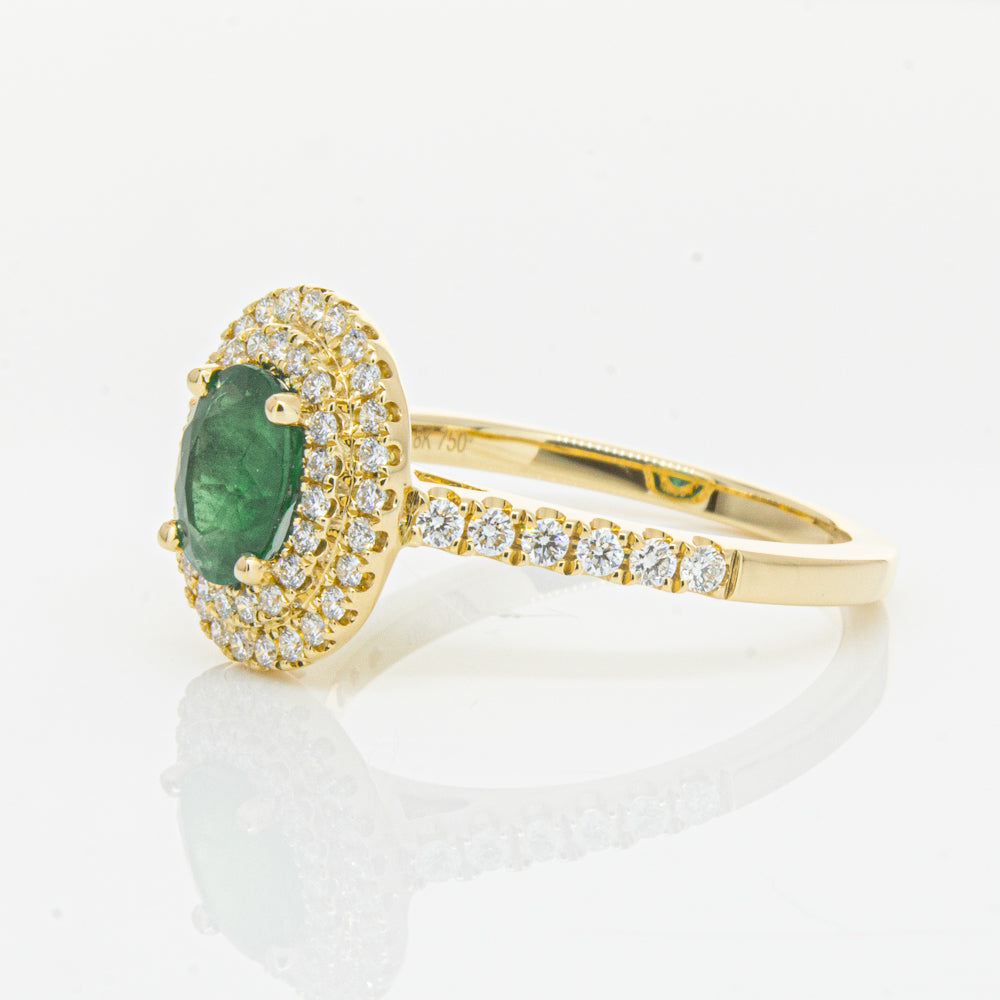 Crafted carefully from divine 18ct yellow gold, this precious ring boasts one oval faceted emerald framed by a dazzling diamond halo and diamond set shoulders. Pure elegance!