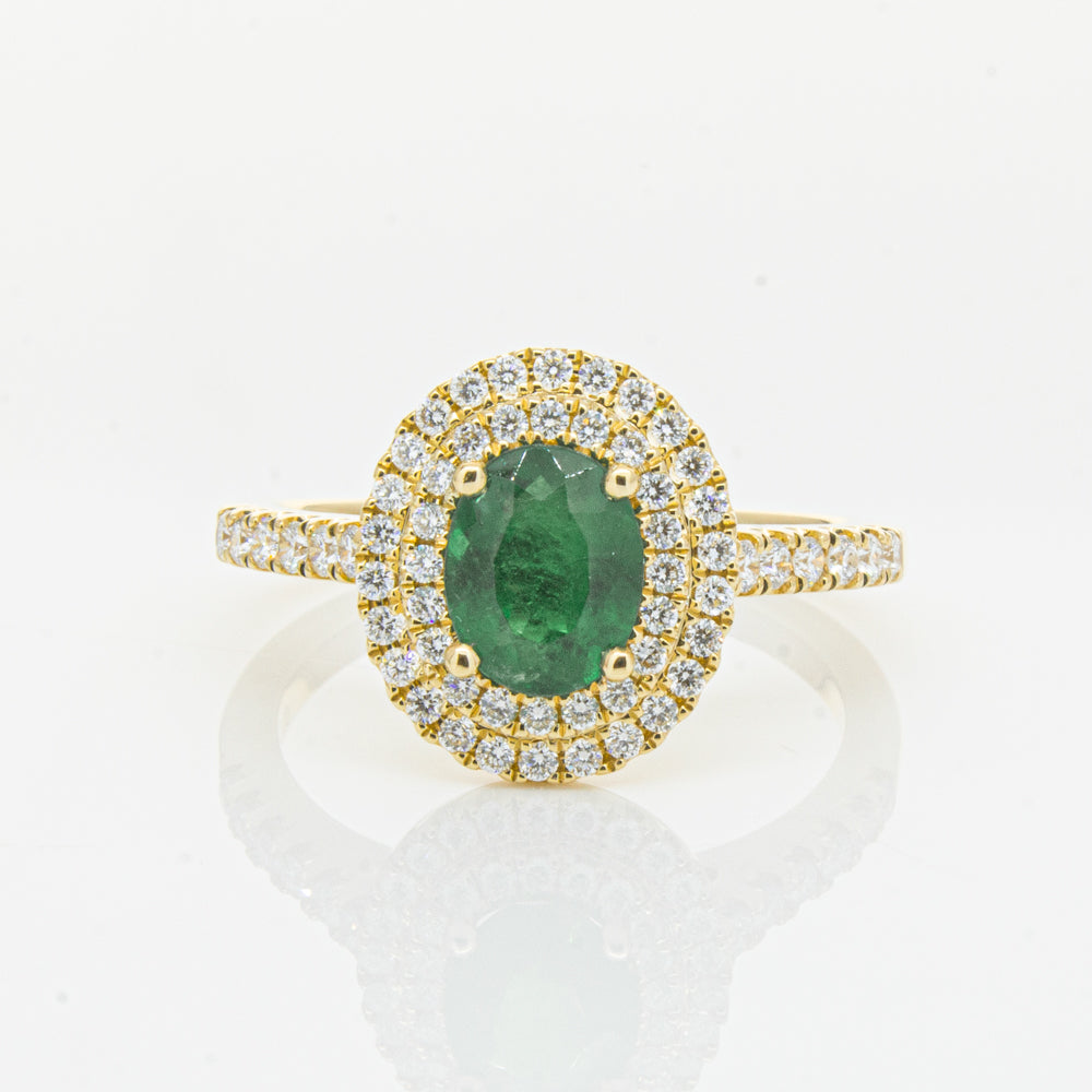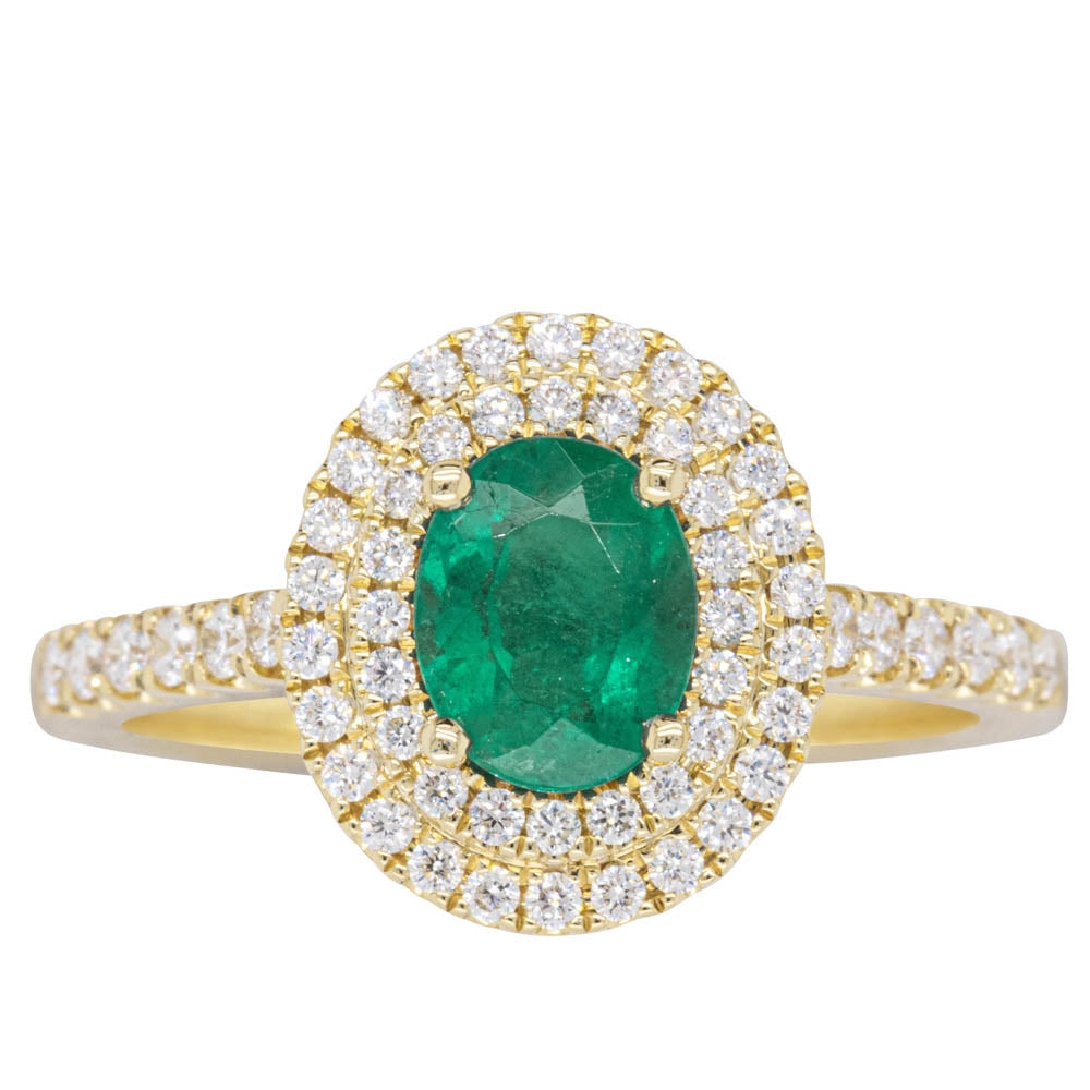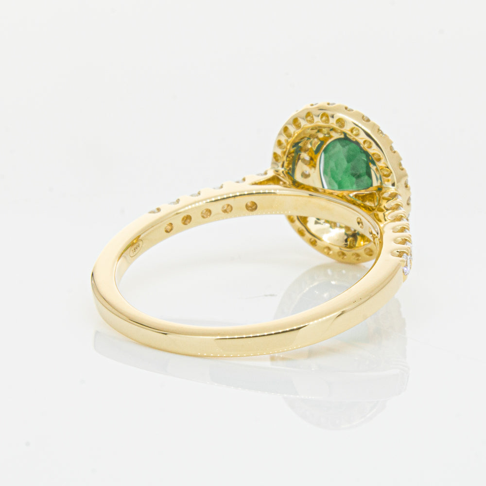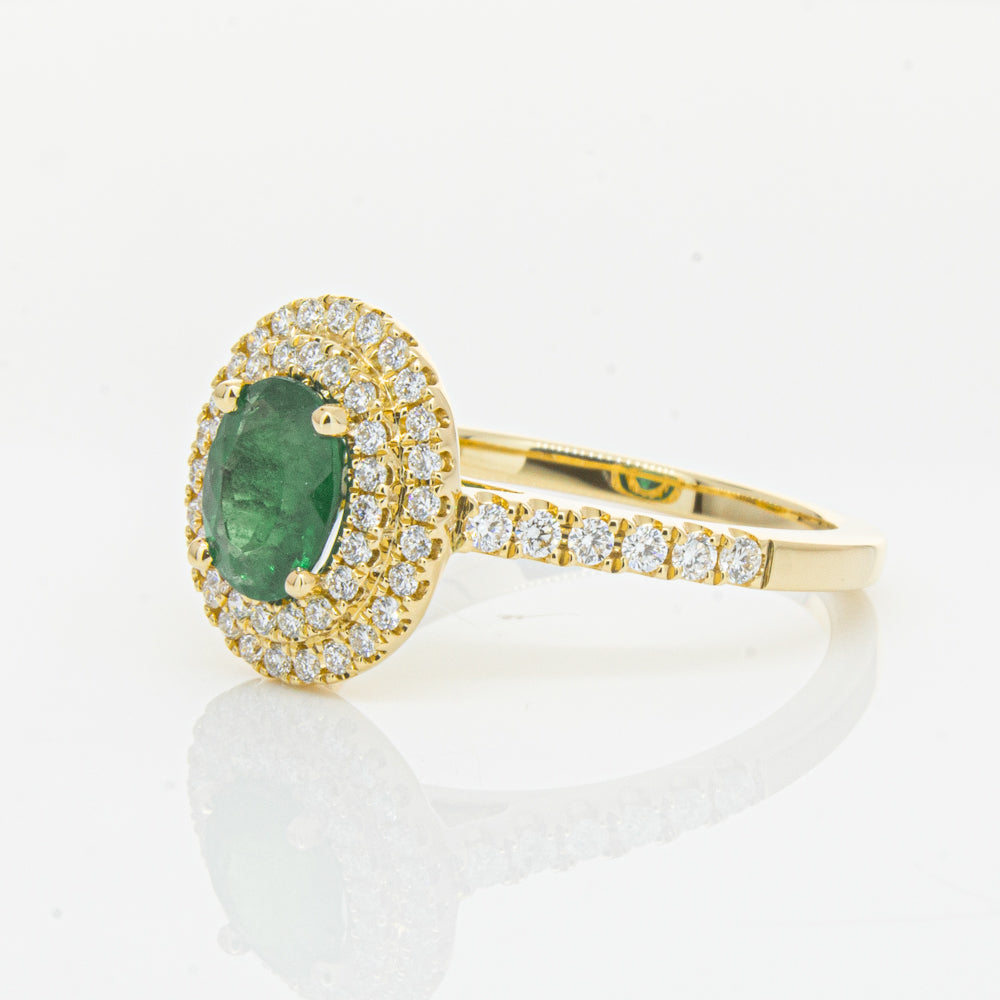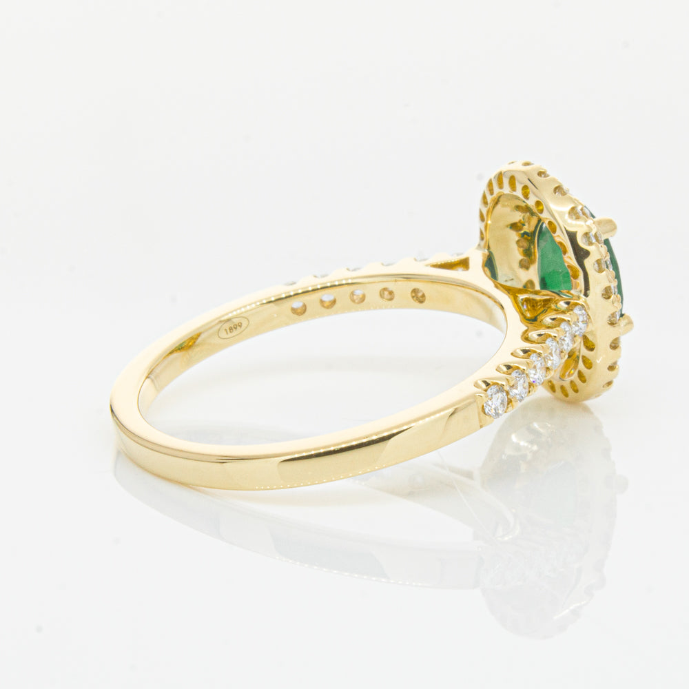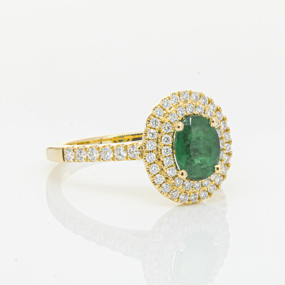 Crafted carefully from divine 18ct yellow gold, this precious ring boasts one oval faceted emerald framed by a dazzling diamond halo and diamond set shoulders. Pure elegance!