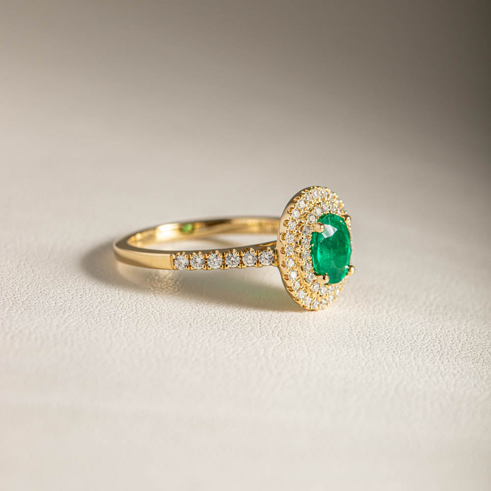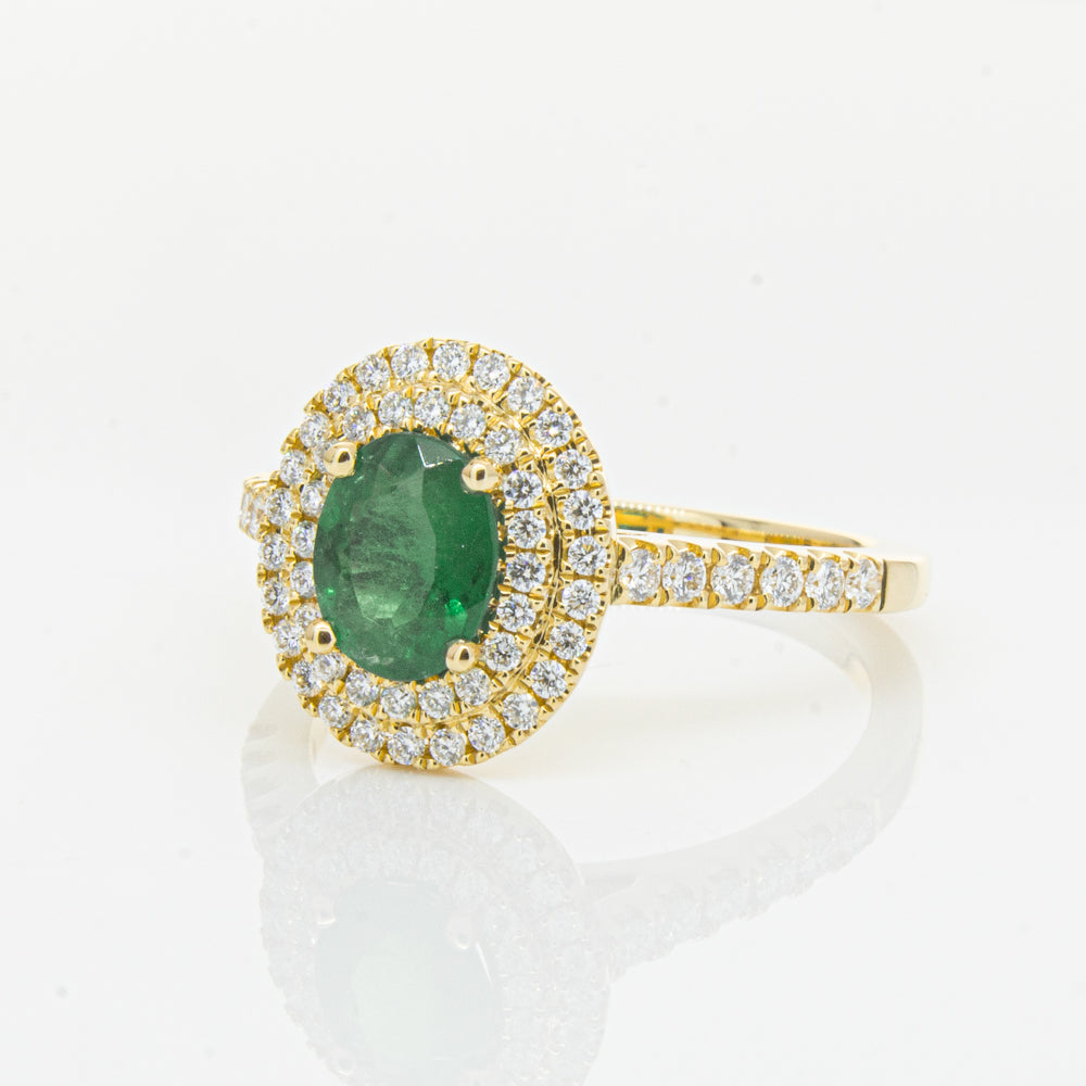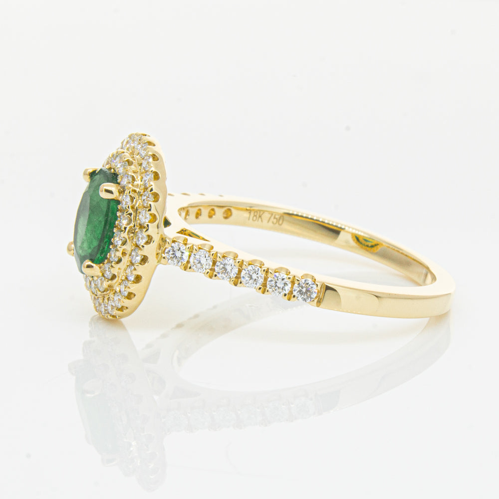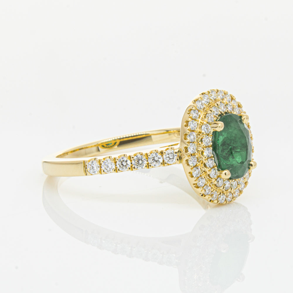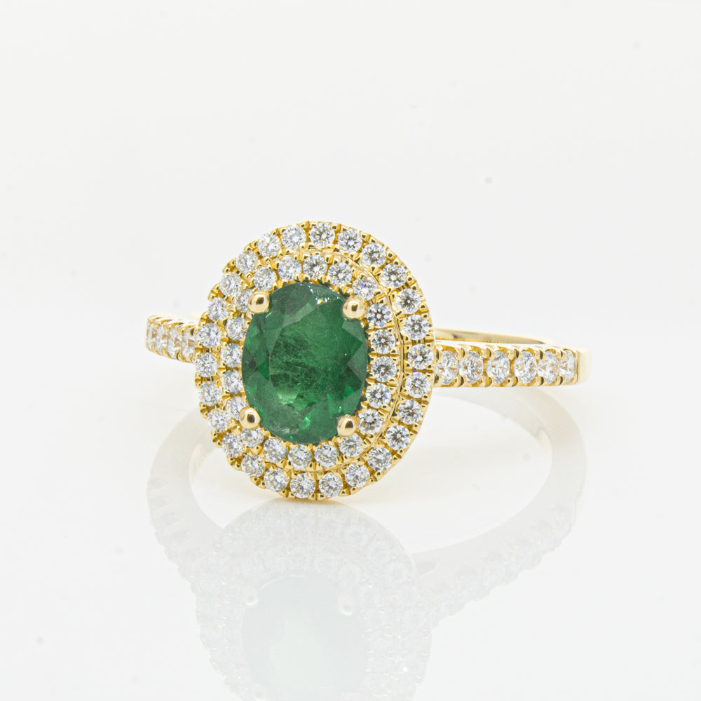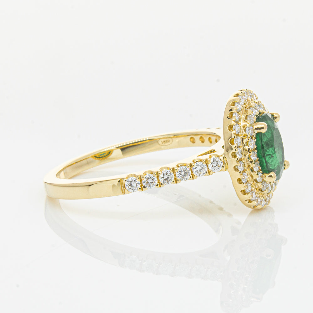 Crafted carefully from divine 18ct yellow gold, this precious ring boasts one oval faceted emerald framed by a dazzling diamond halo and diamond set shoulders. Pure elegance!