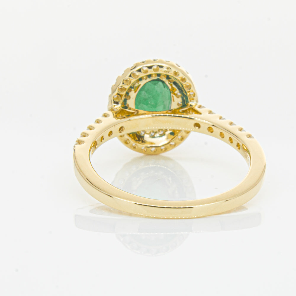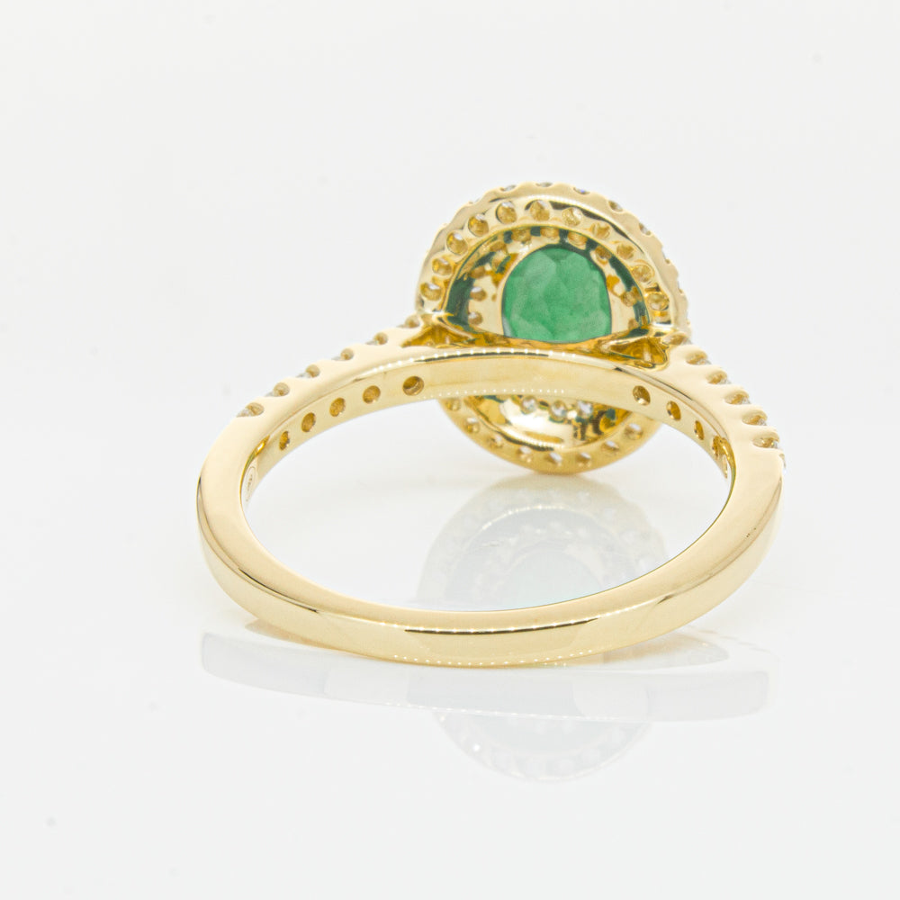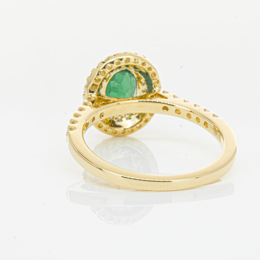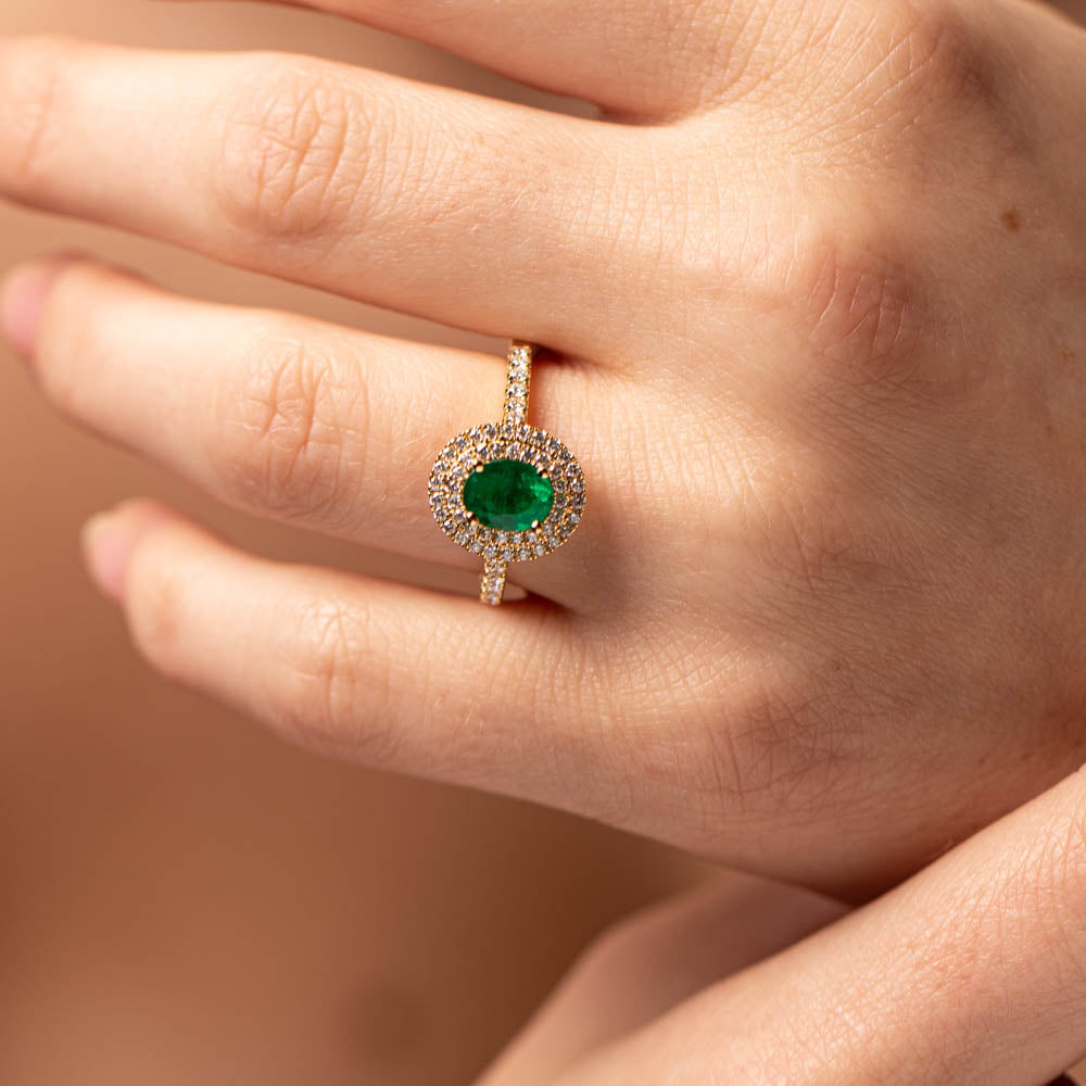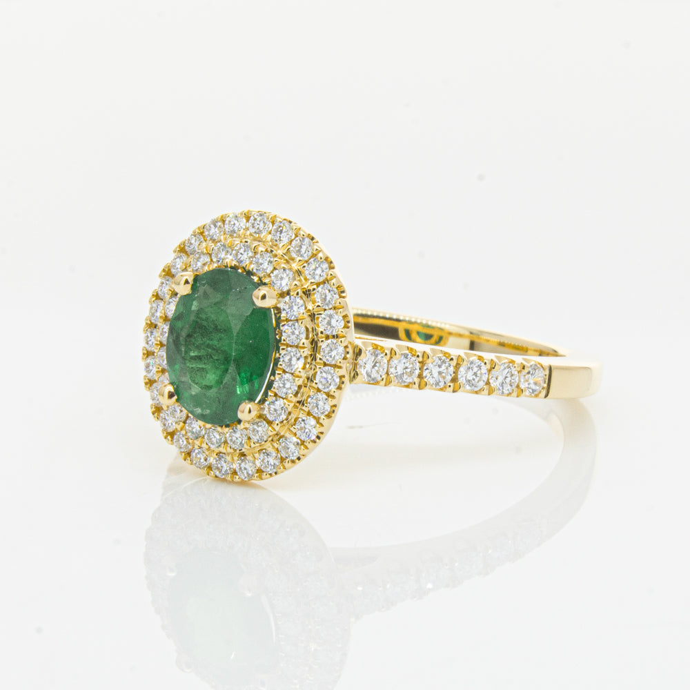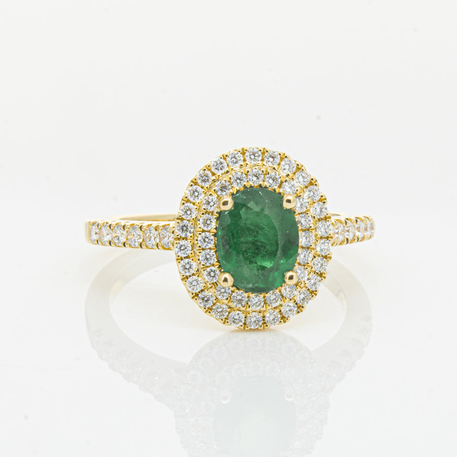 Crafted carefully from divine 18ct yellow gold, this precious ring boasts one oval faceted emerald framed by a dazzling diamond halo and diamond set shoulders. Pure elegance!