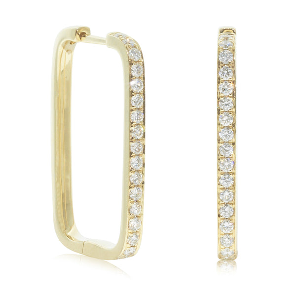 Sparkling and striking! These sleek 18ct yellow gold rectangular hoop earrings feature shimmering round brilliant cut claw set diamonds that glisten from each and every angle. You will be the envy of everyone in these beauties!