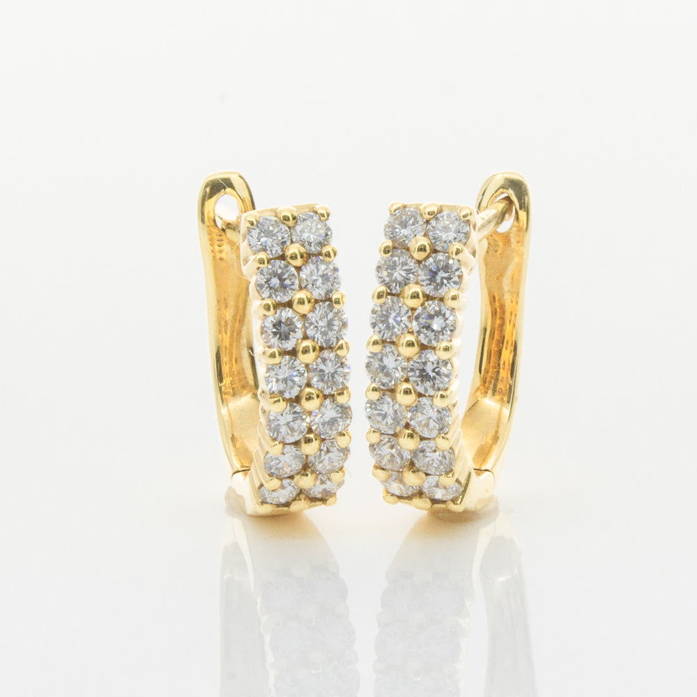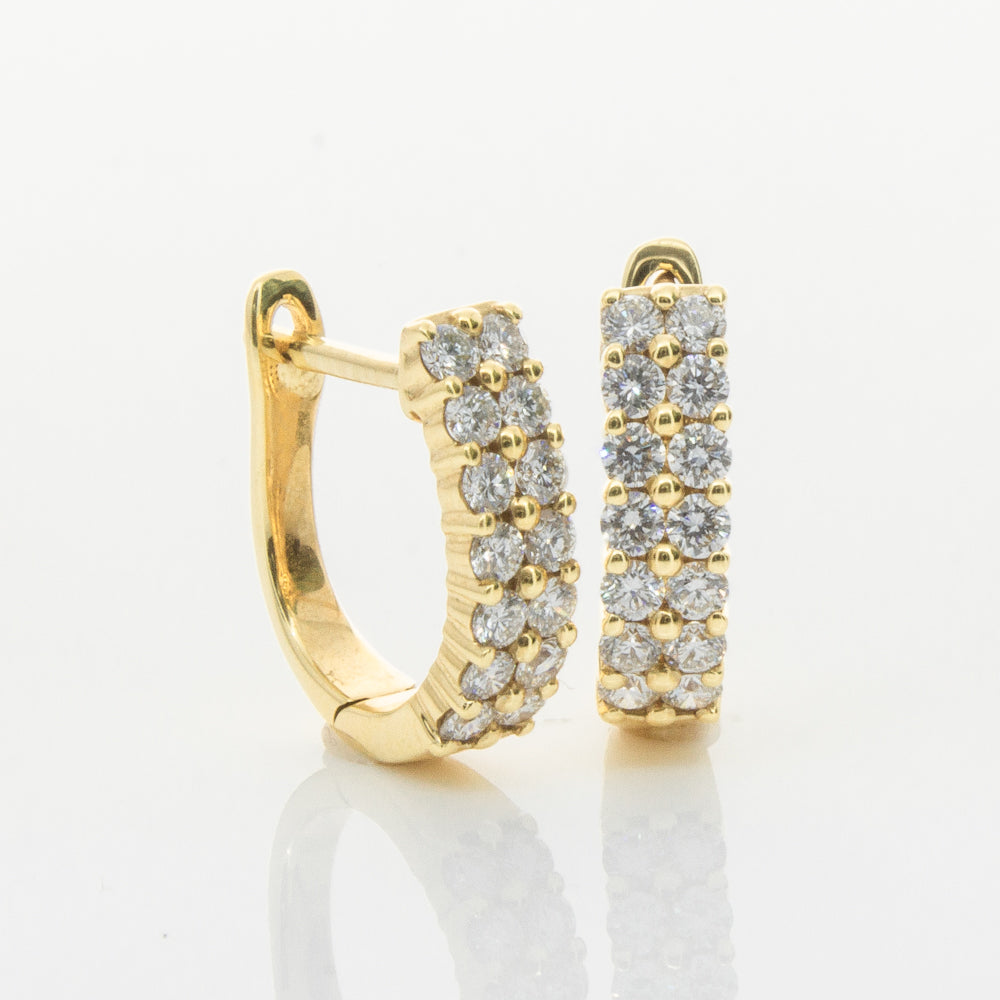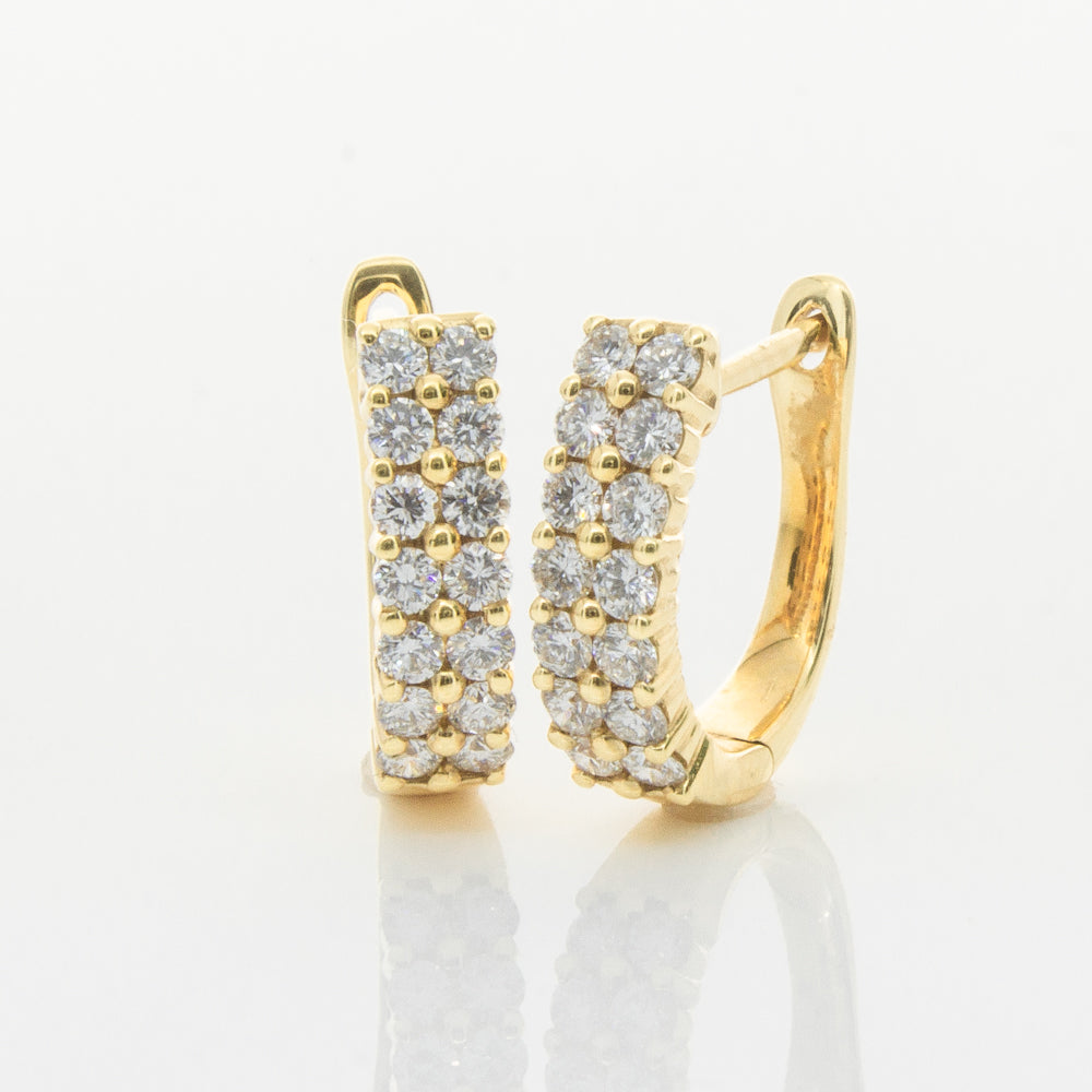 Scintillating and sparkling - these earrings are the perfect gift. These 18ct yellow gold hinged hoop earrings feature a double row of glittering round brilliant cut diamonds.