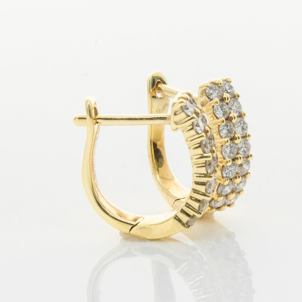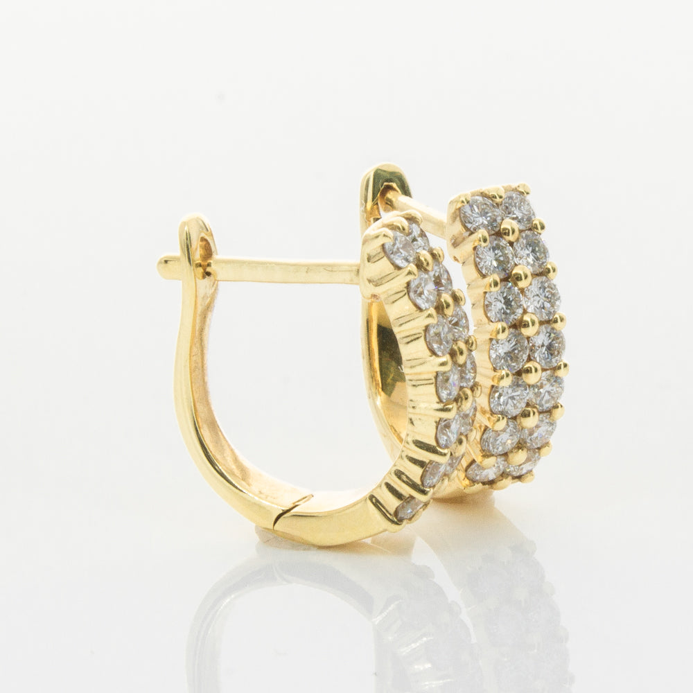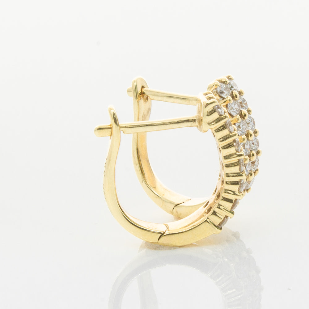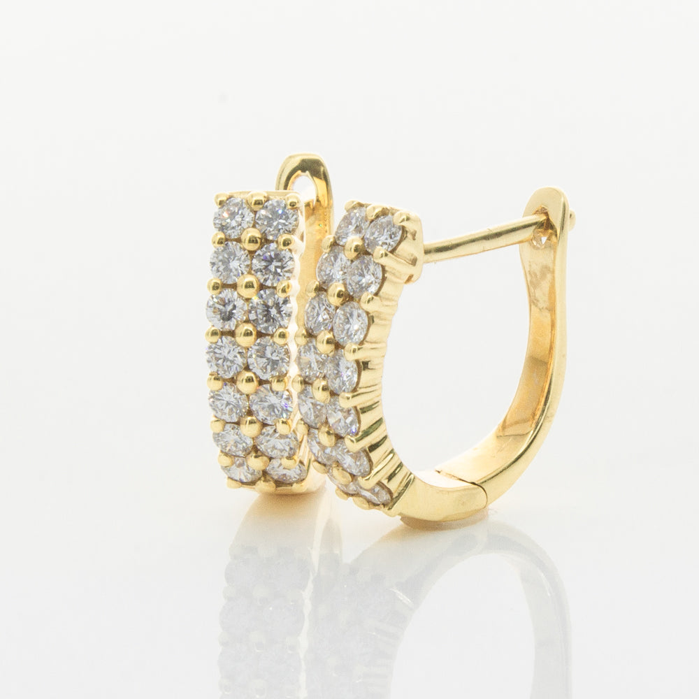 Scintillating and sparkling - these earrings are the perfect gift. These 18ct yellow gold hinged hoop earrings feature a double row of glittering round brilliant cut diamonds.