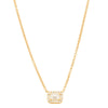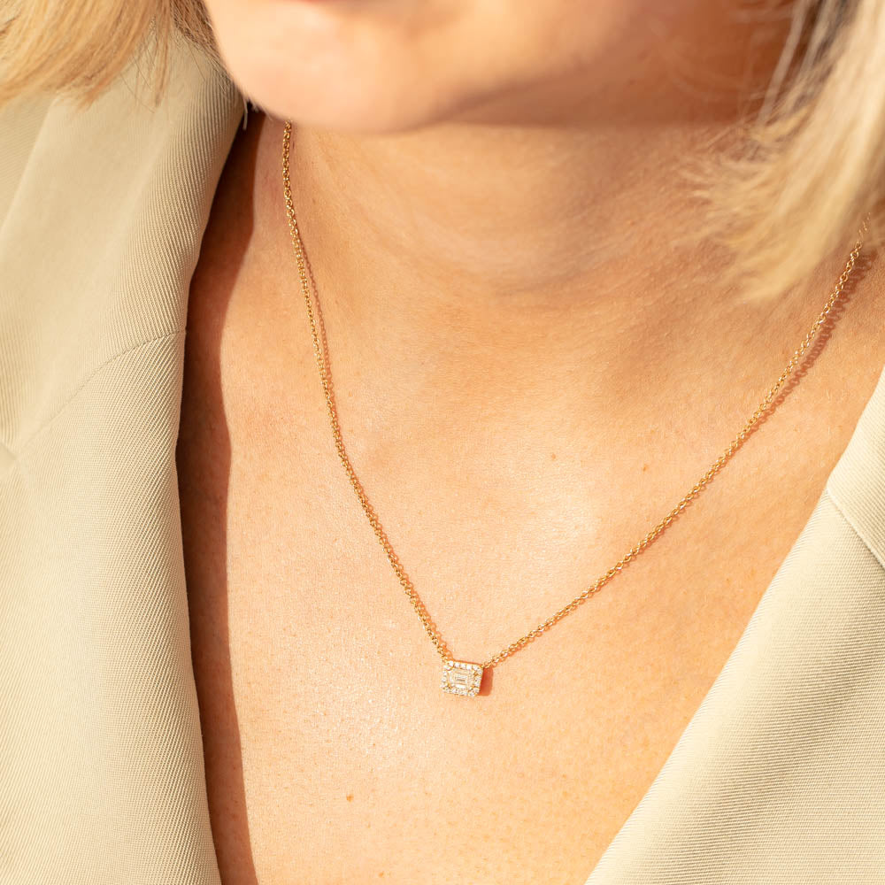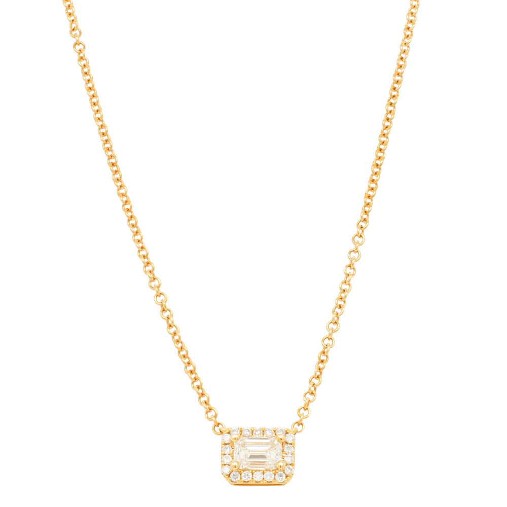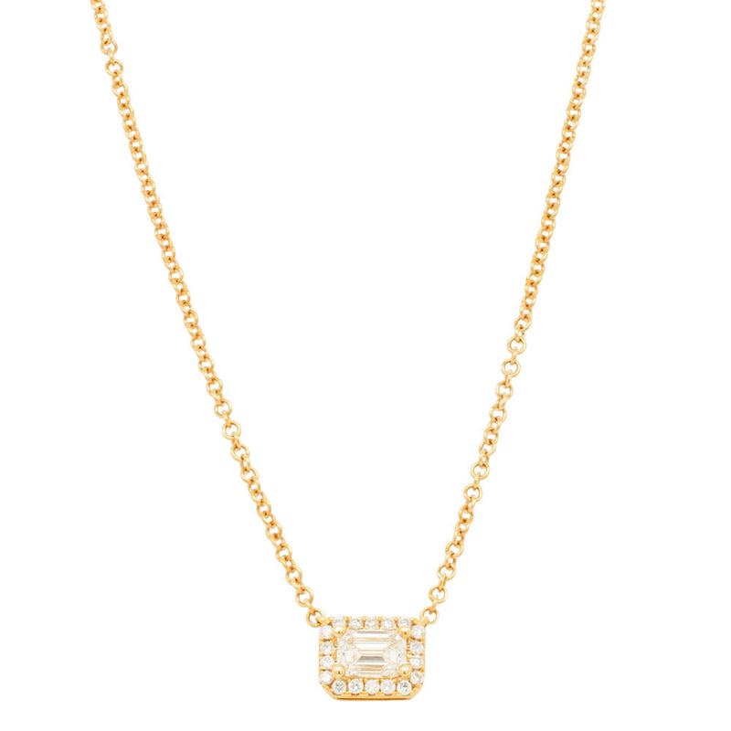 18ct yellow gold necklace boasts one emerald cut .51ct diamond surrounded by a reflective diamond halo.