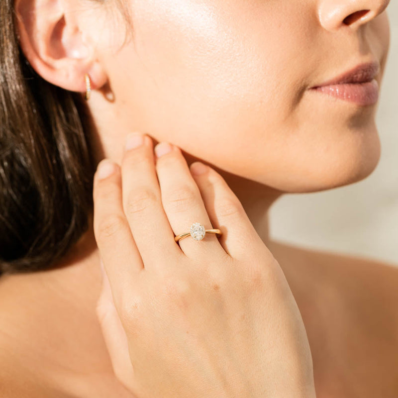 For the one who brings grace and sophistication into every room they enter, our Nina engagement ring from our signature 1899 collection features a oval brilliant cut diamond crowned with a halo of round brilliant cut diamonds, creating a delicate harmony of elegance and imagination all along this beautiful ring crafted in 18ct yellow gold.