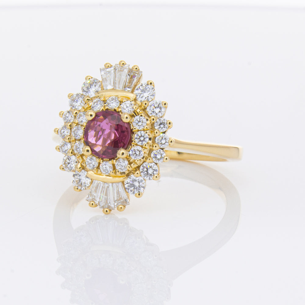 Encircling the vibrant ruby are dazzling round and taper cut diamonds, meticulously arranged to enhance the stone's natural allure. These diamonds, with their sleek and elongated shape, add a modern twist to the classic design, creating a harmonious blend of tradition and contemporary flair.
