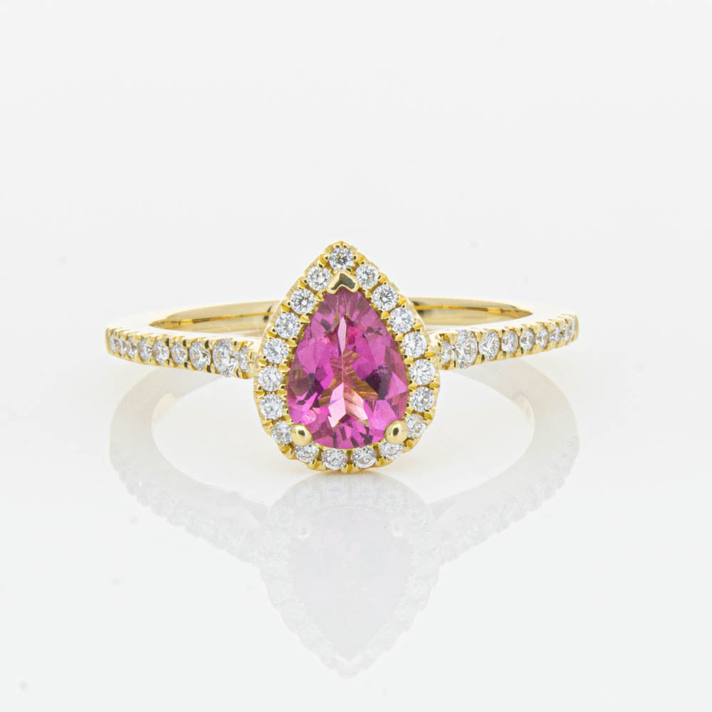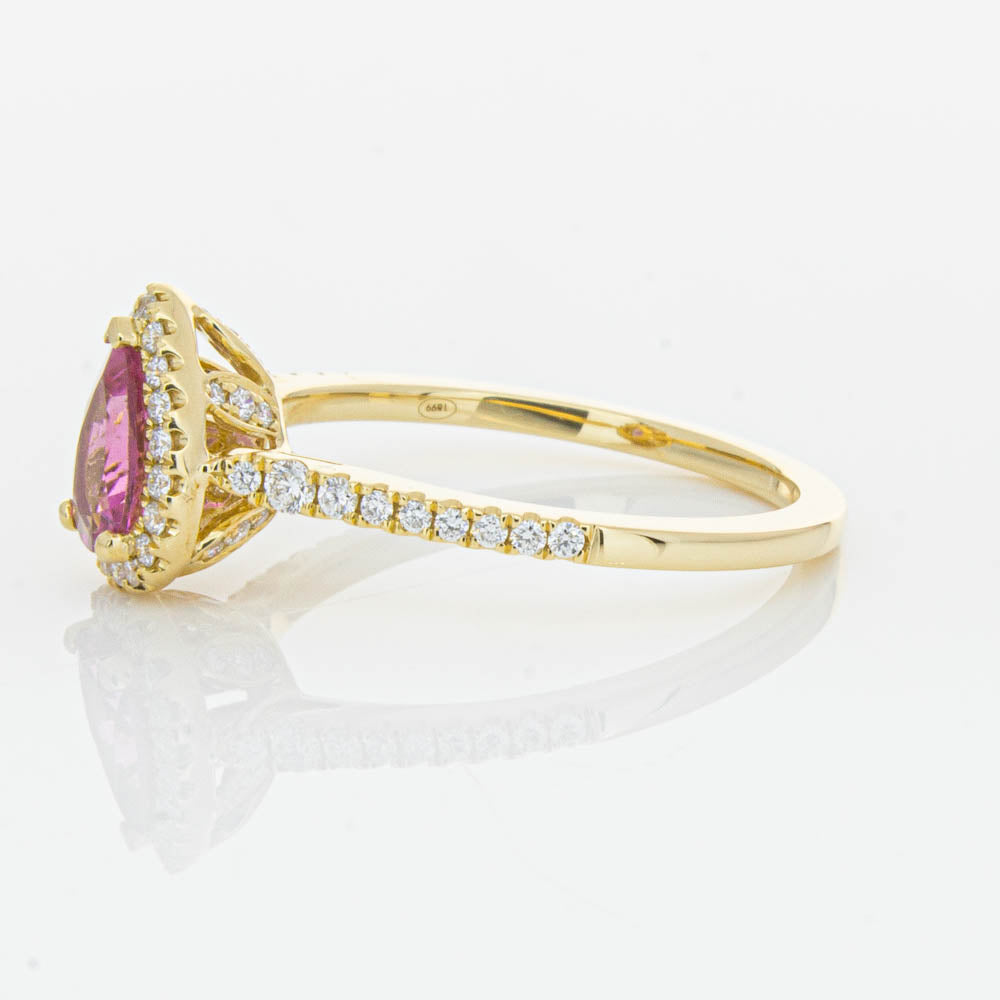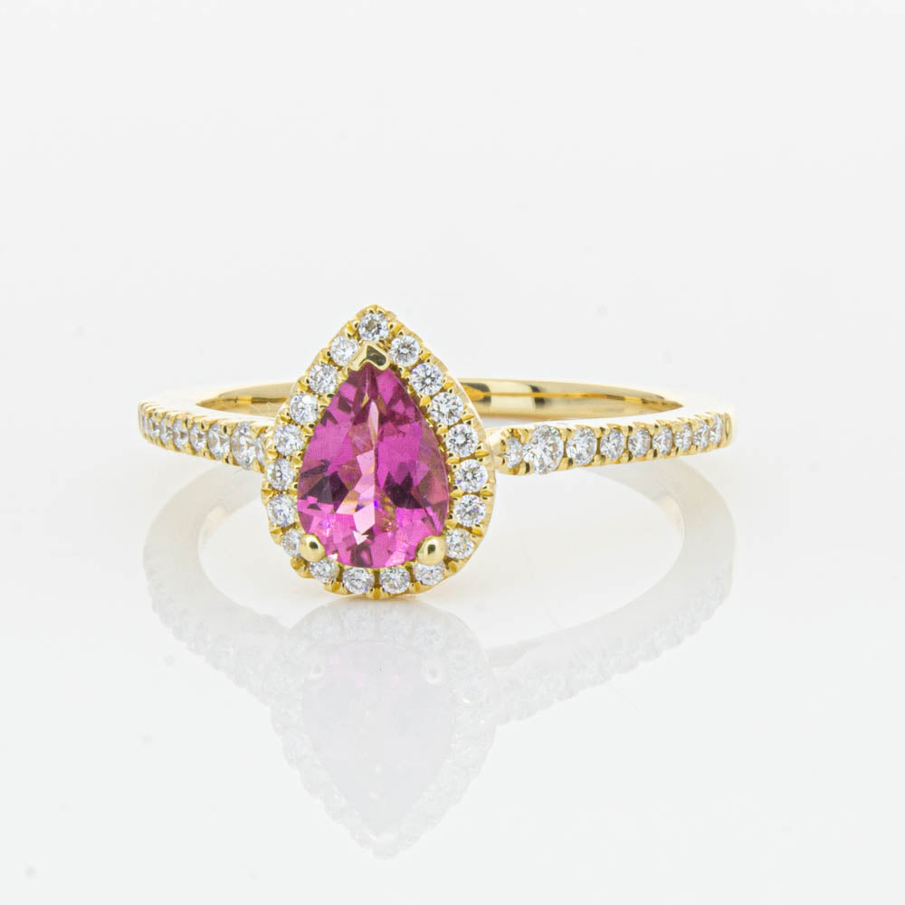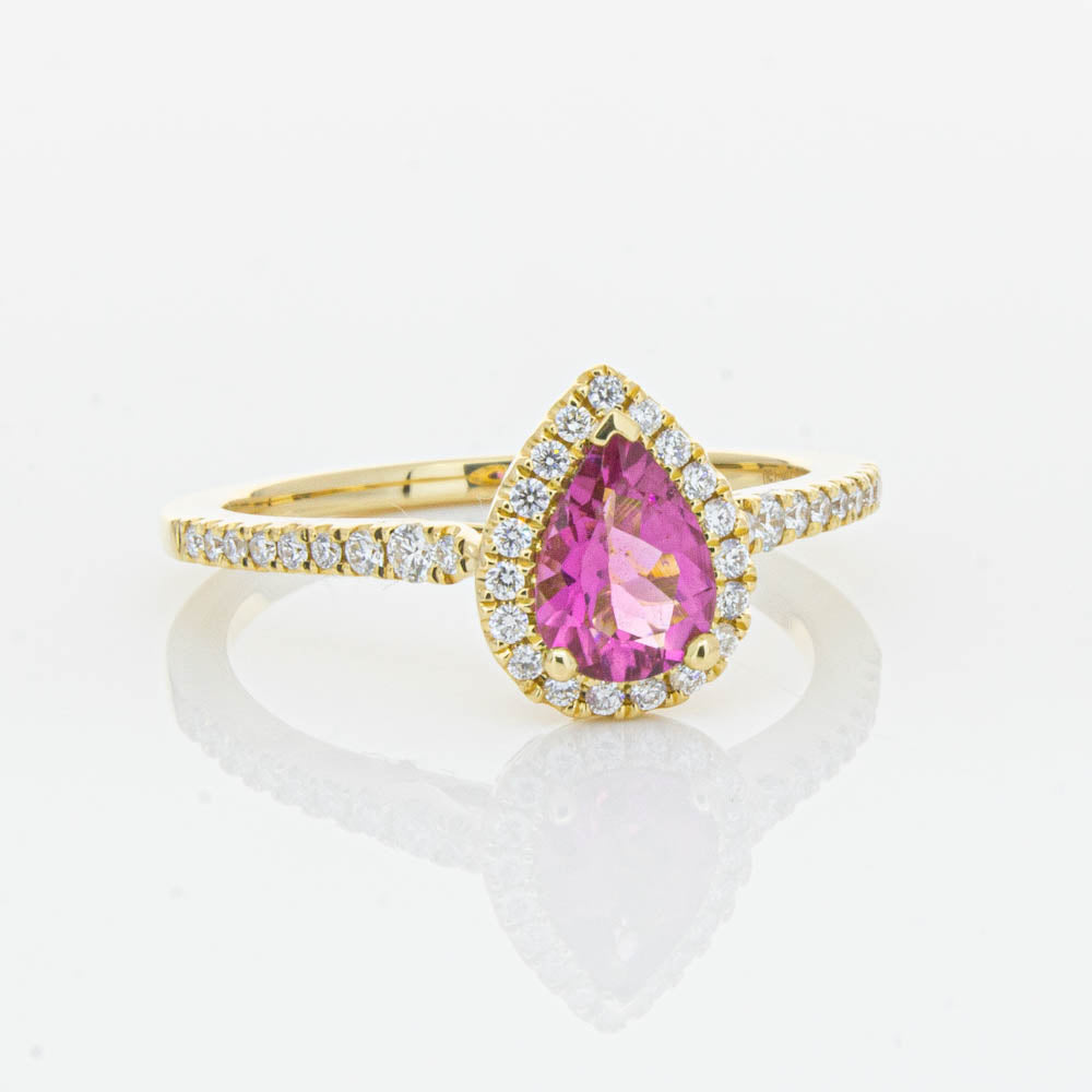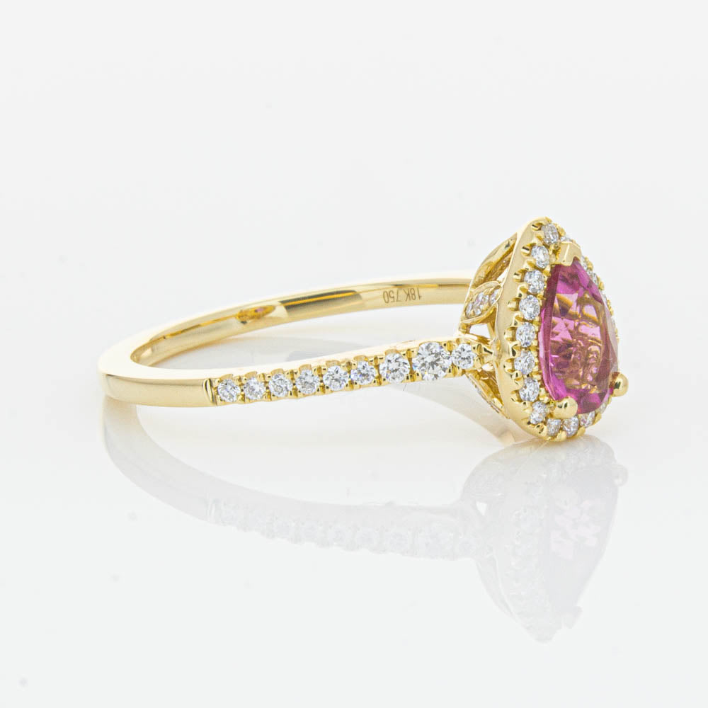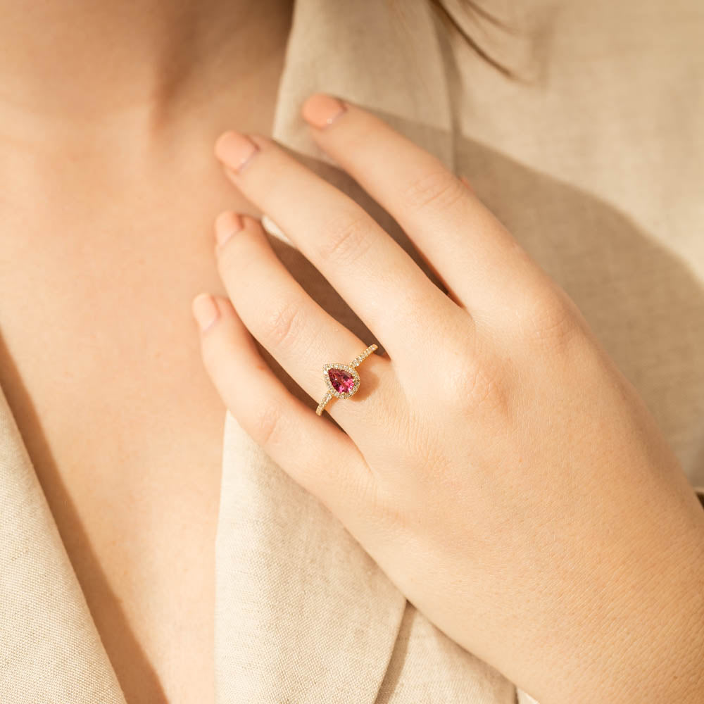 A pear faceted pink tourmaline sourced from Africa sparkles with bright pink hues and is enlivened with a halo of round brilliant cut diamonds to create a stunning and luminous effect in this gorgeous mini Sierra ring from our signature 1899 collection. Crafted in beautiful 18ct yellow gold.