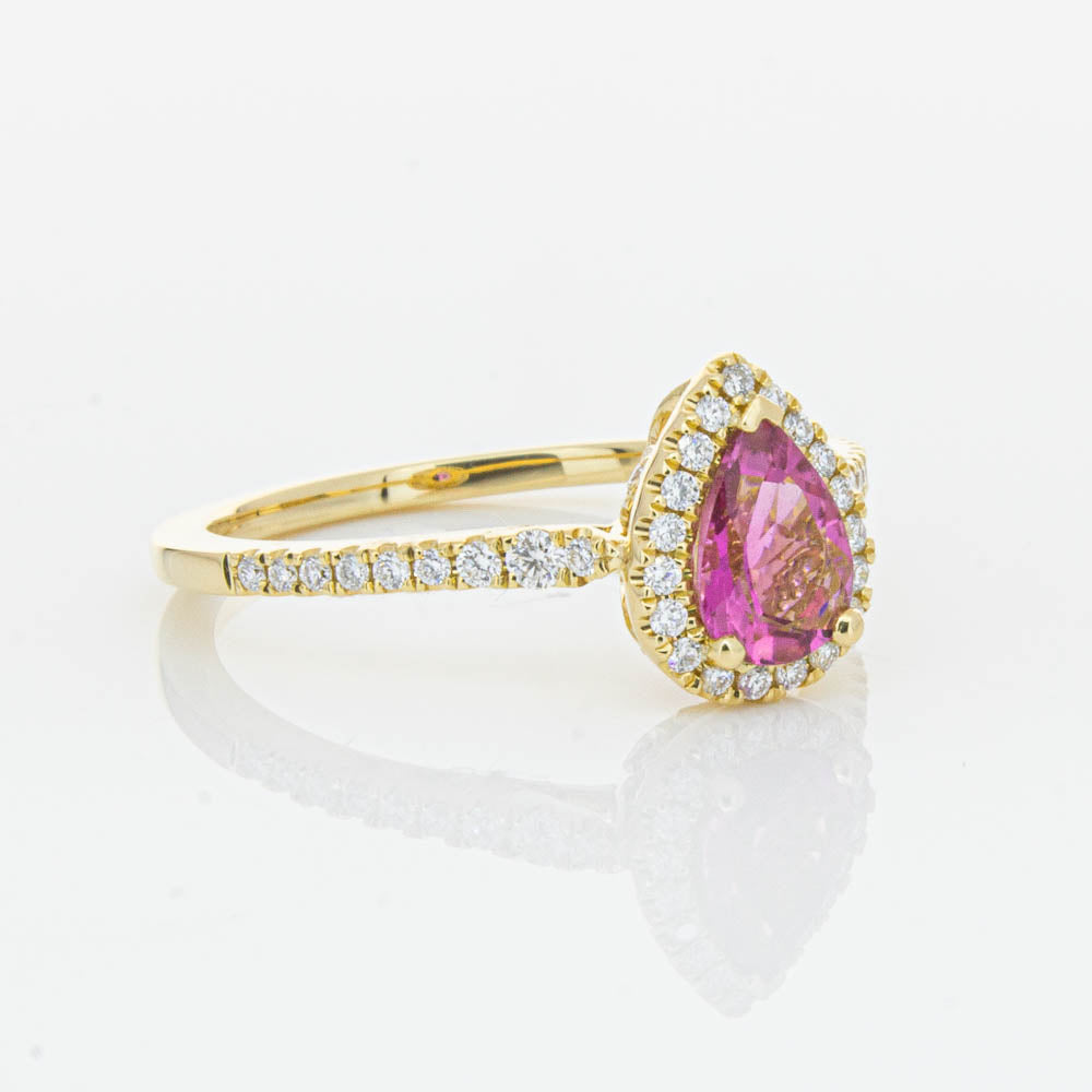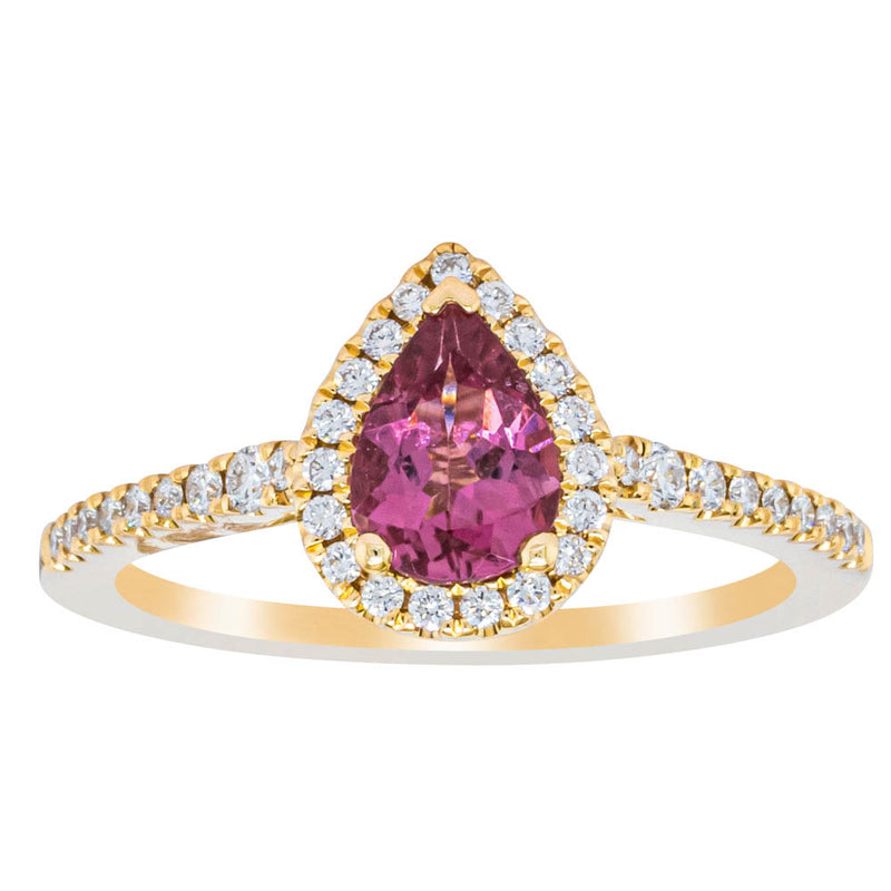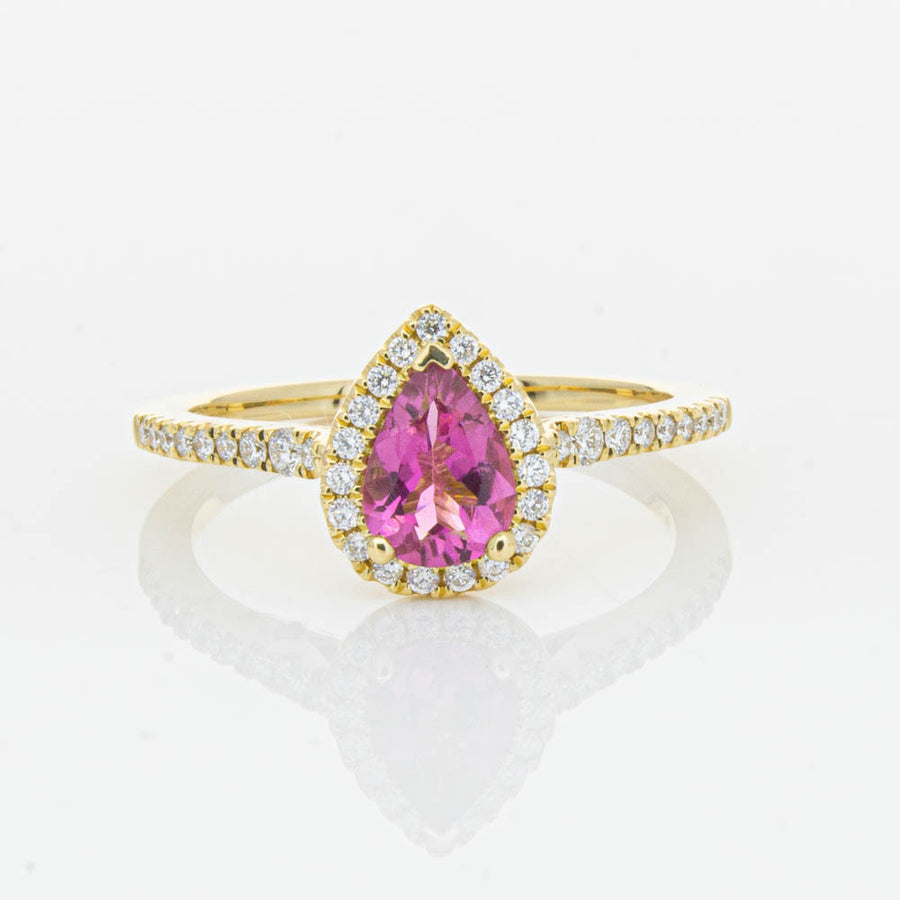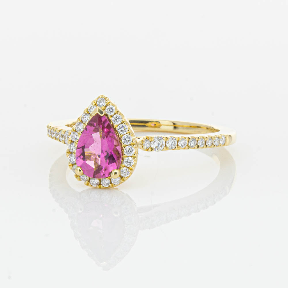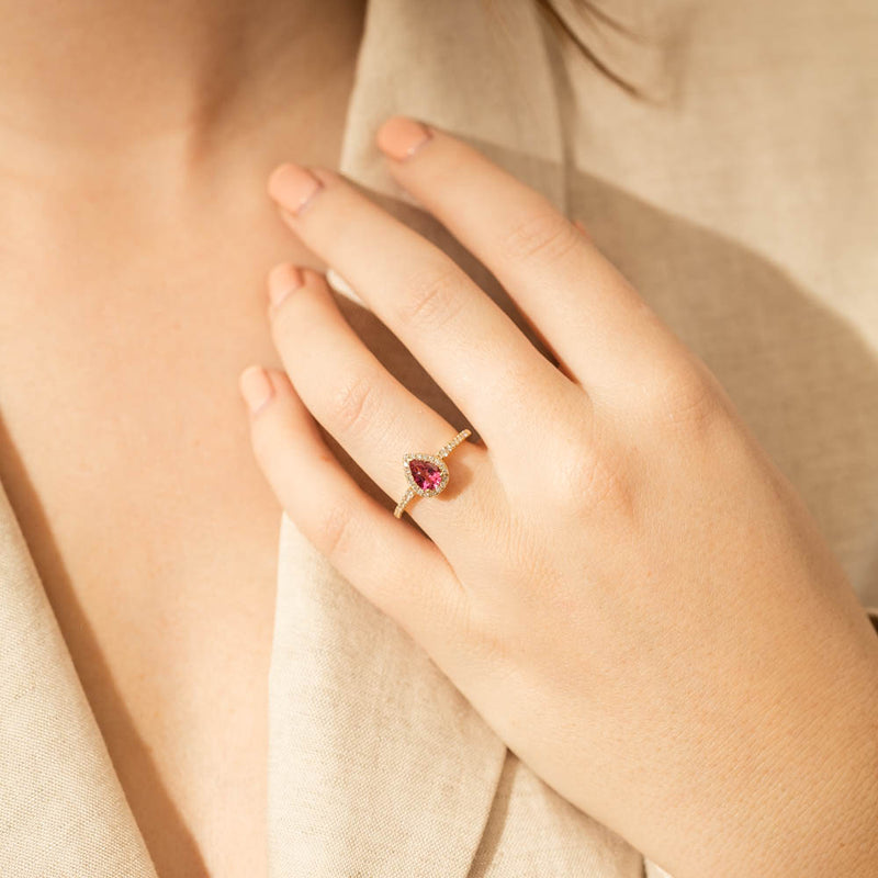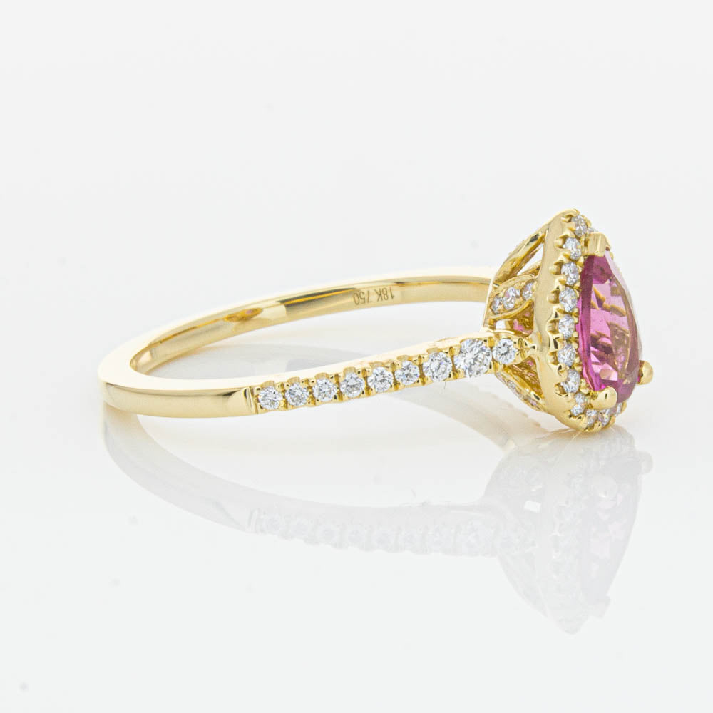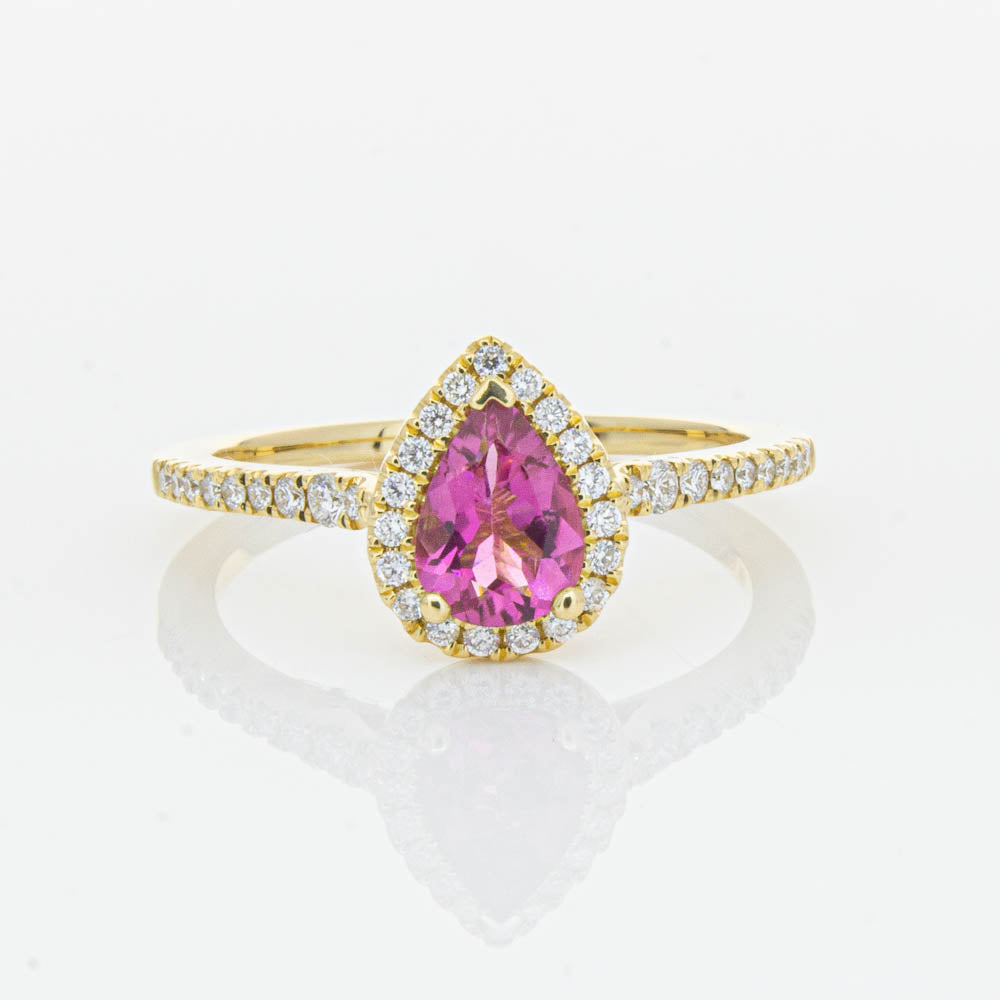 A pear faceted pink tourmaline sourced from Africa sparkles with bright pink hues and is enlivened with a halo of round brilliant cut diamonds to create a stunning and luminous effect in this gorgeous mini Sierra ring from our signature 1899 collection. Crafted in beautiful 18ct yellow gold.
