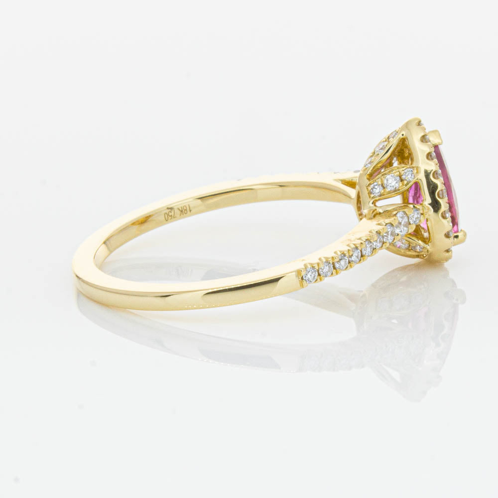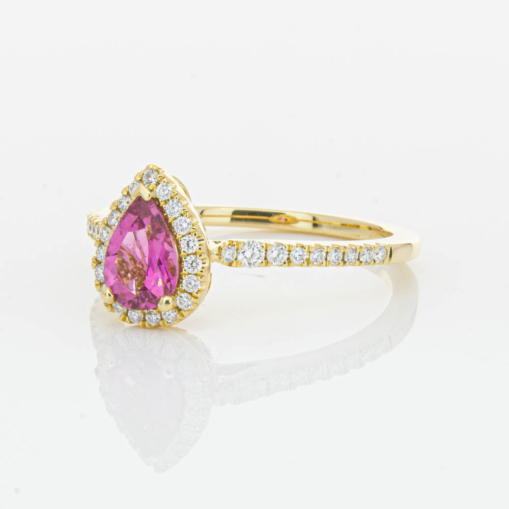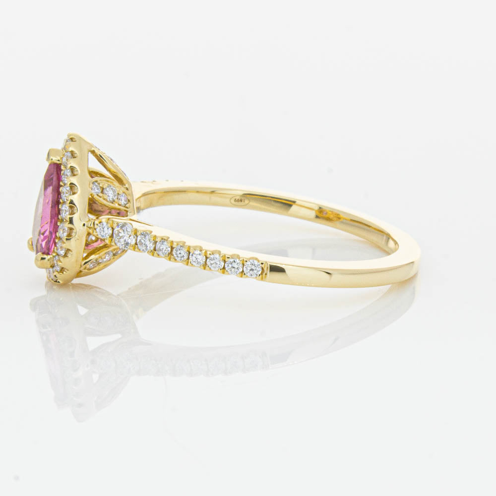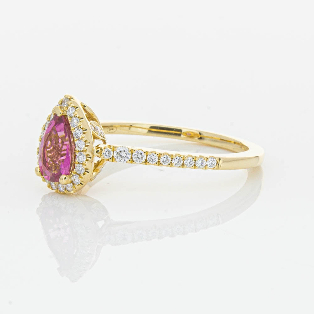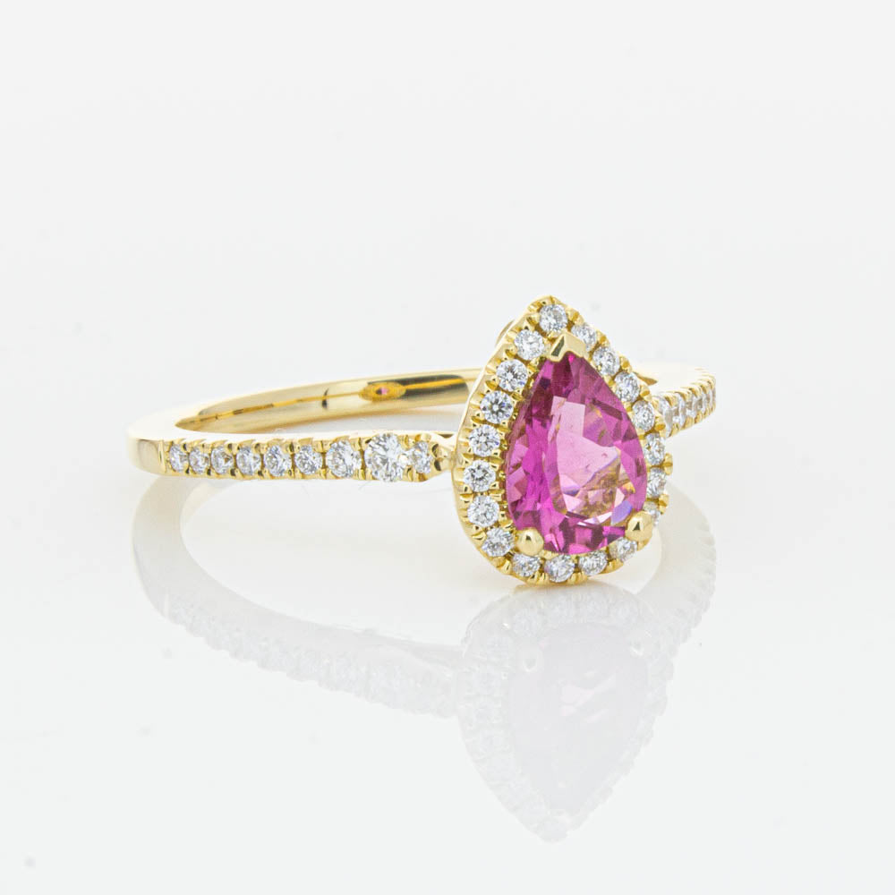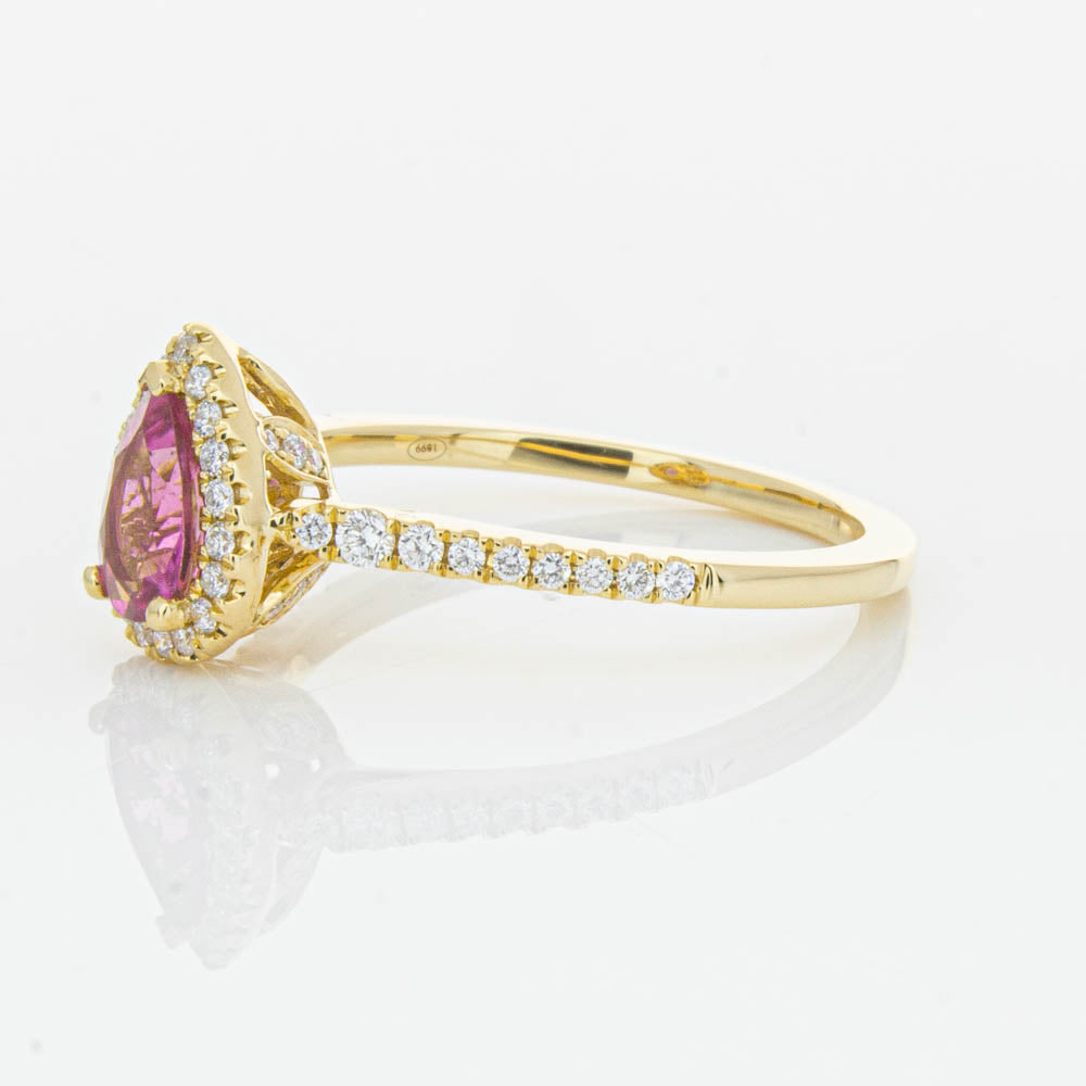 A pear faceted pink tourmaline sourced from Africa sparkles with bright pink hues and is enlivened with a halo of round brilliant cut diamonds to create a stunning and luminous effect in this gorgeous mini Sierra ring from our signature 1899 collection. Crafted in beautiful 18ct yellow gold.