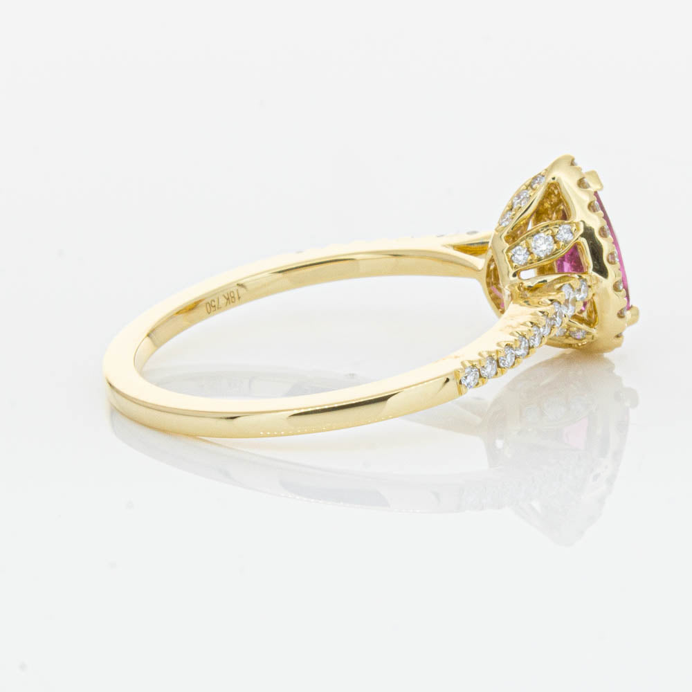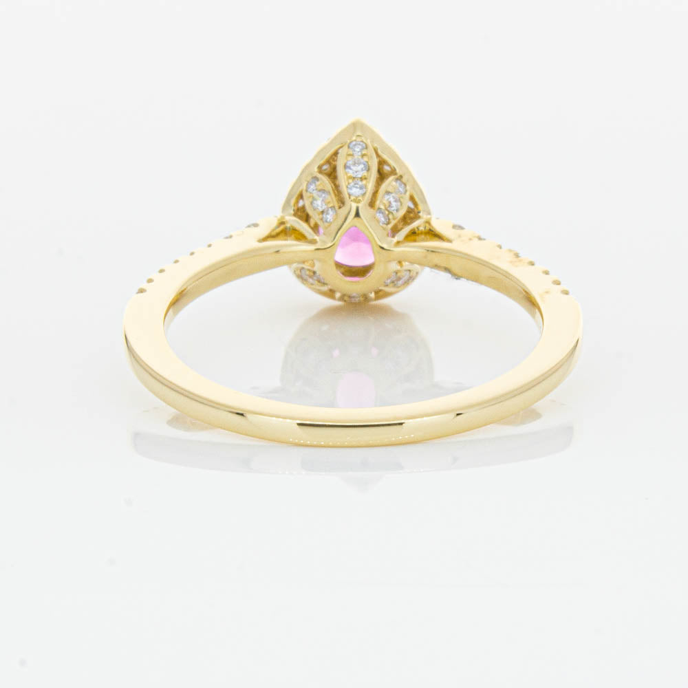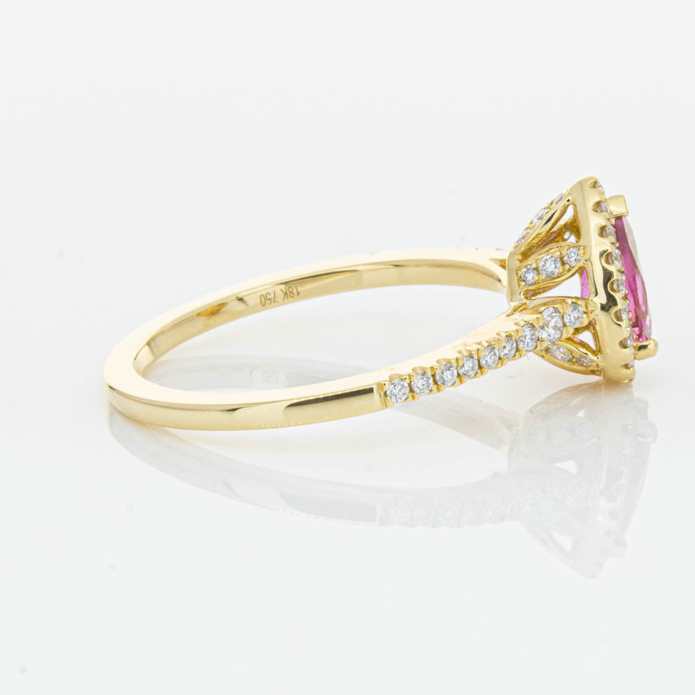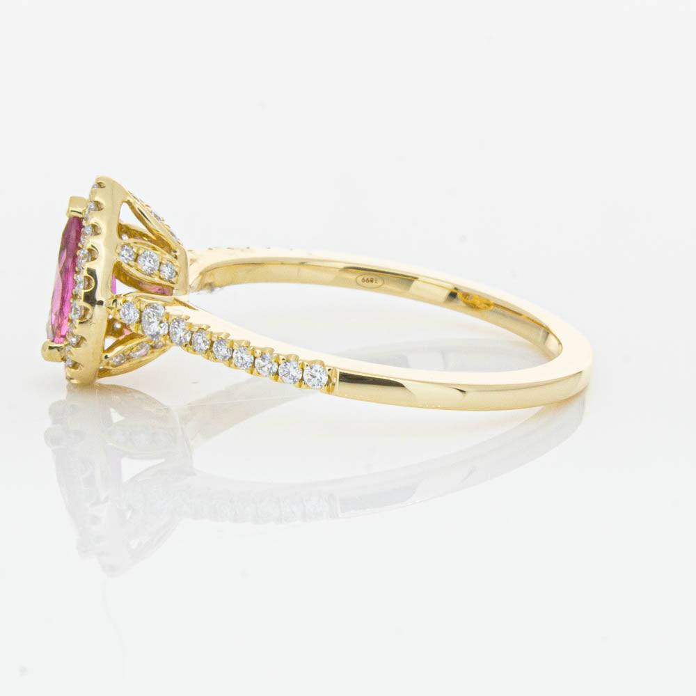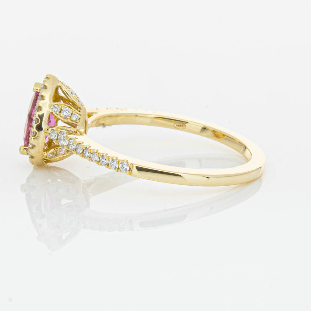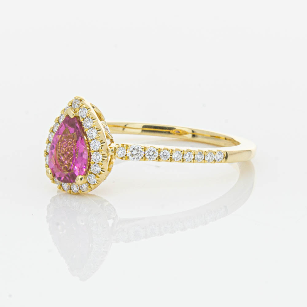 A pear faceted pink tourmaline sourced from Africa sparkles with bright pink hues and is enlivened with a halo of round brilliant cut diamonds to create a stunning and luminous effect in this gorgeous mini Sierra ring from our signature 1899 collection. Crafted in beautiful 18ct yellow gold.