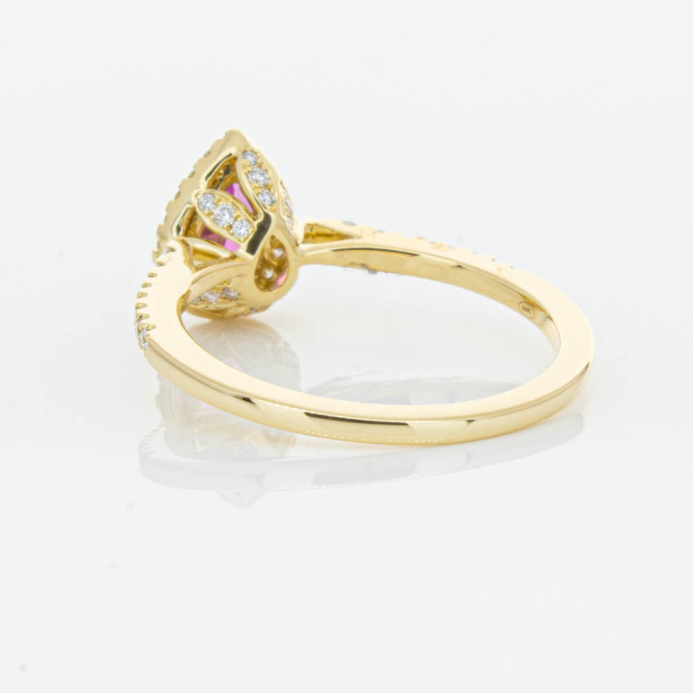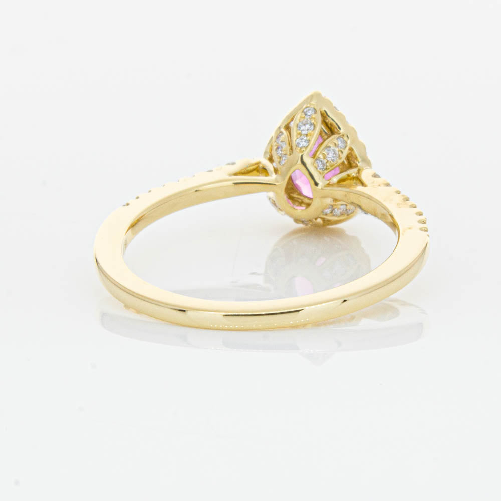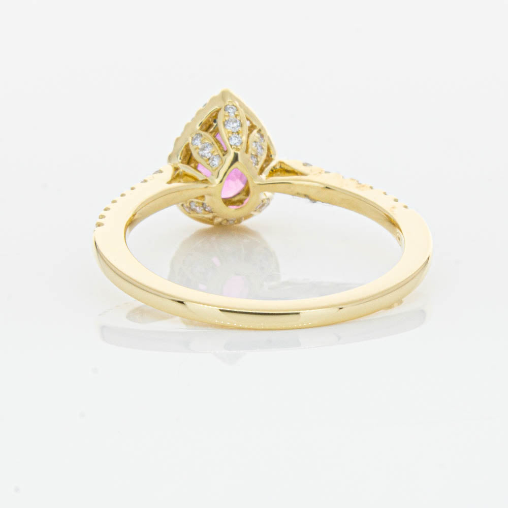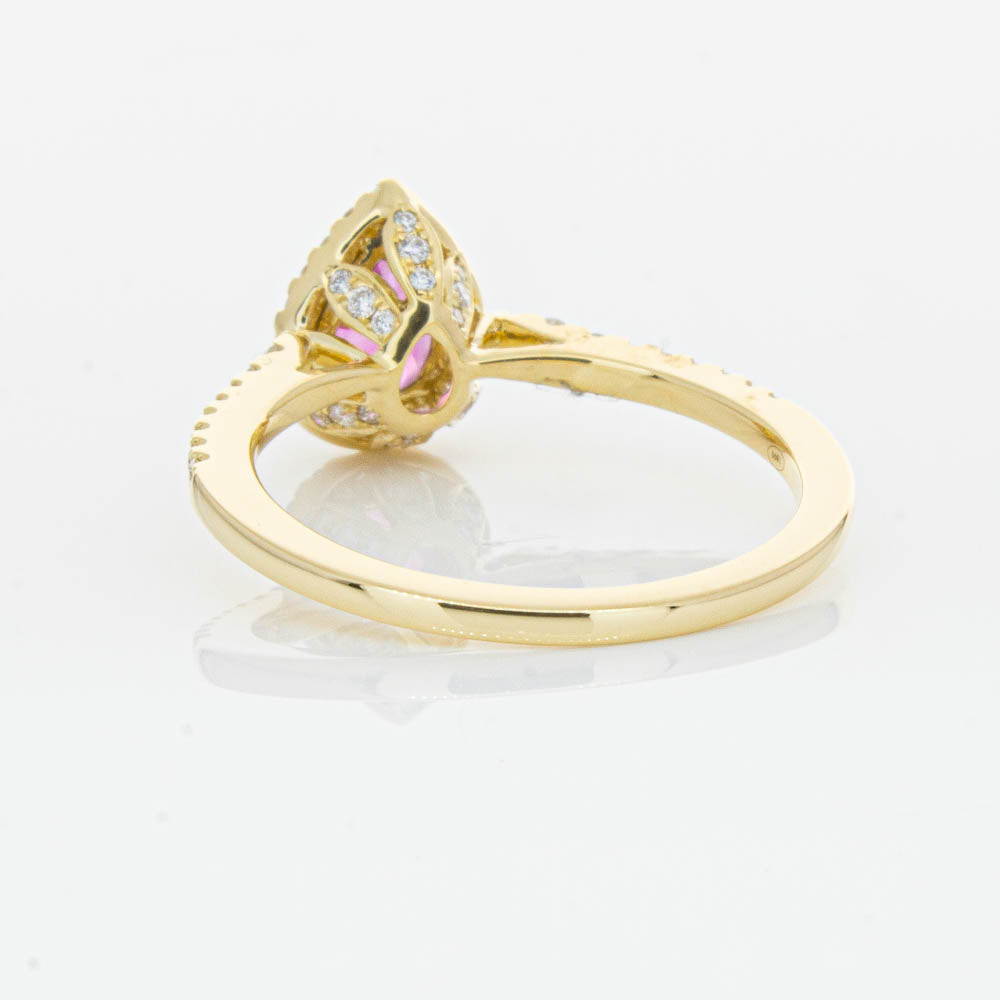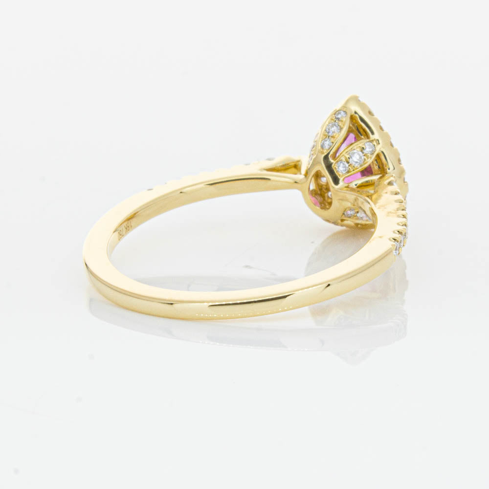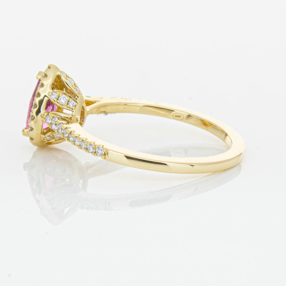 A pear faceted pink tourmaline sourced from Africa sparkles with bright pink hues and is enlivened with a halo of round brilliant cut diamonds to create a stunning and luminous effect in this gorgeous mini Sierra ring from our signature 1899 collection. Crafted in beautiful 18ct yellow gold.