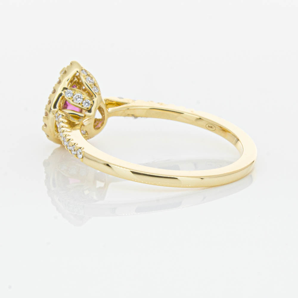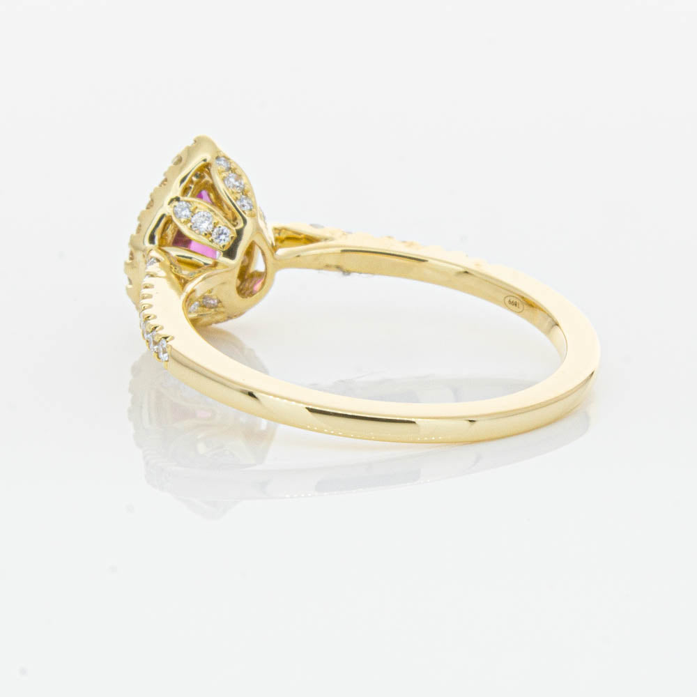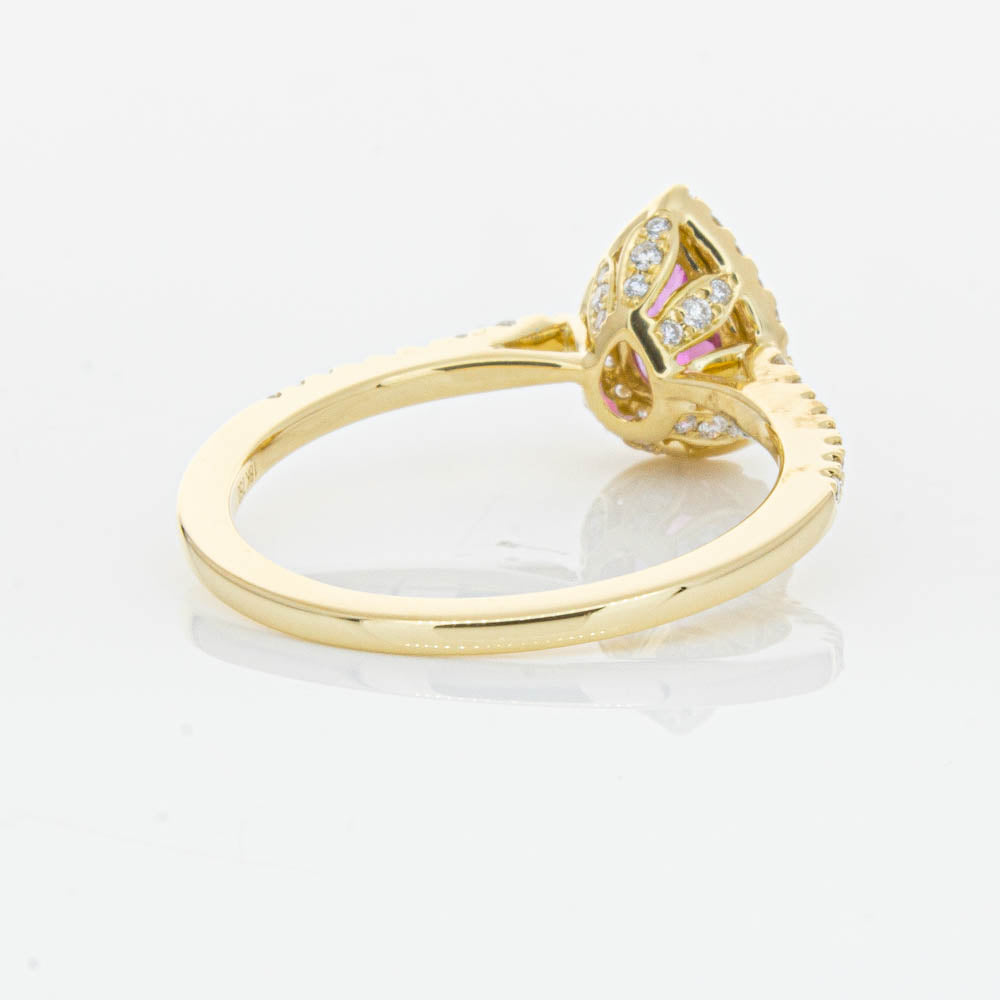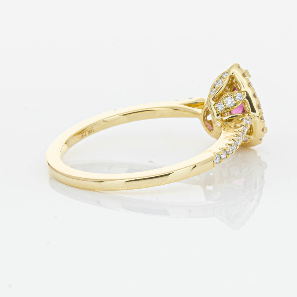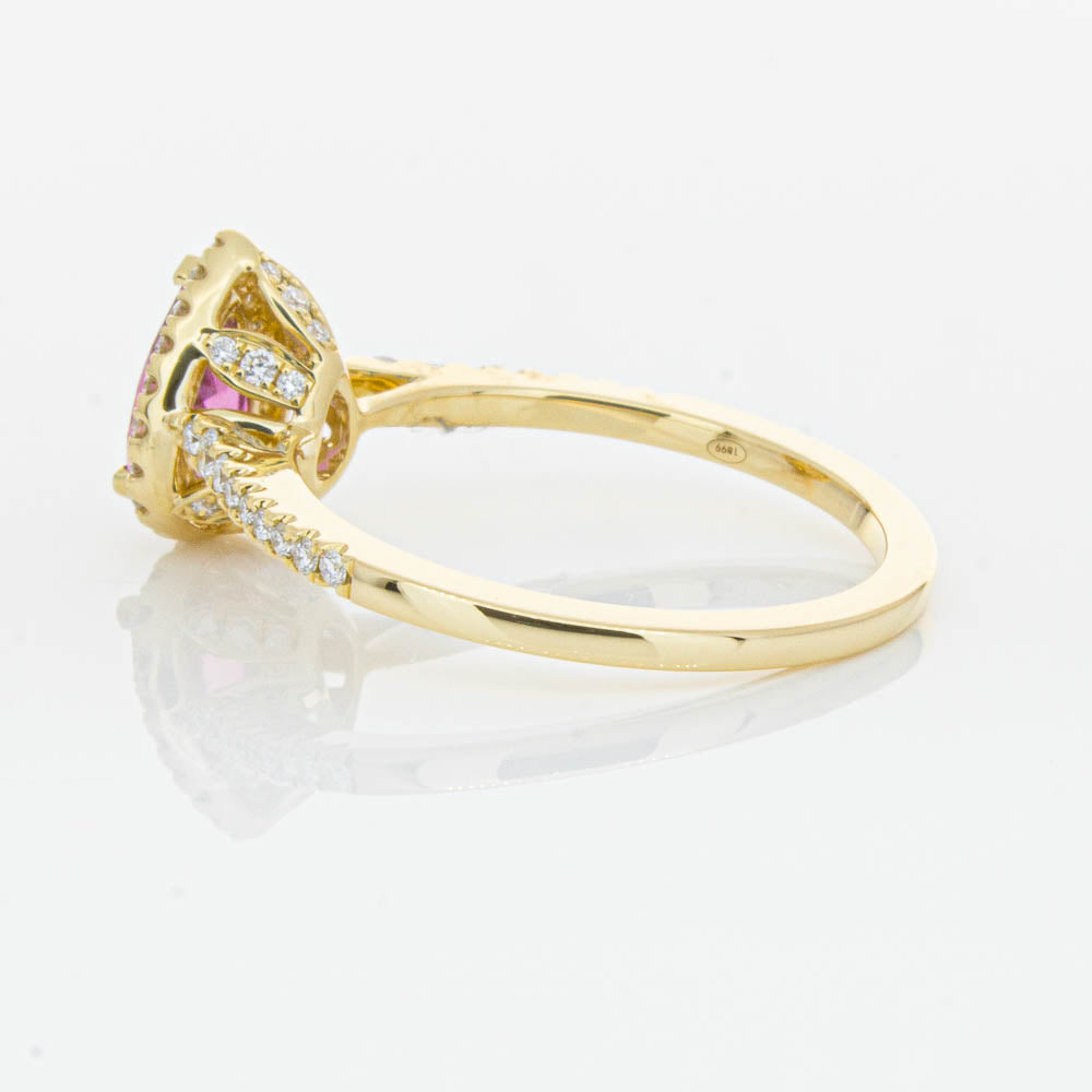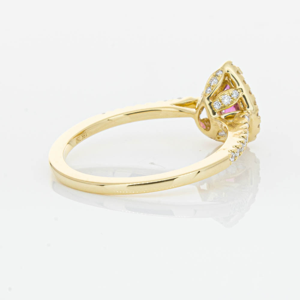 A pear faceted pink tourmaline sourced from Africa sparkles with bright pink hues and is enlivened with a halo of round brilliant cut diamonds to create a stunning and luminous effect in this gorgeous mini Sierra ring from our signature 1899 collection. Crafted in beautiful 18ct yellow gold.