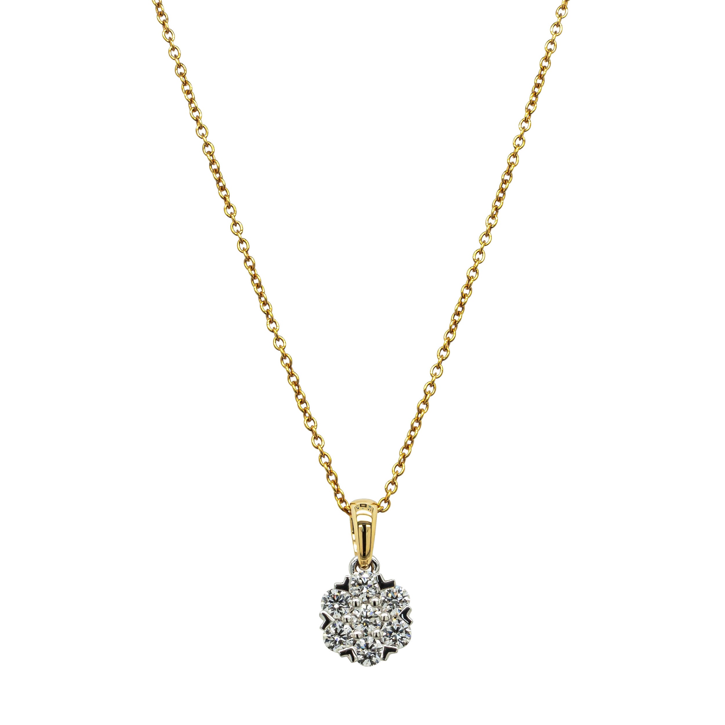 This exquisite Lotus Pendant features a dazzling cluster of seven round brilliant-cut diamonds. Meticulously claw-set in rich yellow and white gold, the pendant’s elegant design ensures radiant sparkle from every angle. This pendant effortlessly combines classic craftsmanship with contemporary style.