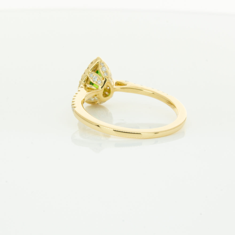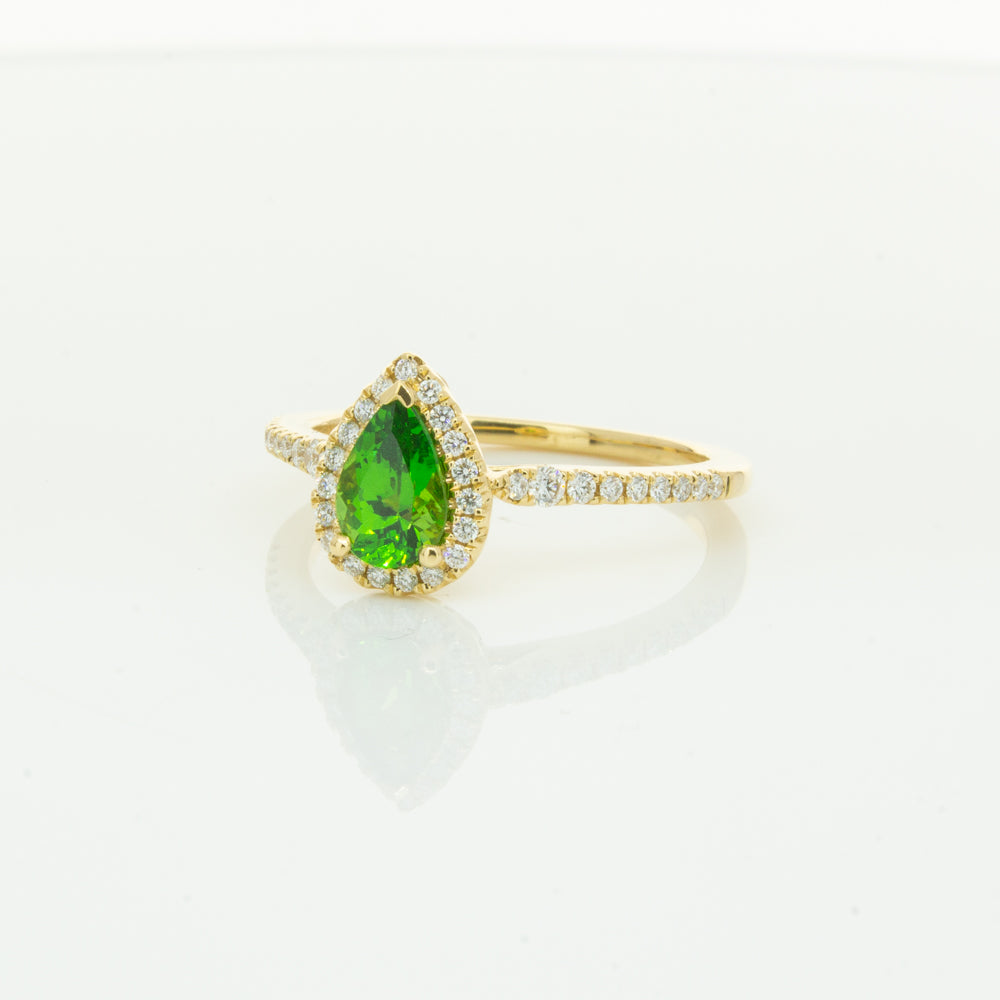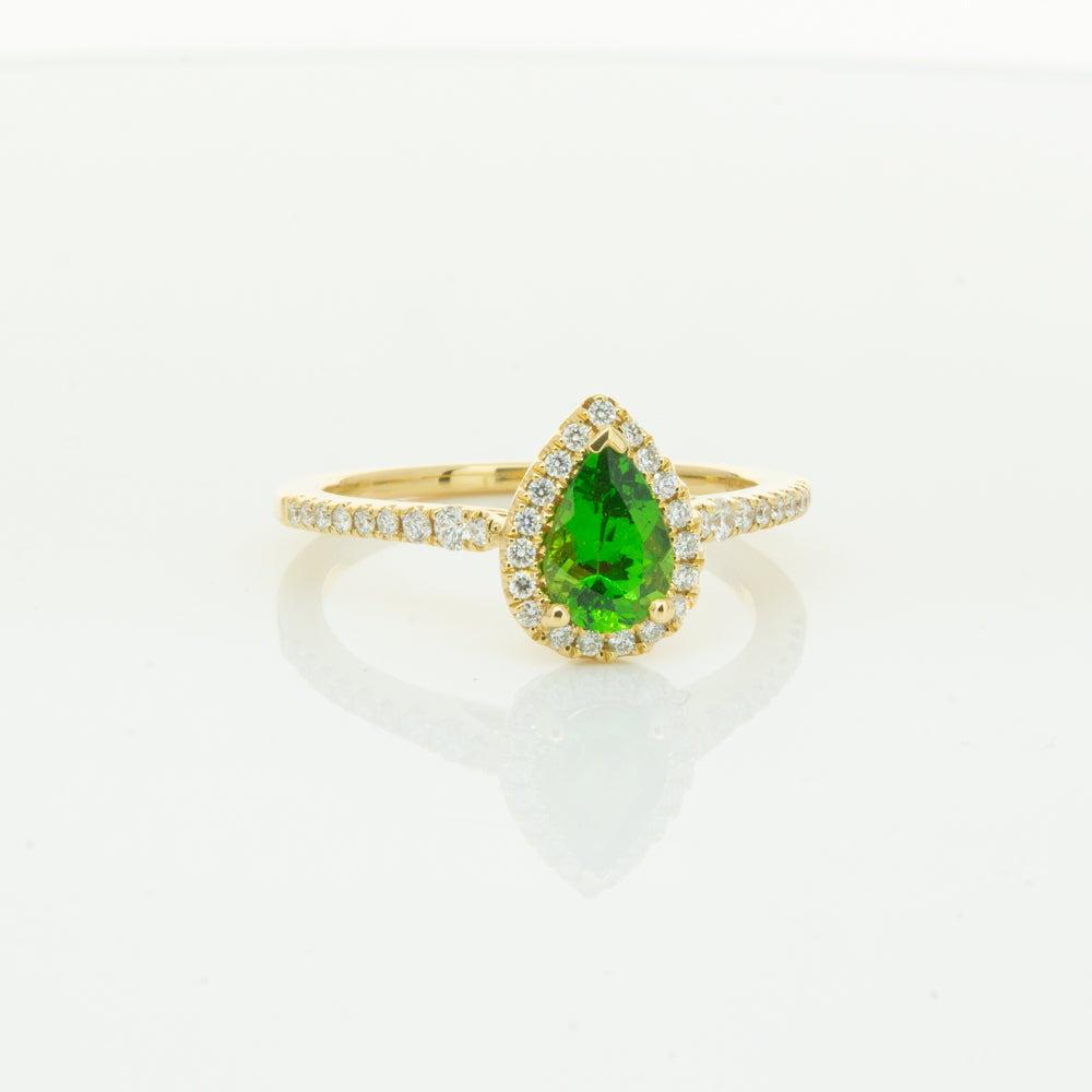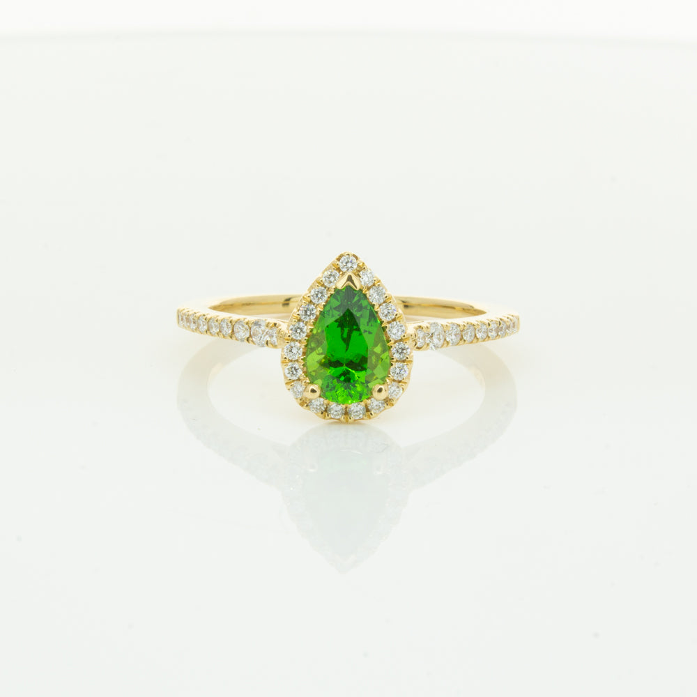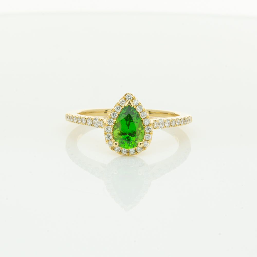 A pear faceted tsavorite sparkles with bold, forest hues and is enlivened with a halo of round brilliant cut diamonds to create a stunning and luminous effect in this gorgeous mini Sierra ring from our signature 1899 collection. Crafted in beautiful 18ct yellow gold.