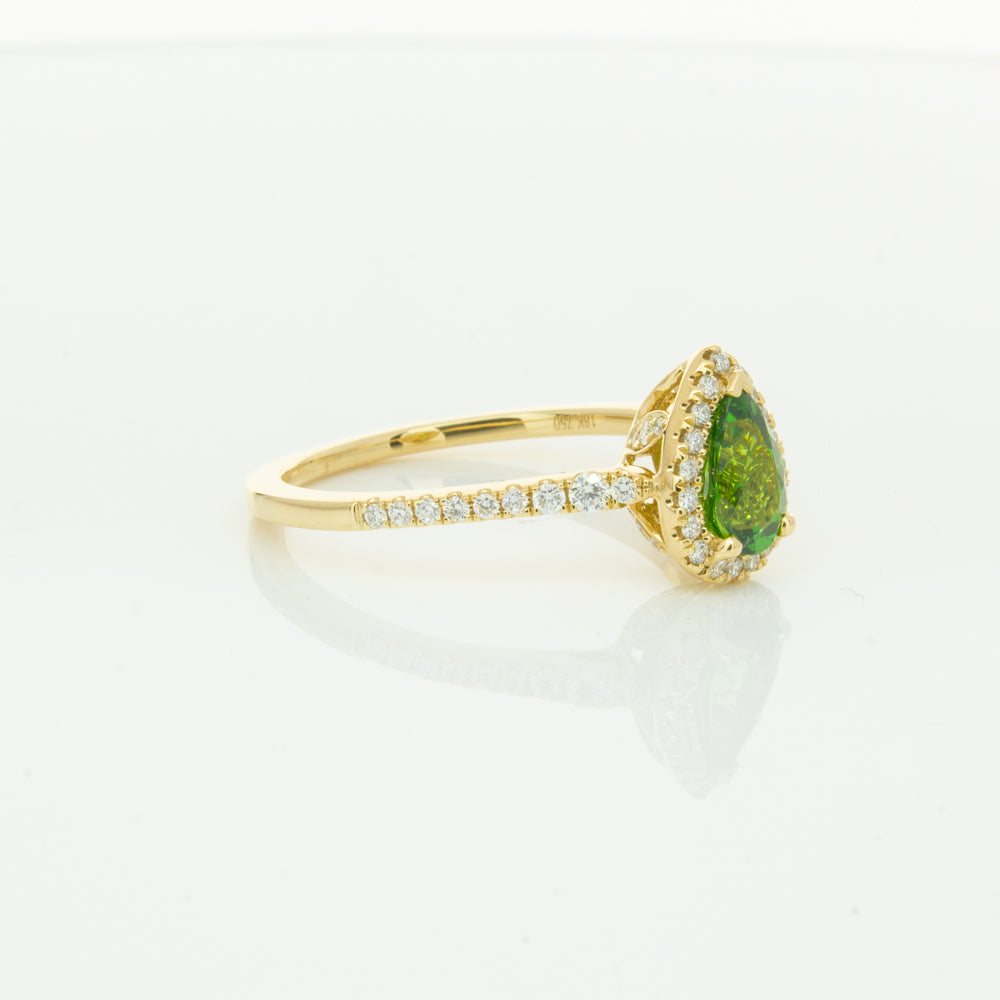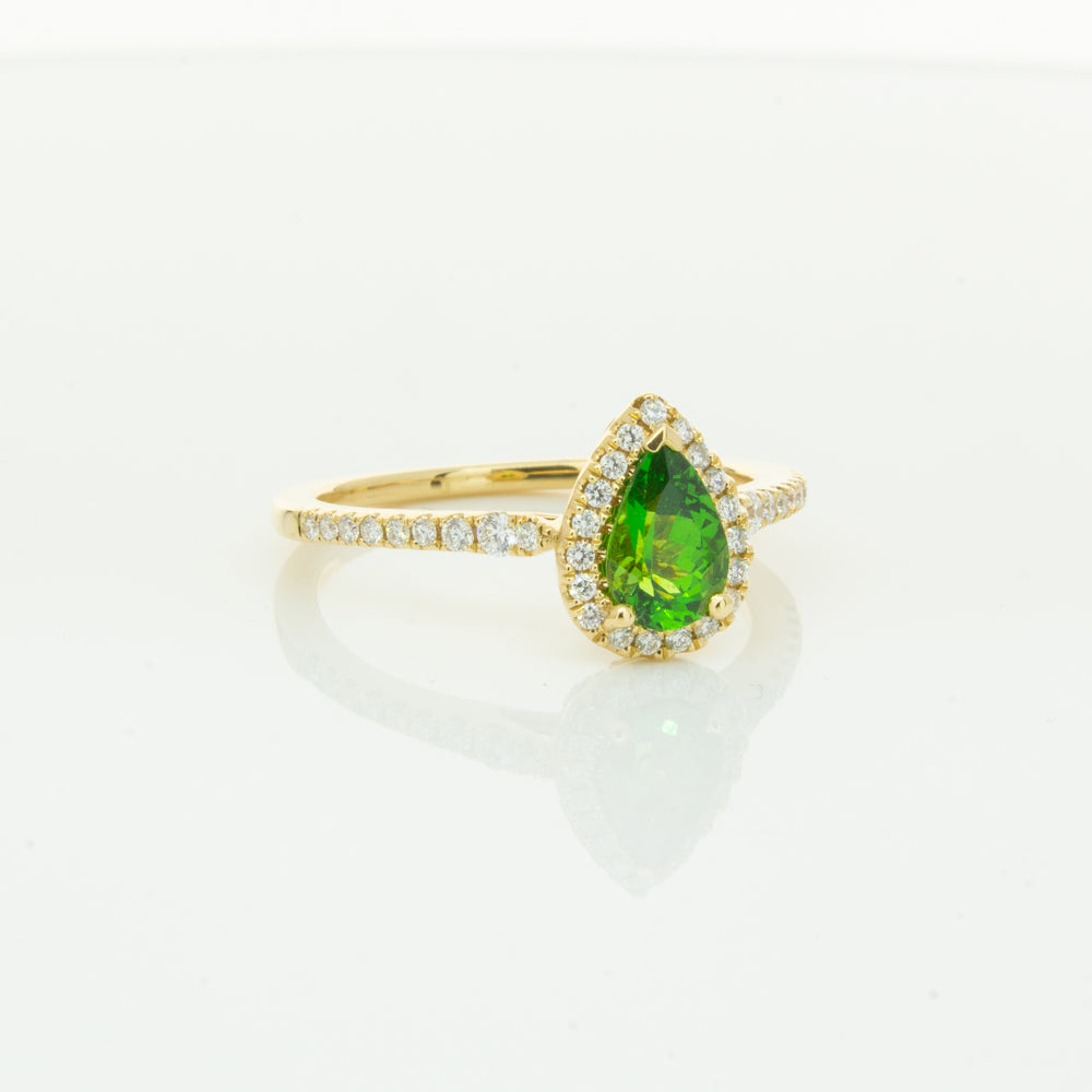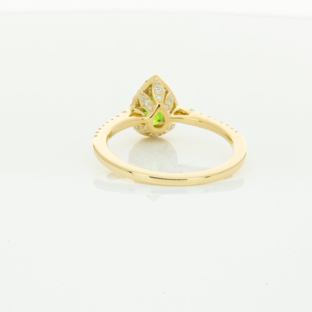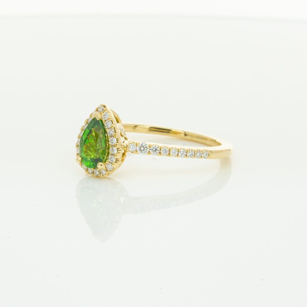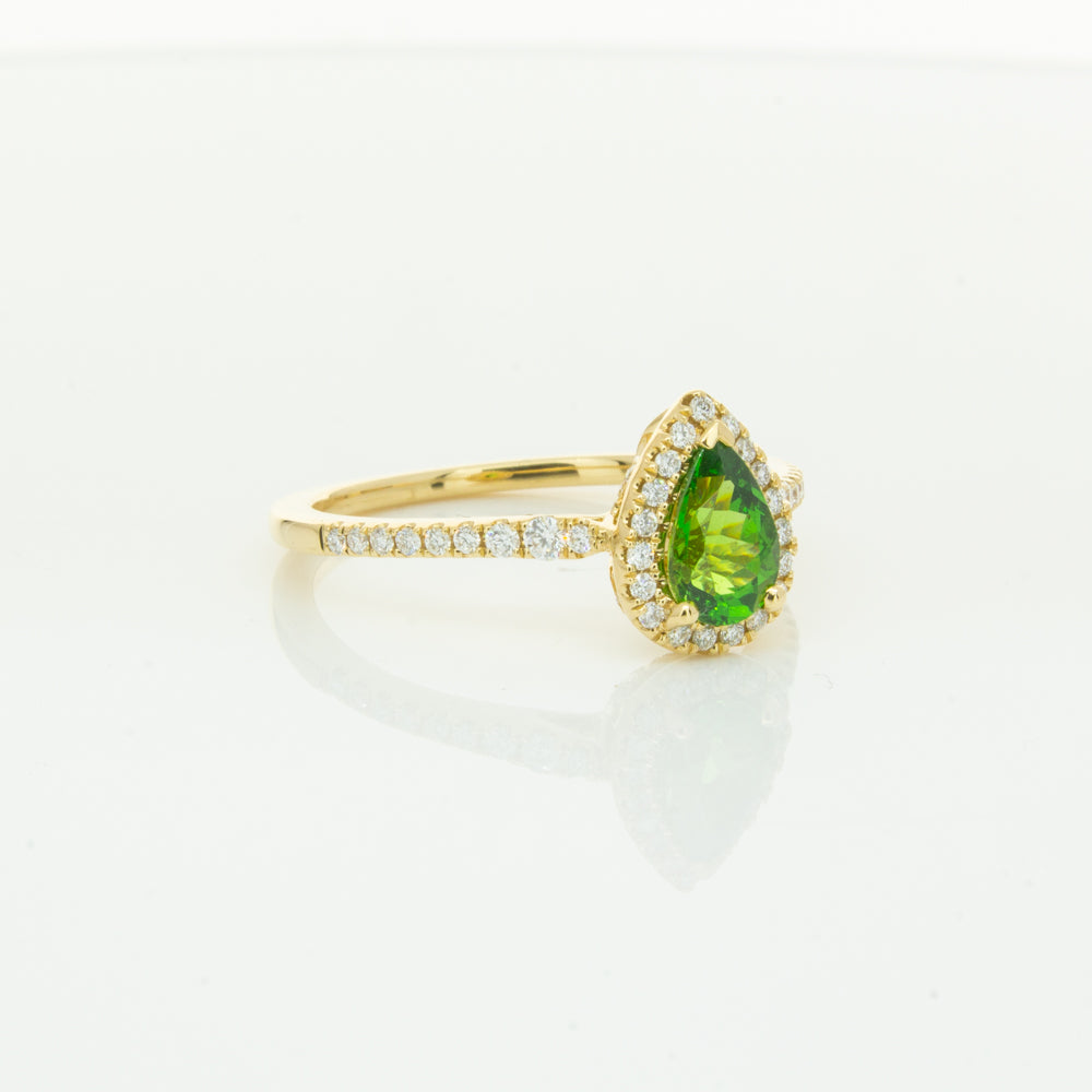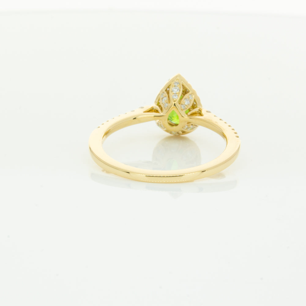 A pear faceted tsavorite sparkles with bold, forest hues and is enlivened with a halo of round brilliant cut diamonds to create a stunning and luminous effect in this gorgeous mini Sierra ring from our signature 1899 collection. Crafted in beautiful 18ct yellow gold.