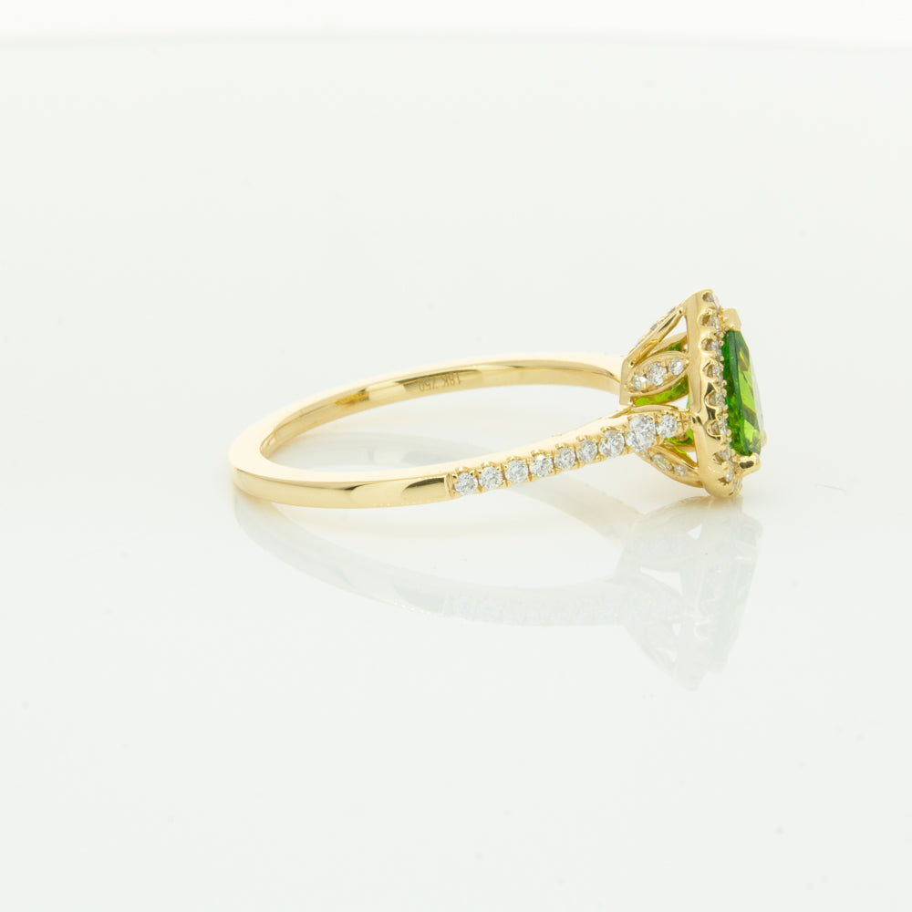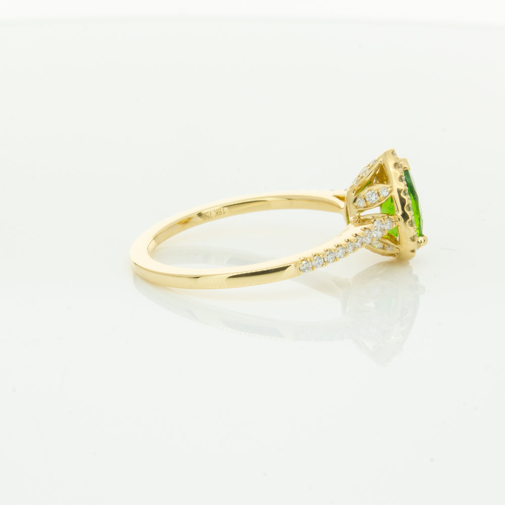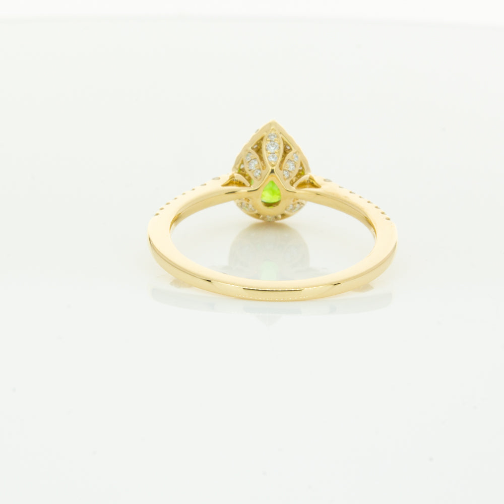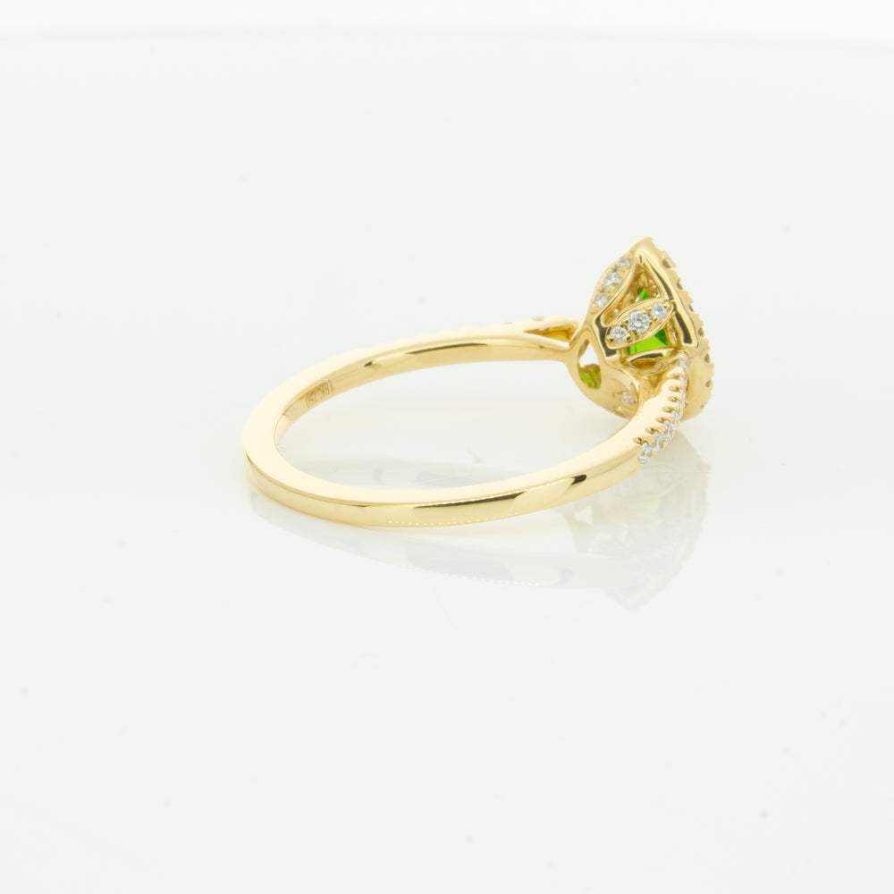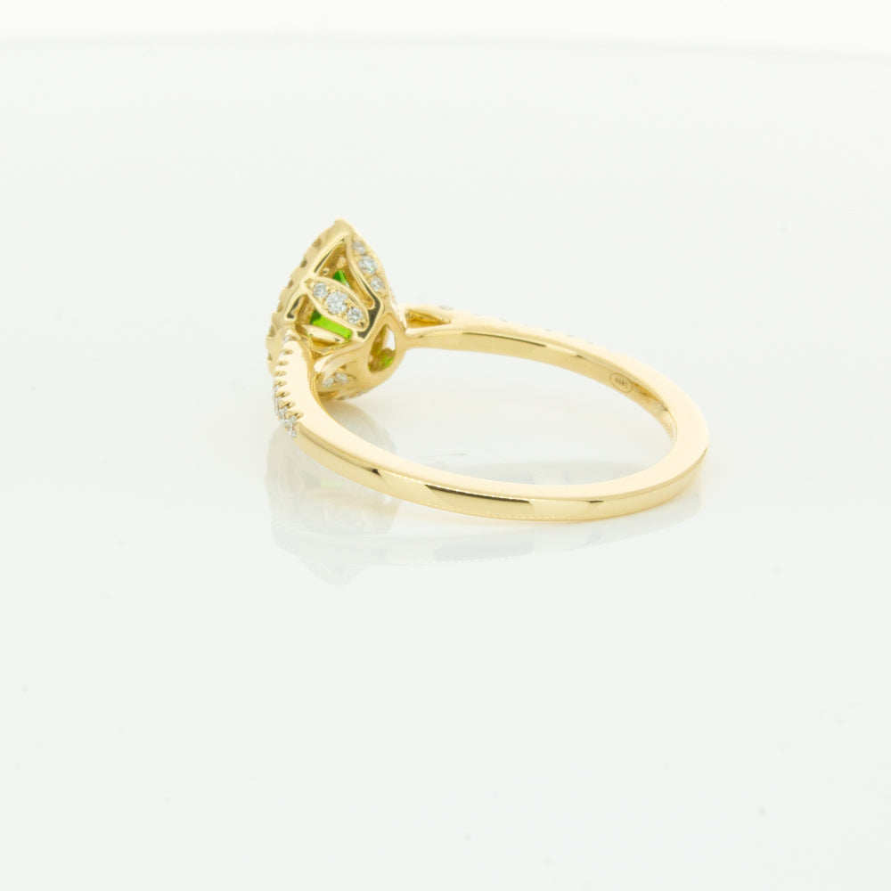 A pear faceted tsavorite sparkles with bold, forest hues and is enlivened with a halo of round brilliant cut diamonds to create a stunning and luminous effect in this gorgeous mini Sierra ring from our signature 1899 collection. Crafted in beautiful 18ct yellow gold.