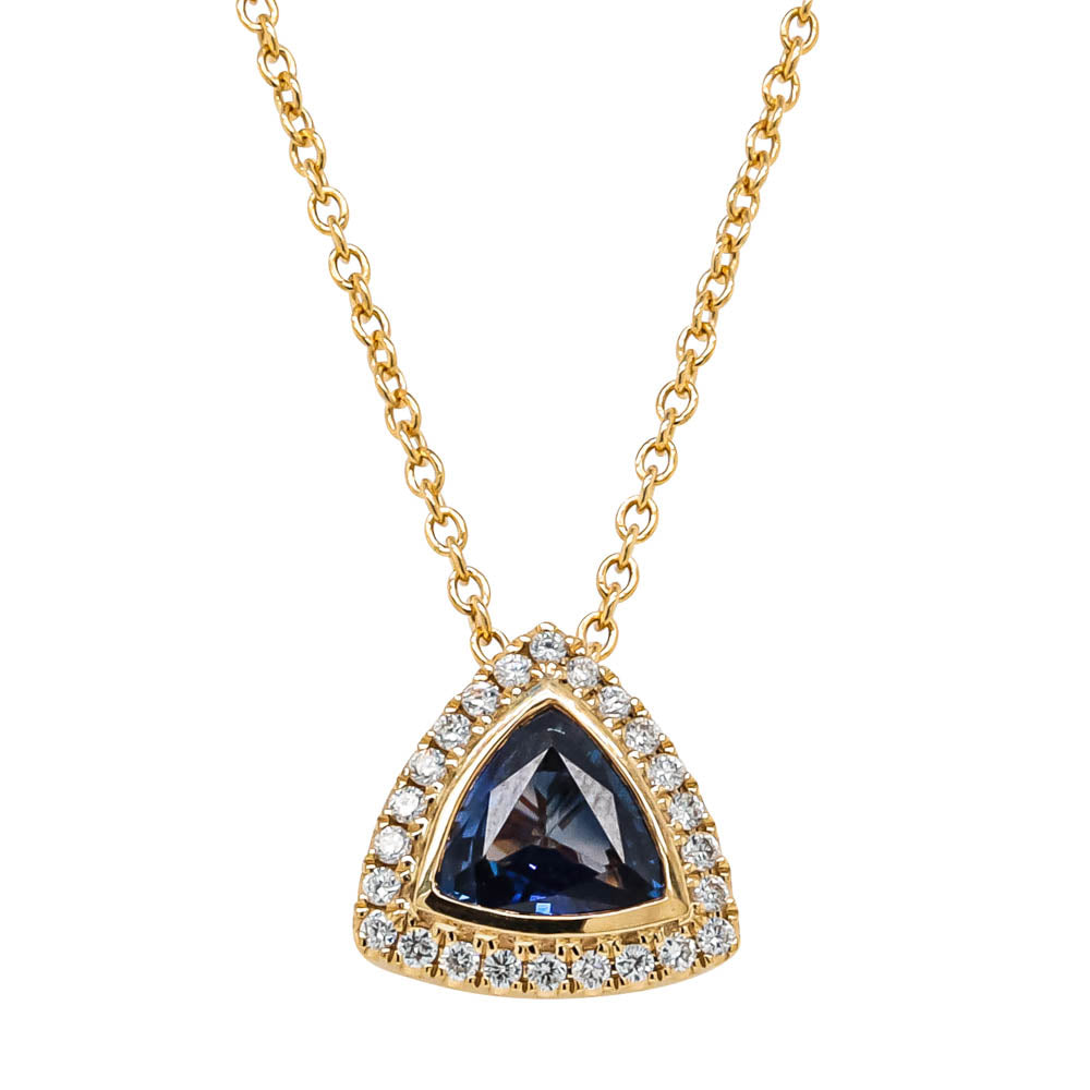 This gorgeous pendant consists of a trilliant cut sapphire from Africa surrounded by a halo of round brilliant cut diamonds, set in 18ct yellow gold from our signature 1899 collection.