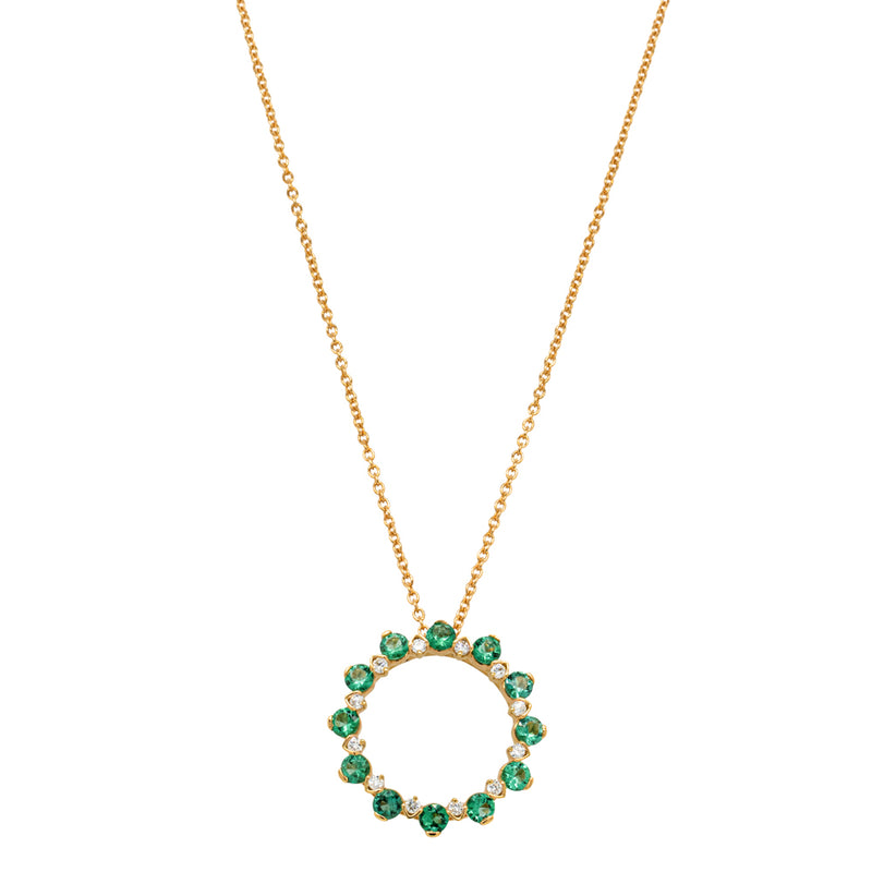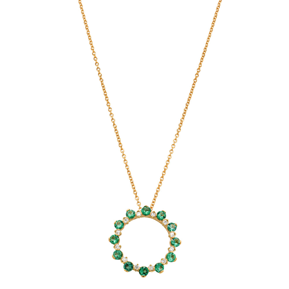 Carefully crafted to perfection from luxurious 18ct yellow gold, this shimmering pendant features twelve round faceted emeralds set on a circular mount, alternating with twelve round brilliant cut diamonds. A wonderful piece of jewellery for a May born beauty.