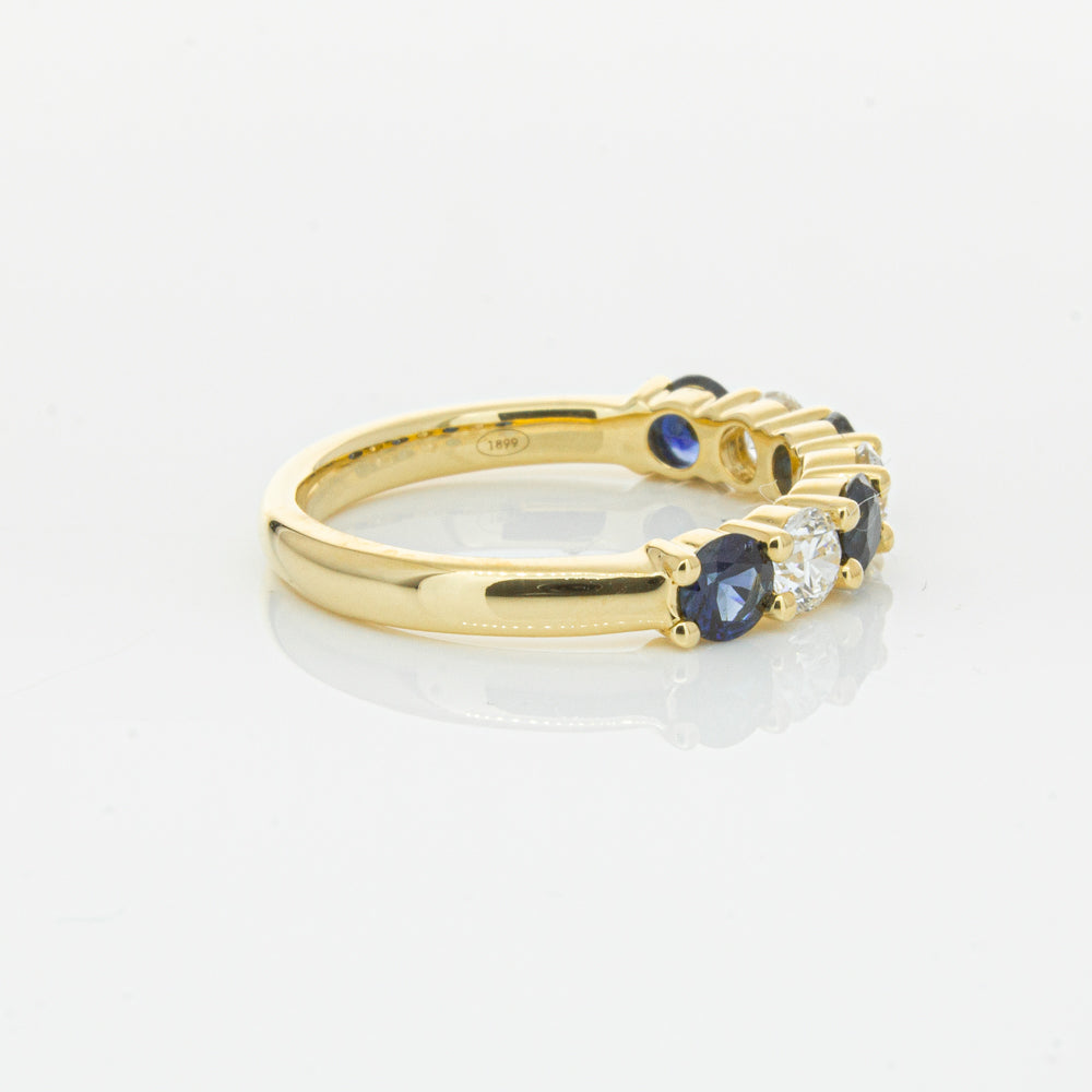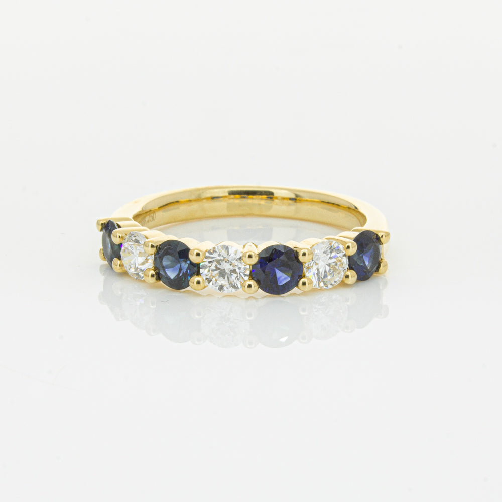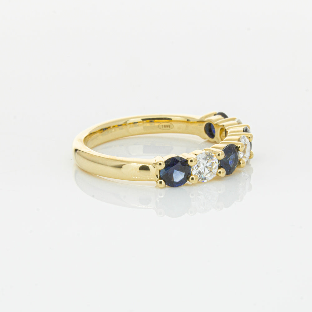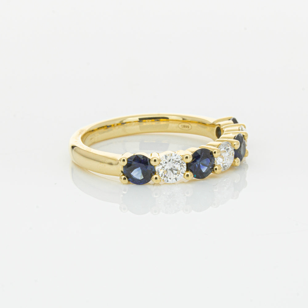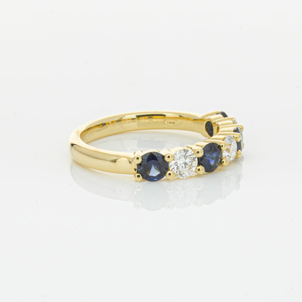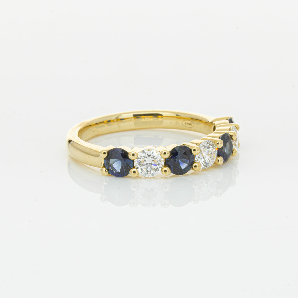 Hand crafted in 18ct yellow gold, this beautiful ring boasts .85cts of dark blue sapphires alternating with .54cts of round brilliant cut diamonds.