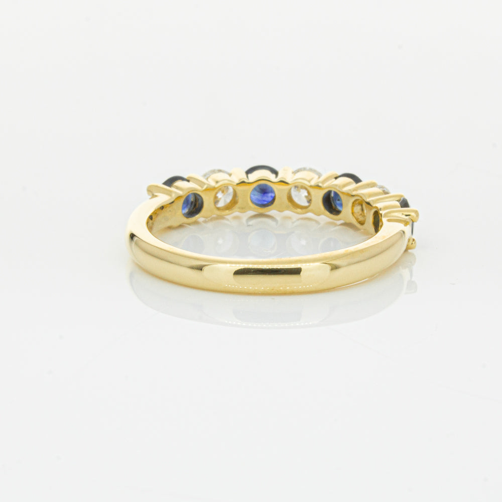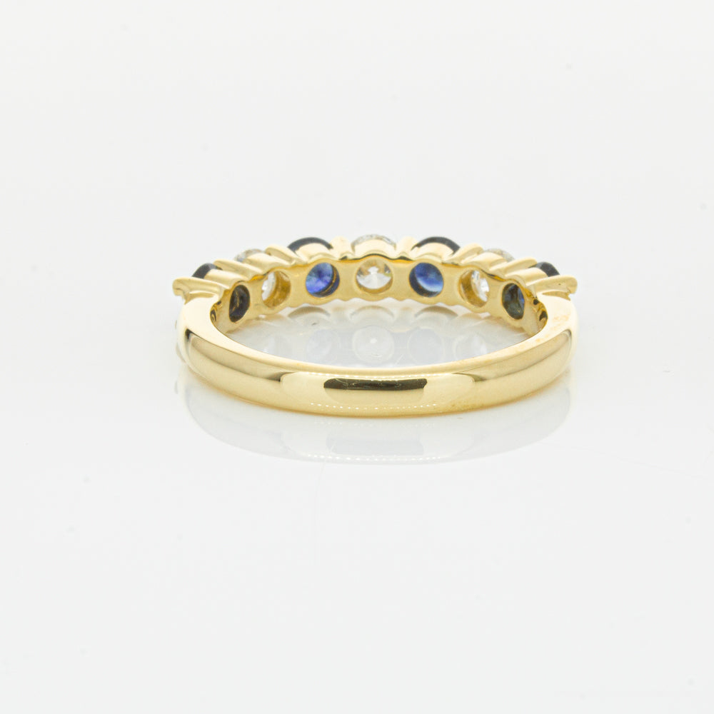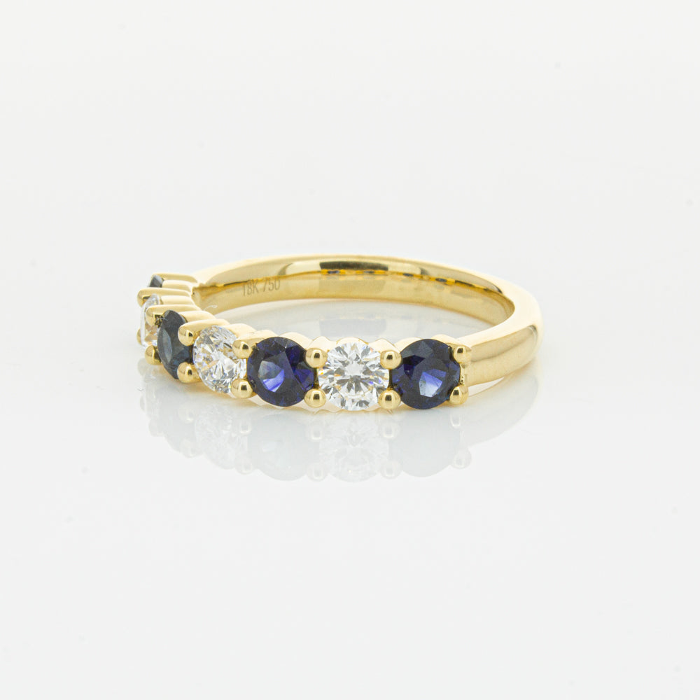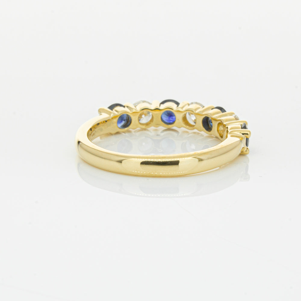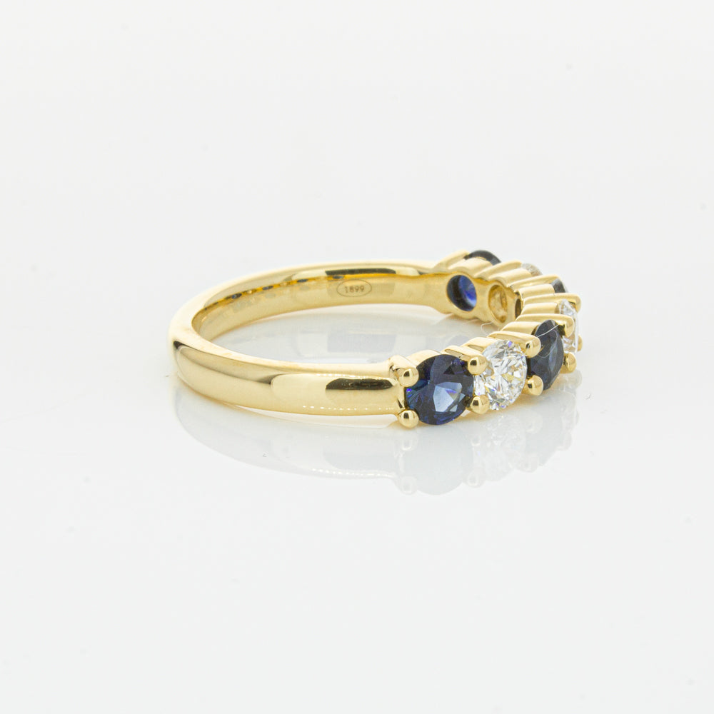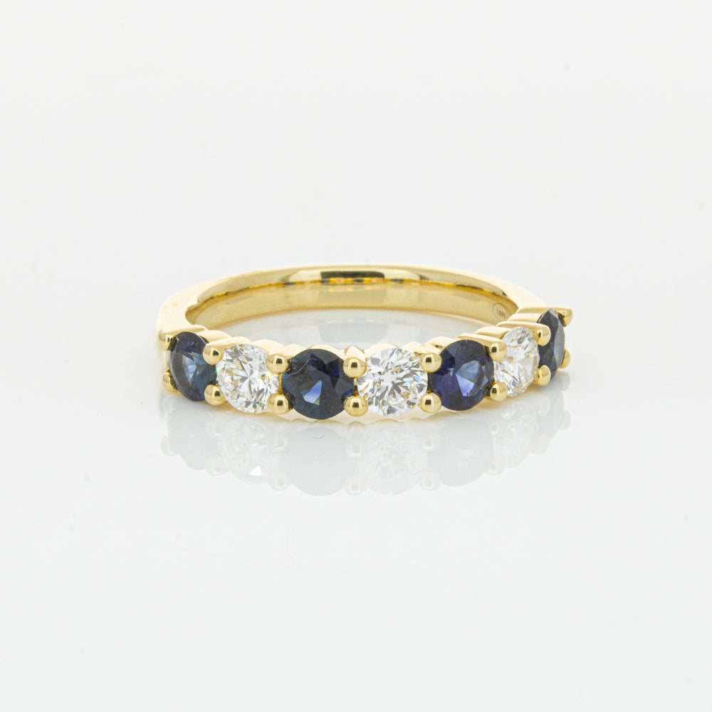 Hand crafted in 18ct yellow gold, this beautiful ring boasts .85cts of dark blue sapphires alternating with .54cts of round brilliant cut diamonds.
