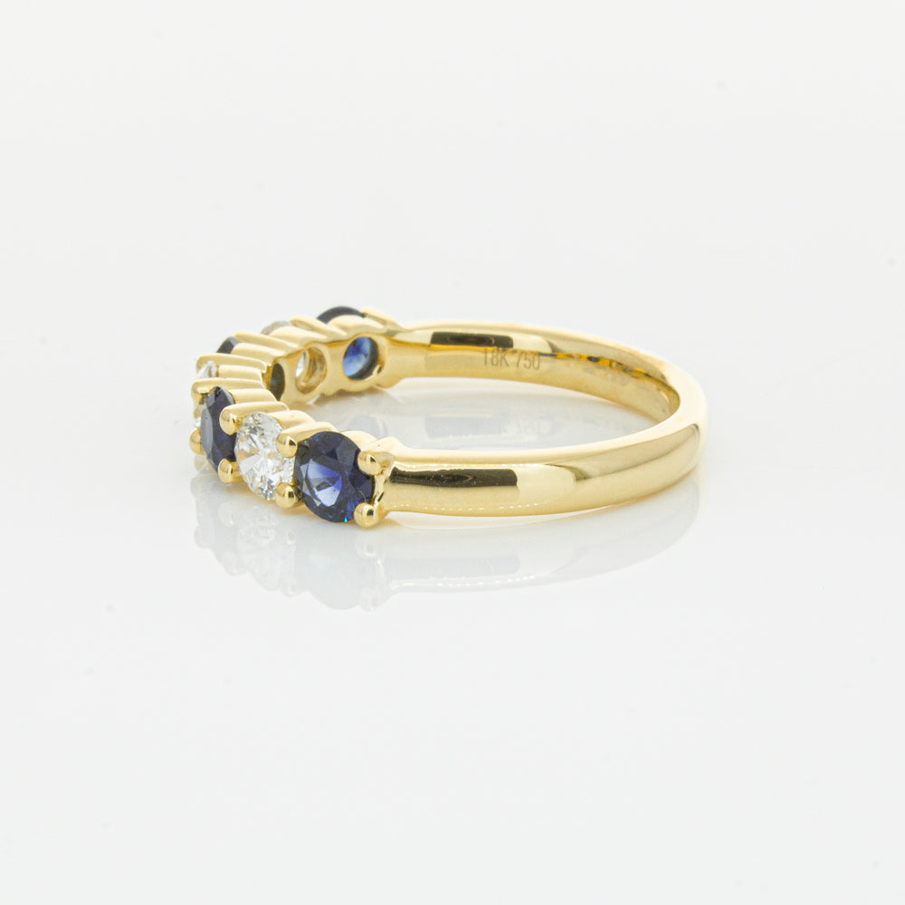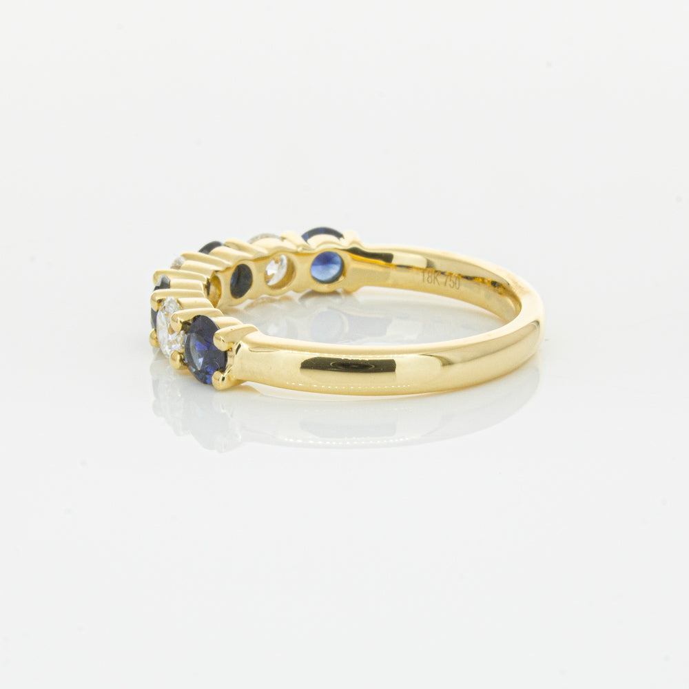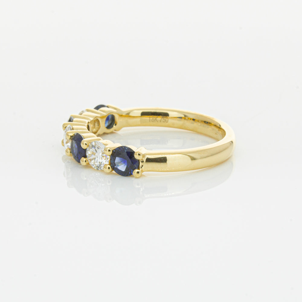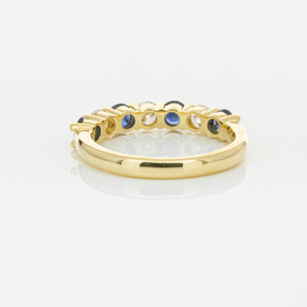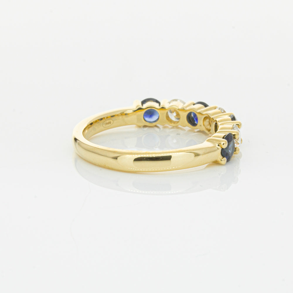 Hand crafted in 18ct yellow gold, this beautiful ring boasts .85cts of dark blue sapphires alternating with .54cts of round brilliant cut diamonds.