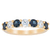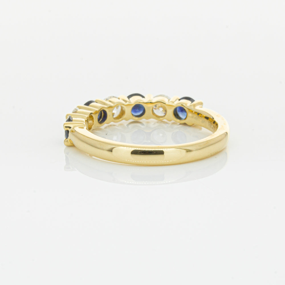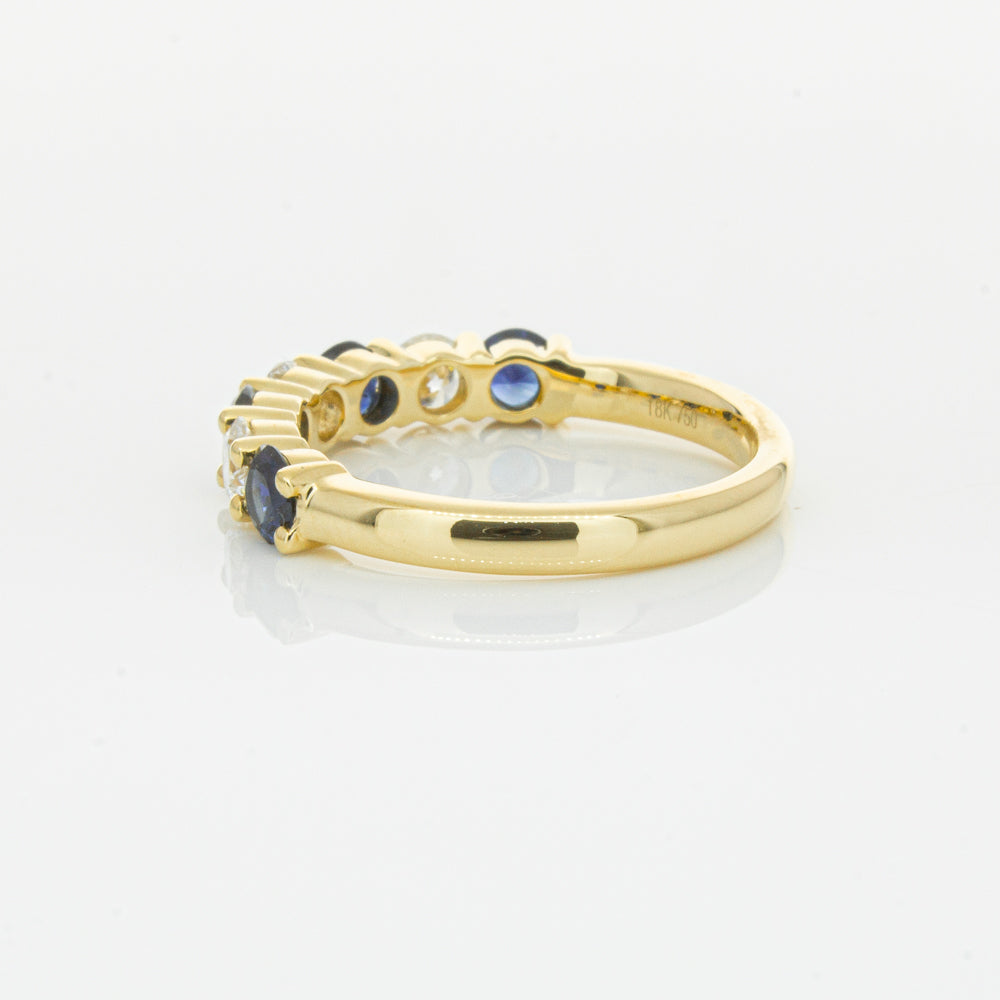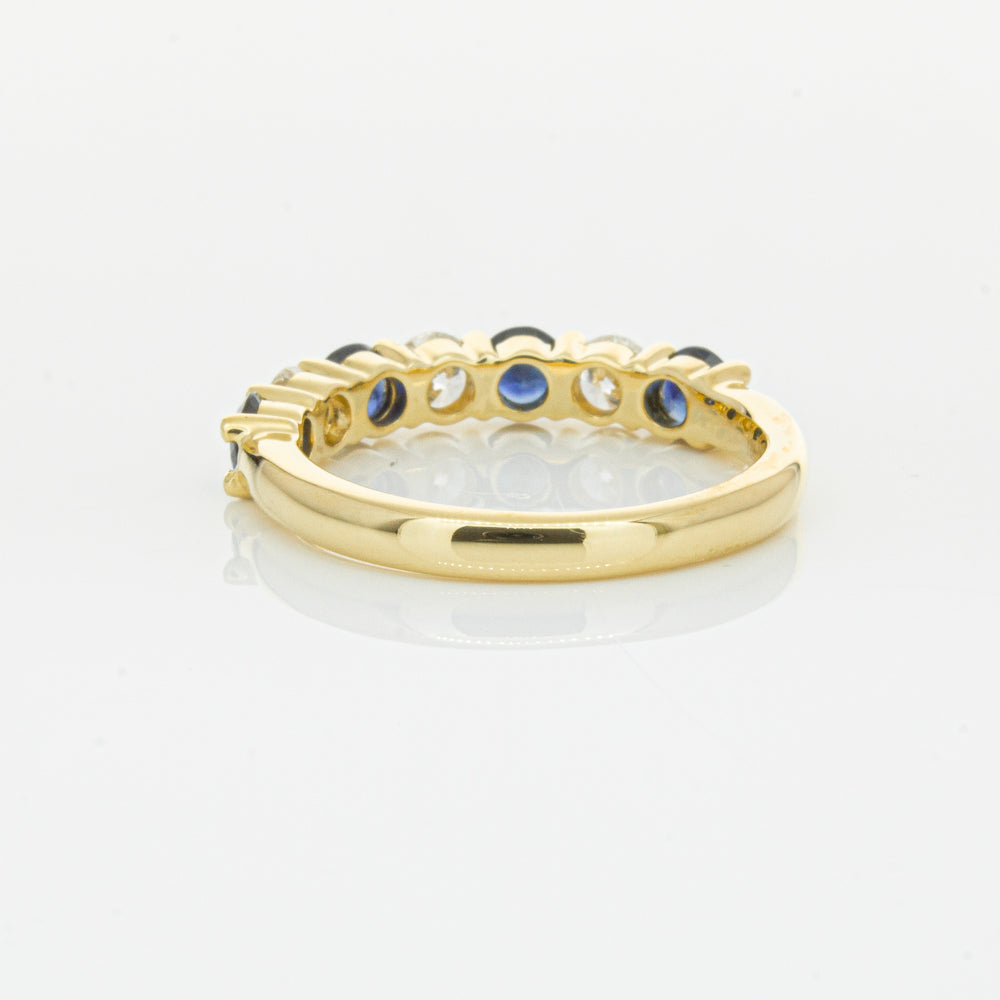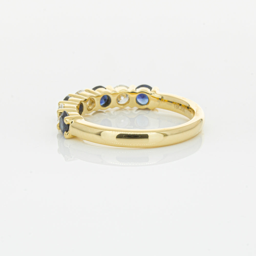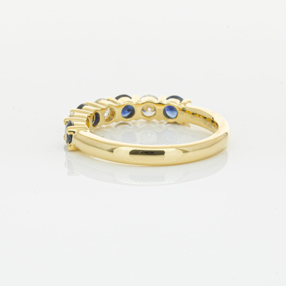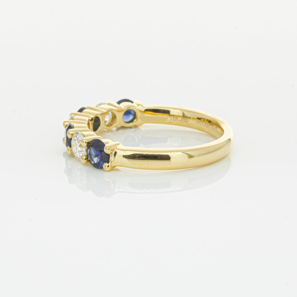 Hand crafted in 18ct yellow gold, this beautiful ring boasts .85cts of dark blue sapphires alternating with .54cts of round brilliant cut diamonds.