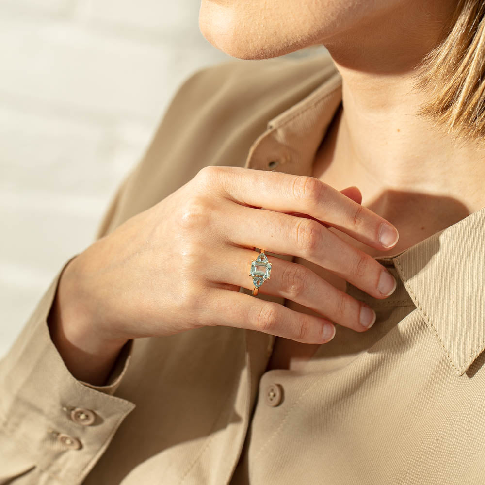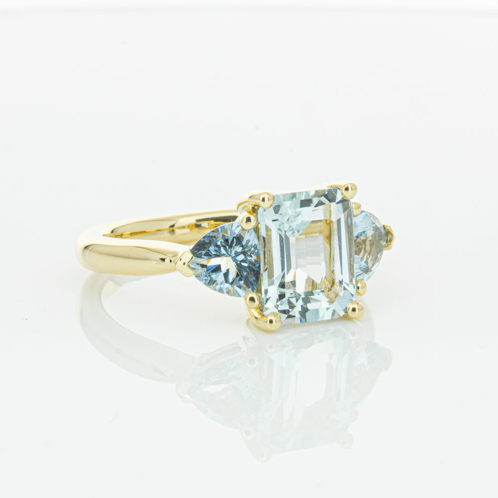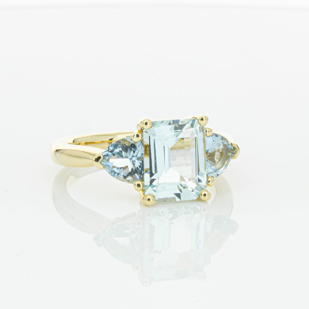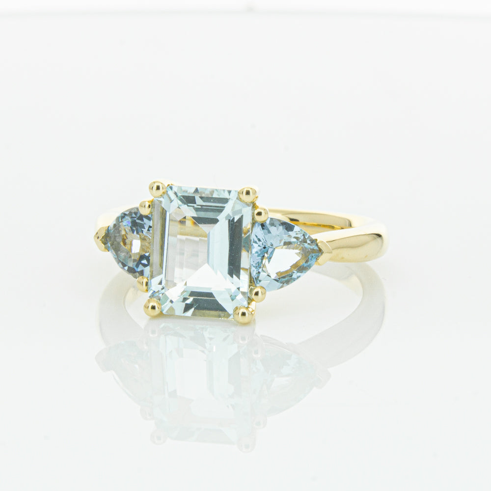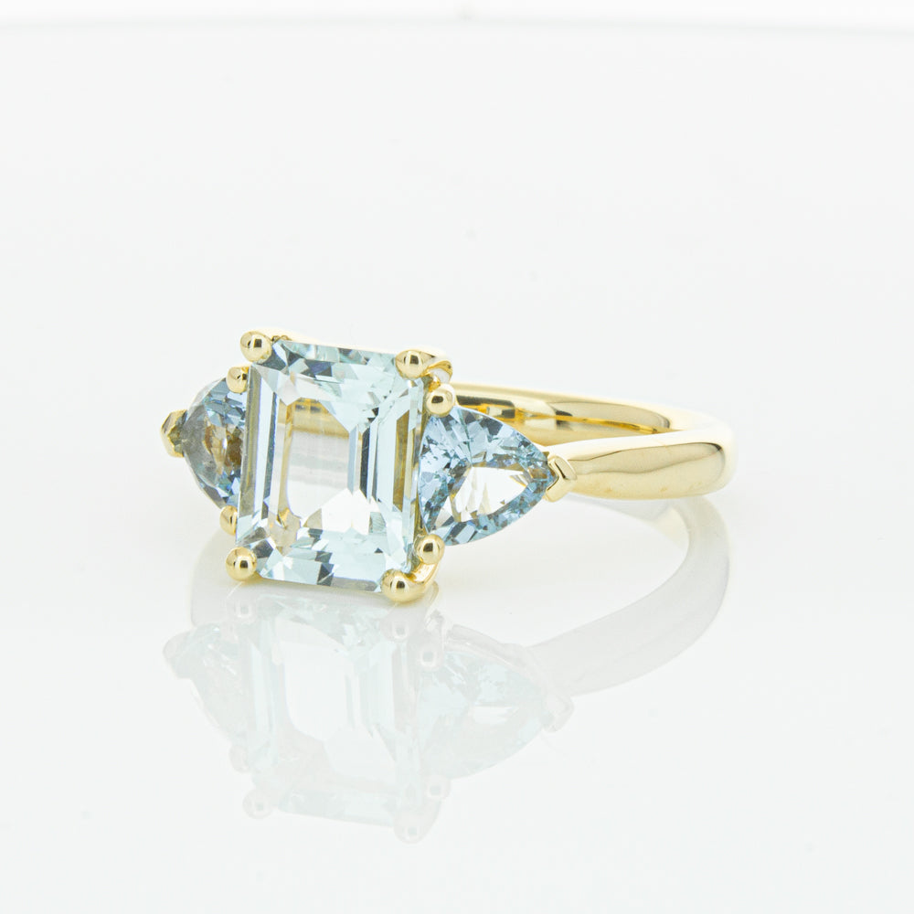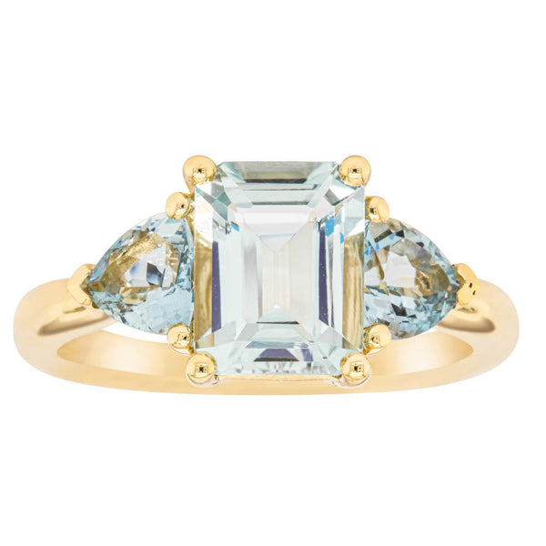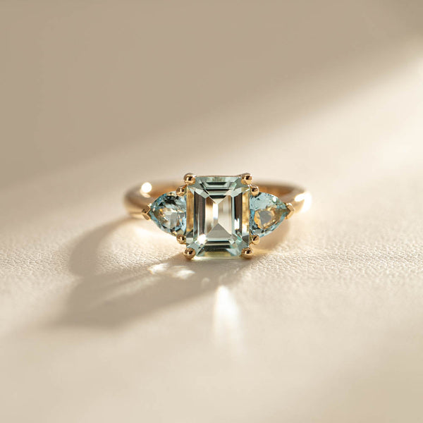 Inspired by the colours of the Malibu sunset, and crafted in 18ct yellow gold, this beautiful Malibu ring from our signature 1899 collection boasts a centre calming aquamarine, framed by two trilliant cut aquamarines.