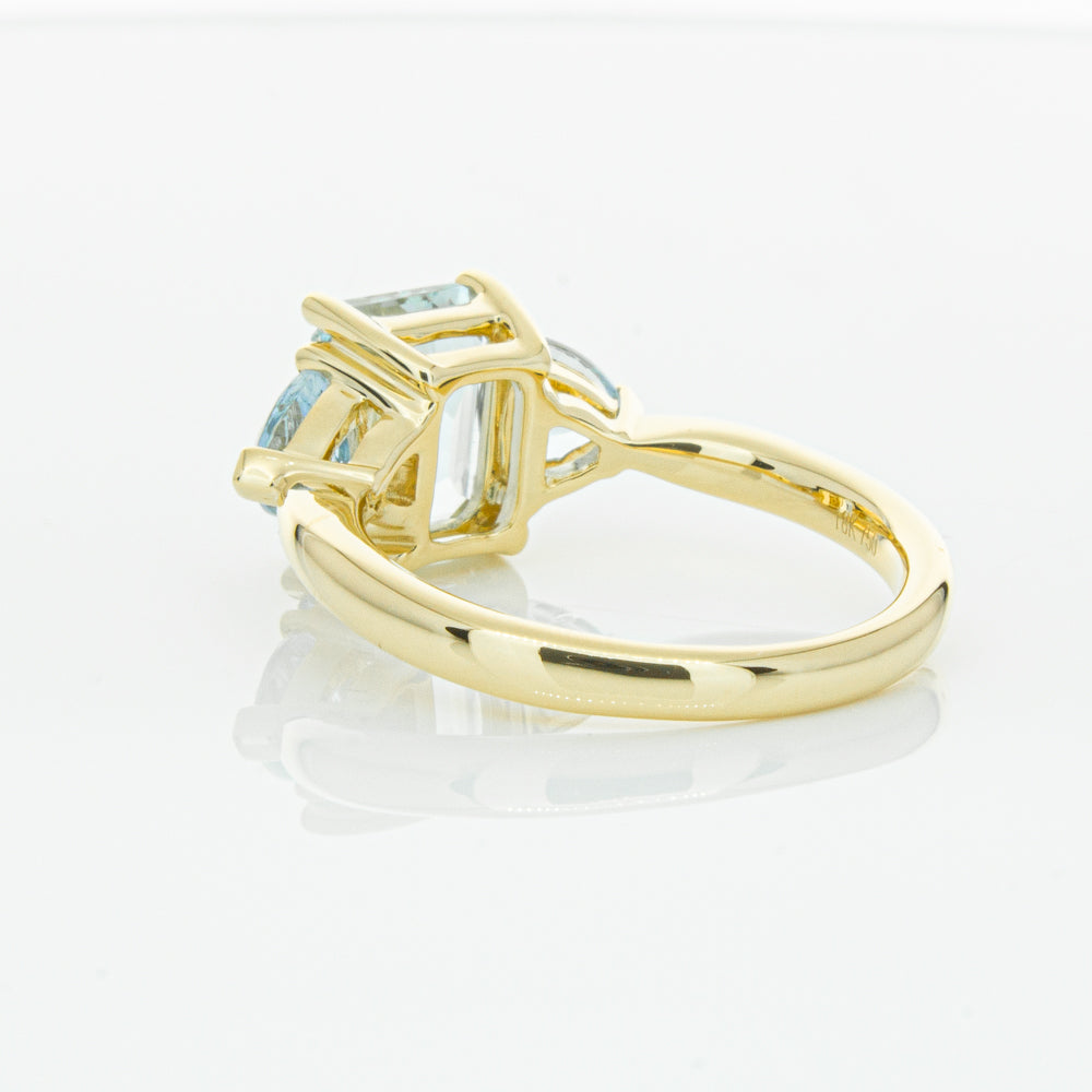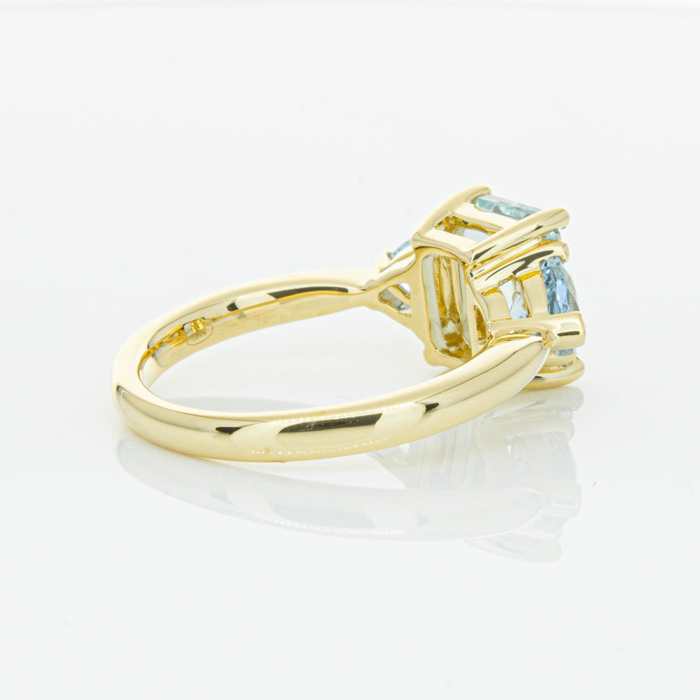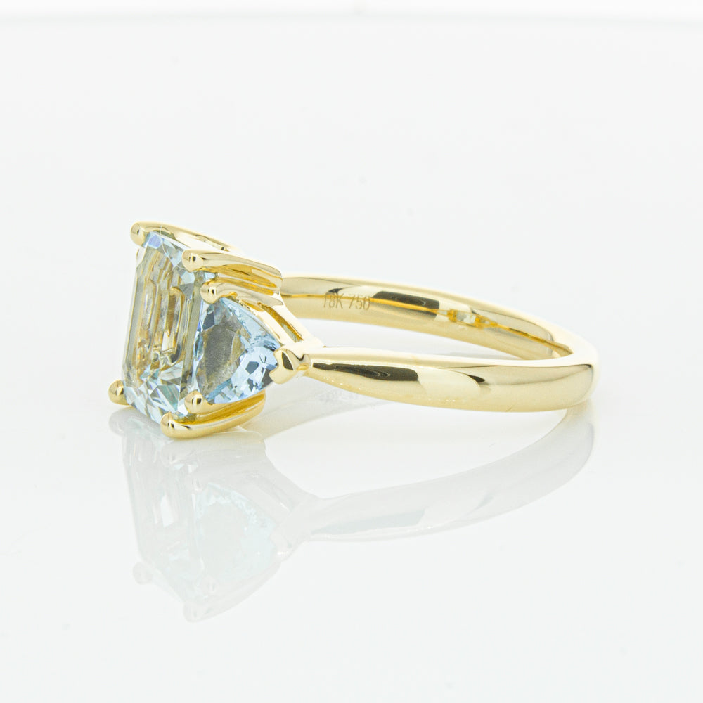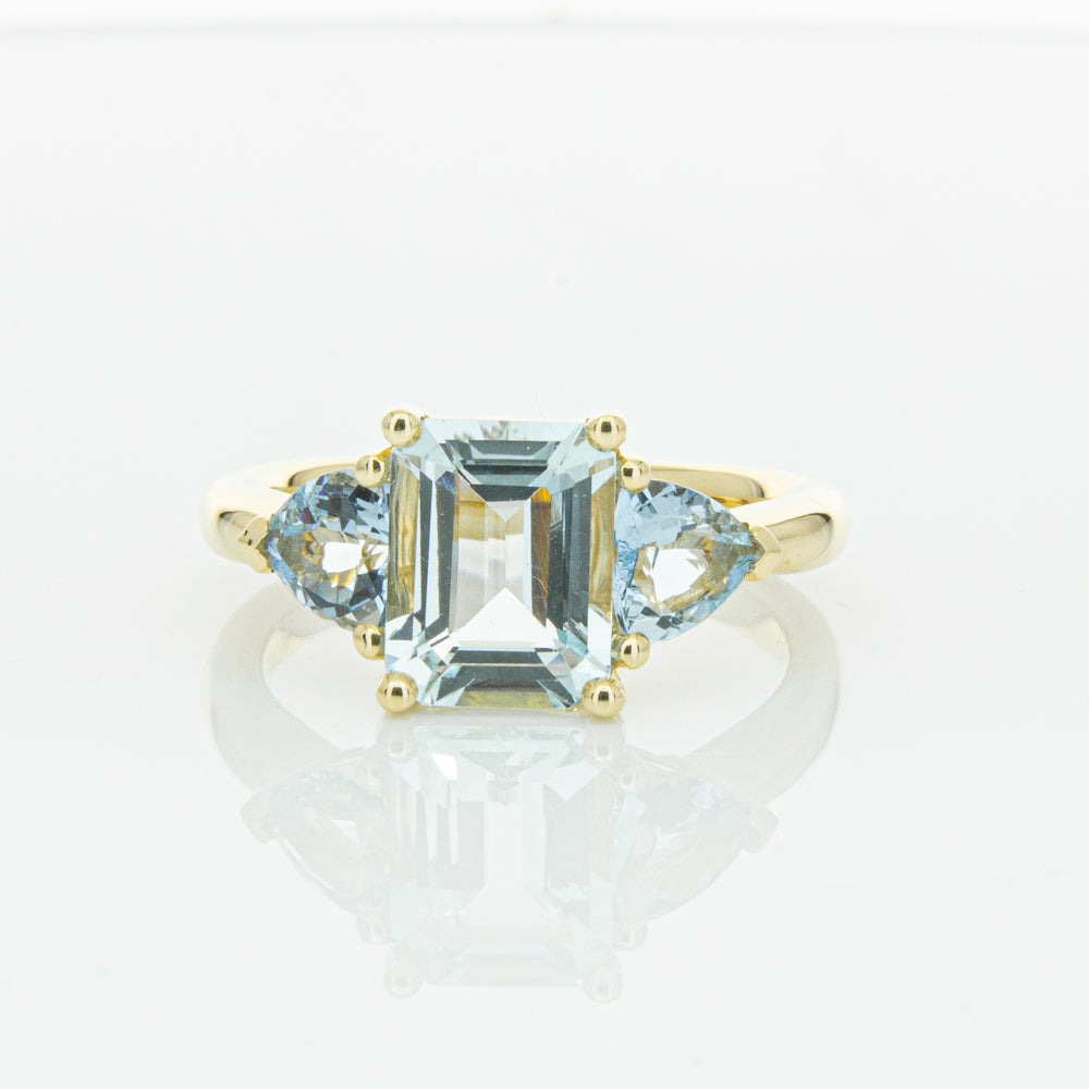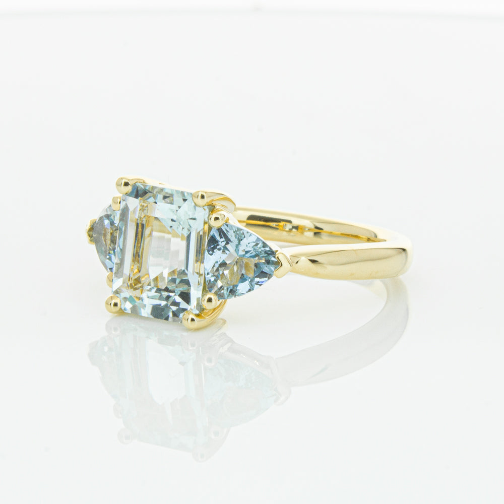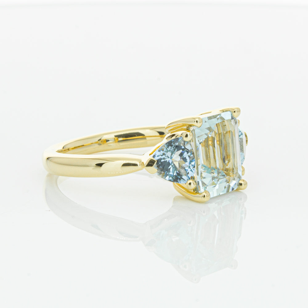 Inspired by the colours of the Malibu sunset, and crafted in 18ct yellow gold, this beautiful Malibu ring from our signature 1899 collection boasts a centre calming aquamarine, framed by two trilliant cut aquamarines.