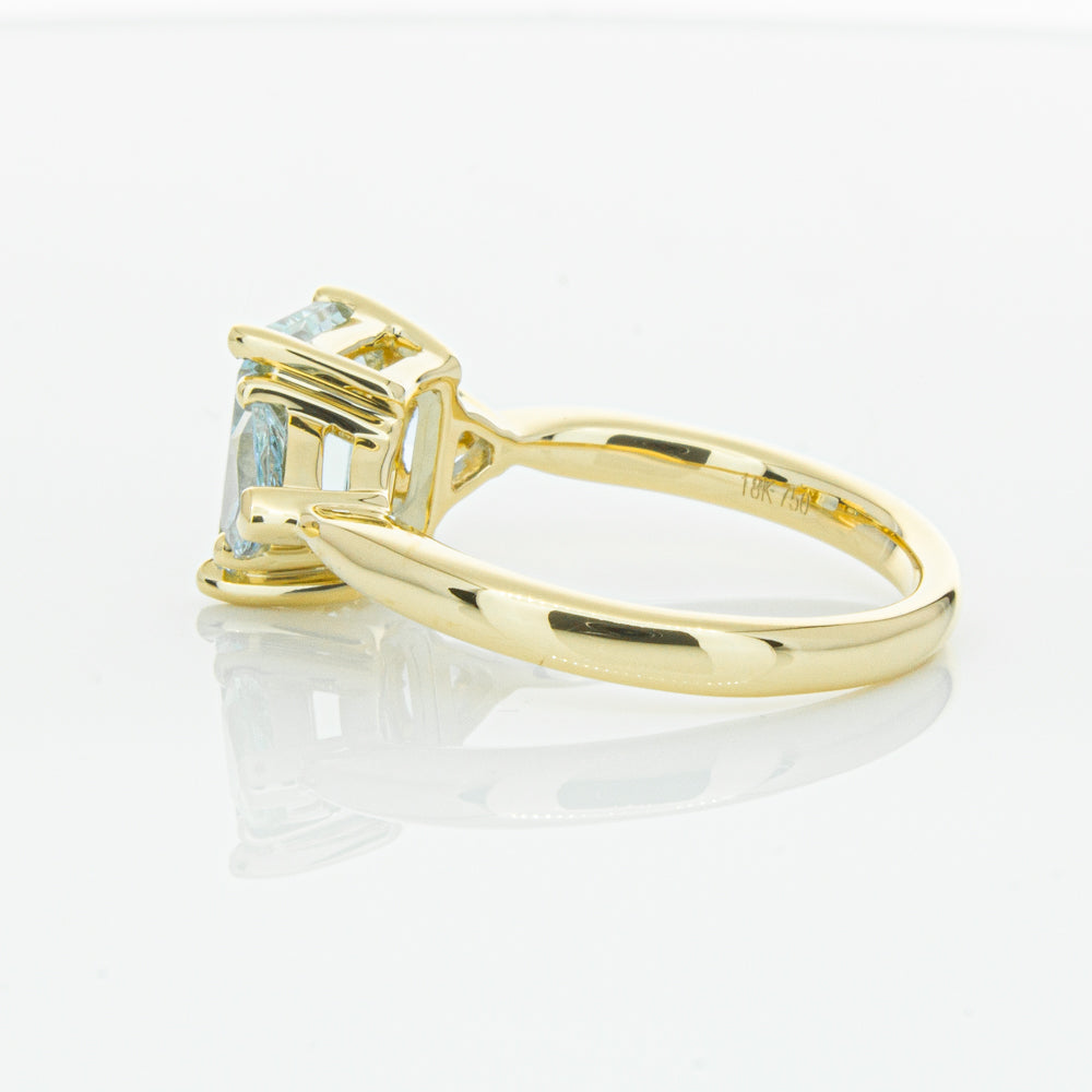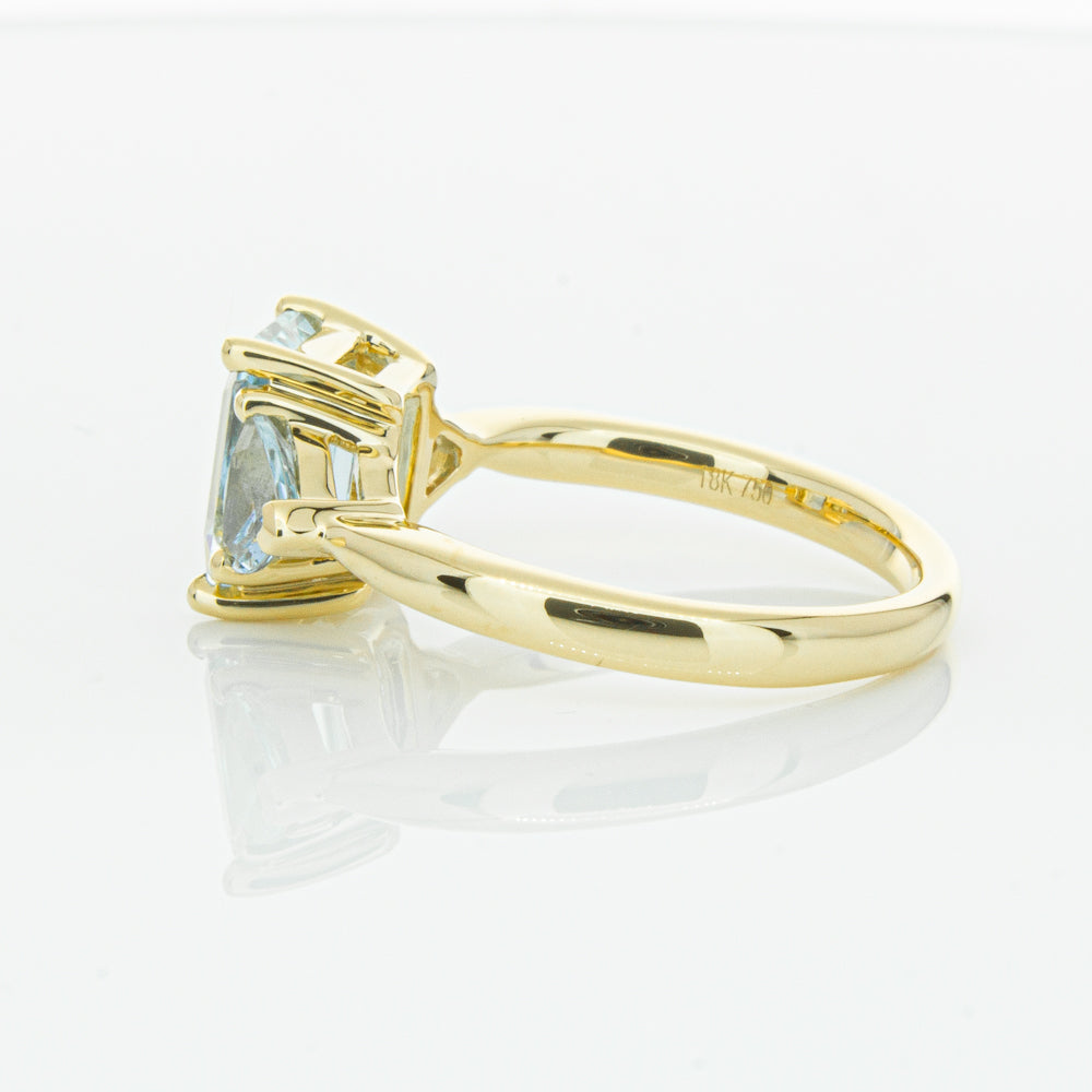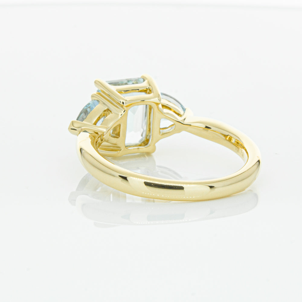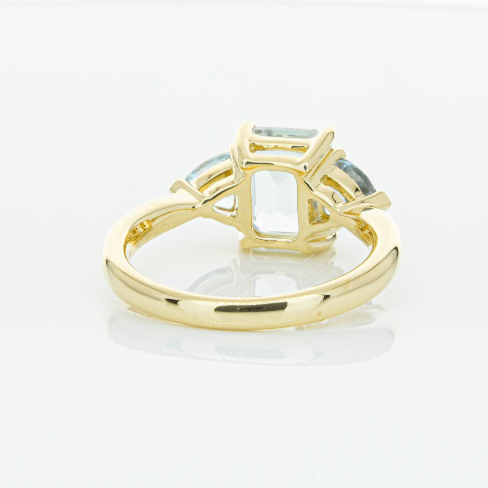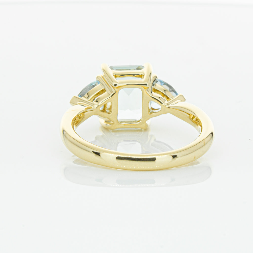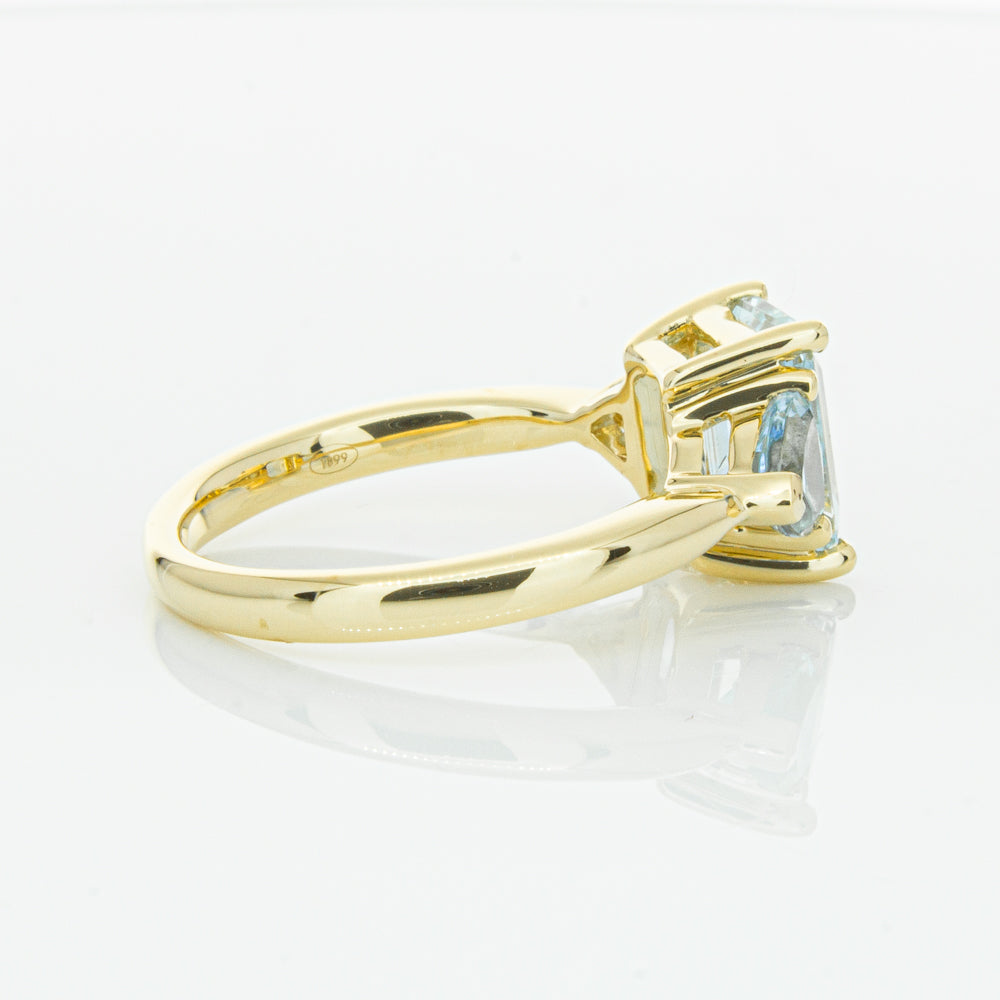Inspired by the colours of the Malibu sunset, and crafted in 18ct yellow gold, this beautiful Malibu ring from our signature 1899 collection boasts a centre calming aquamarine, framed by two trilliant cut aquamarines.