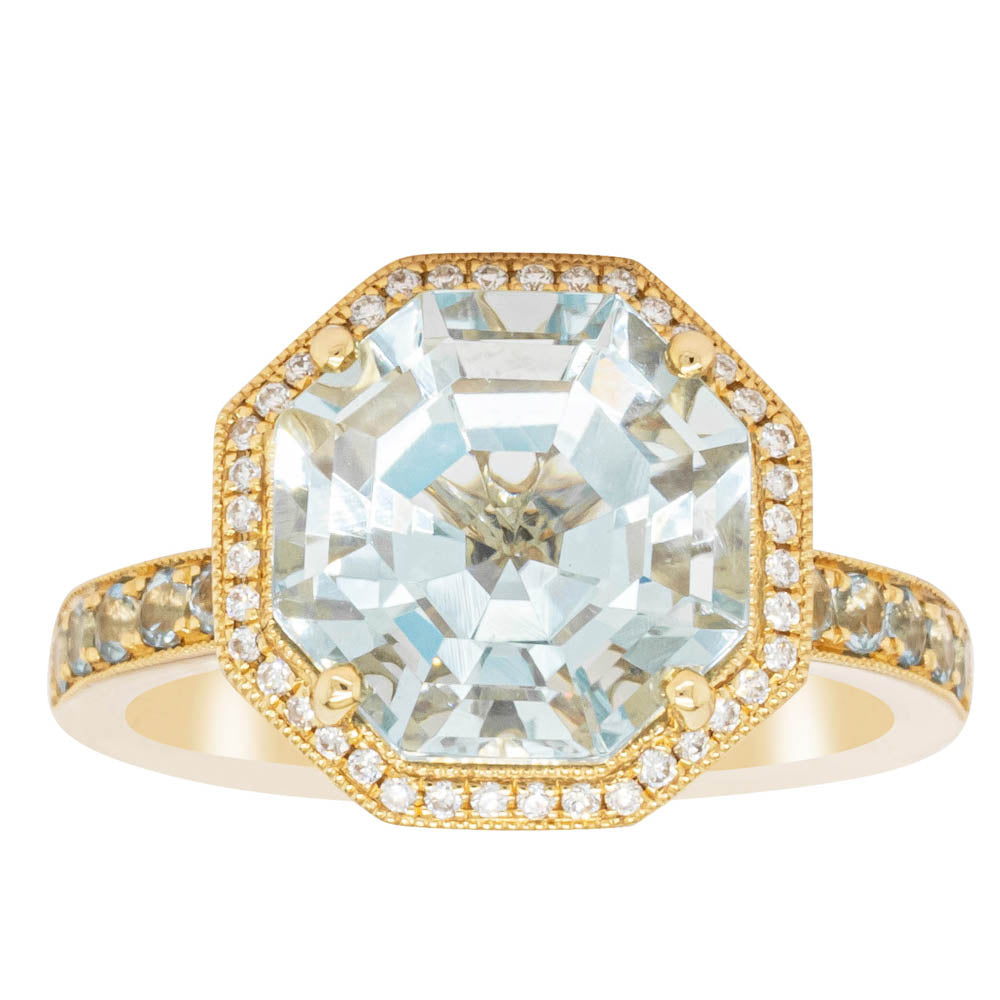 This glistening 1899 Octavex ring boasts one impressive octagonal faceted aquamarine from Africa, in a 18ct yellow gold band with smaller aquamarine set shoulders. Strikingly unique, the aquamarine is haloed with diamonds. You will adore showing off this mesmerising ring!