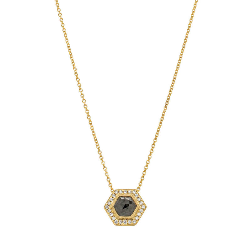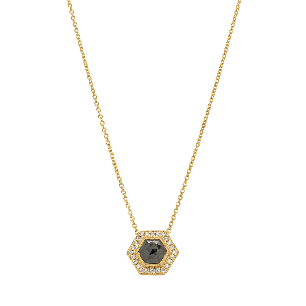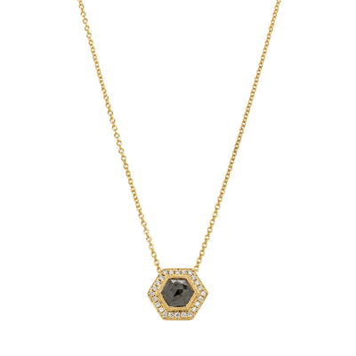 Exceptionally set in beautiful 18ct yellow gold, this stunning pendant features one rose cut black diamond framed by a delicate white diamond halo.