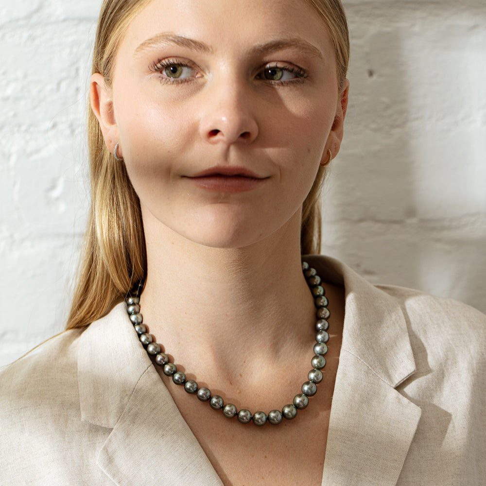 A perfect pairing of beauty and grace, this 18ct White Gold Cultured Black Pearl Necklace features 42 9.2-10.5mm pearls and an elegant fluted ball clasp that will undoubtedly dazzle and impress.