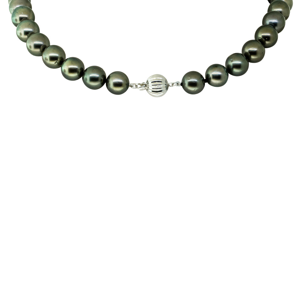 A perfect pairing of beauty and grace, this 18ct White Gold Cultured Black Pearl Necklace features 38 10-11.8mm pearls and an elegant fluted ball clasp that will undoubtedly dazzle and impress.