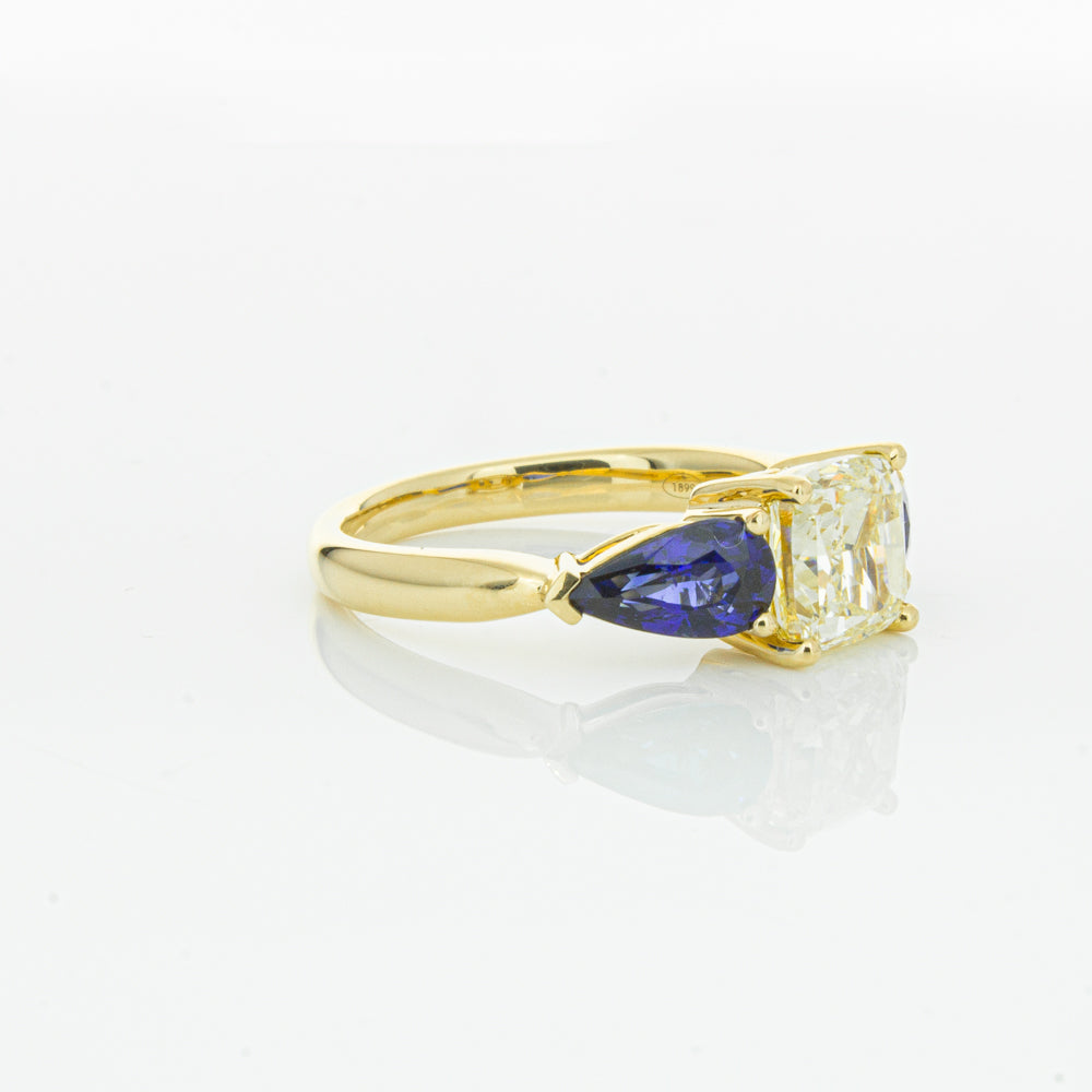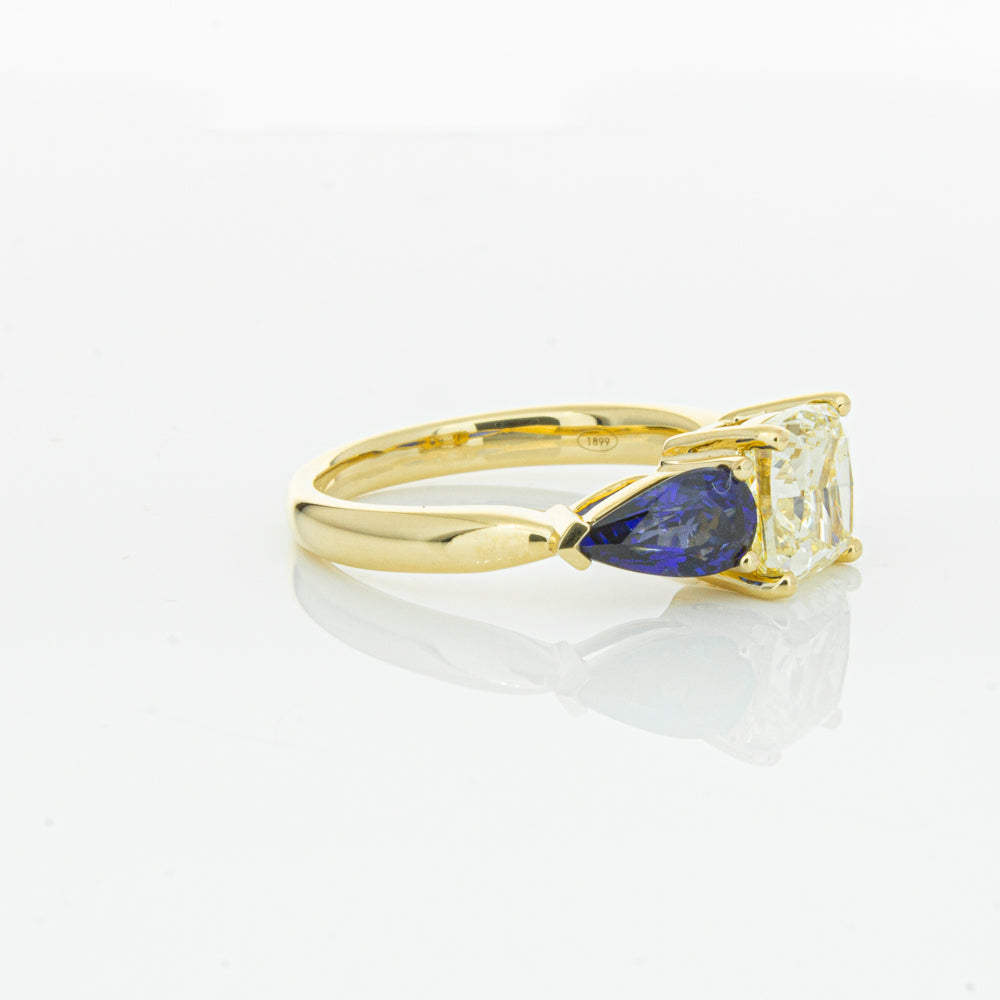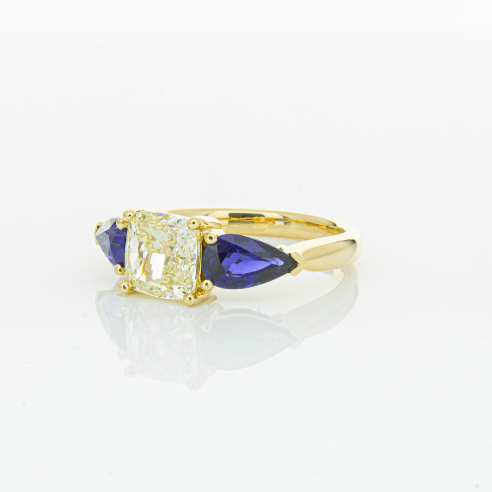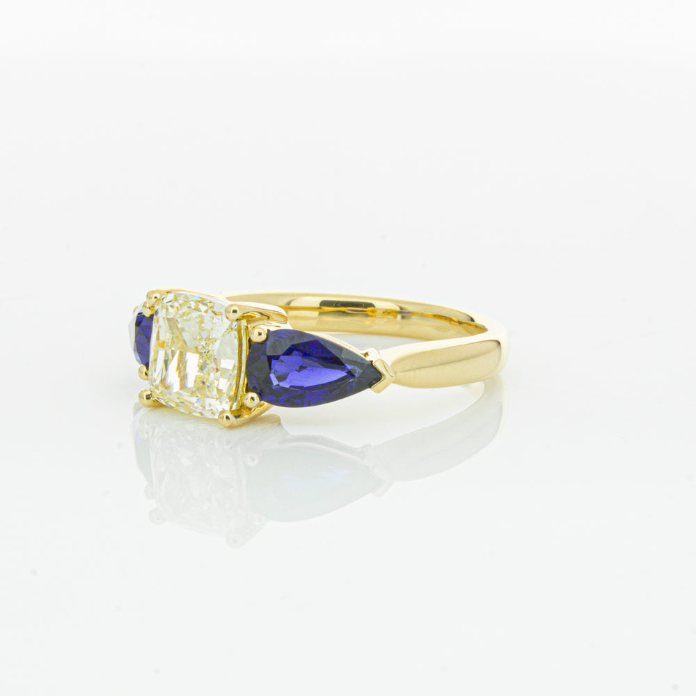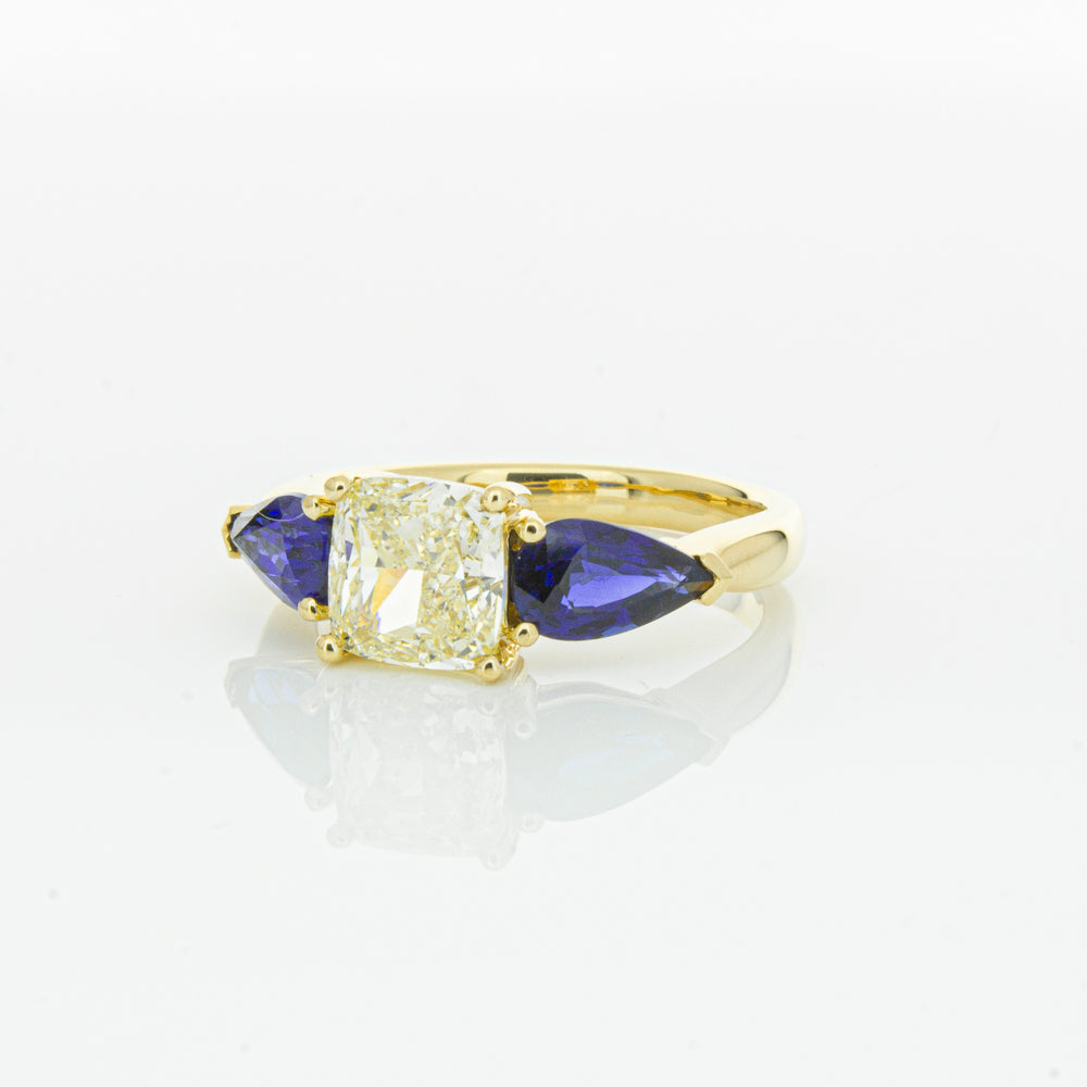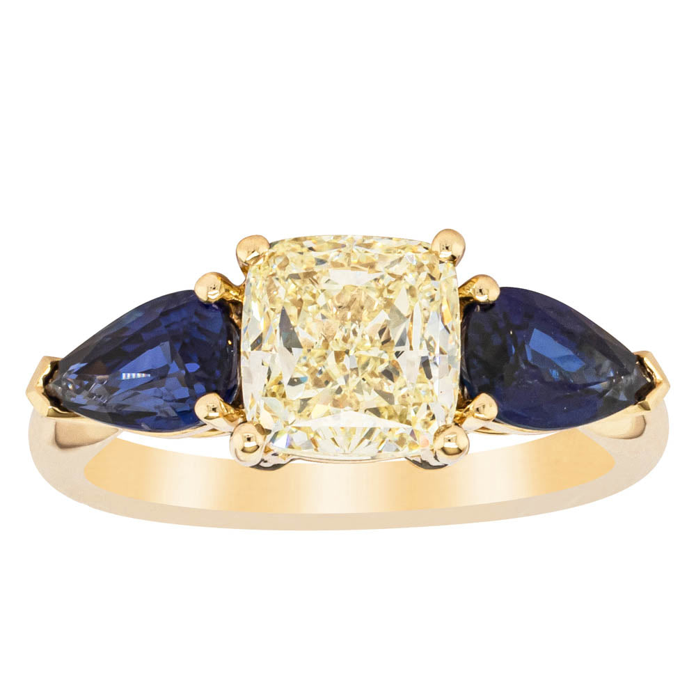 Boasting a stunning cushion cut yellow diamond and two pear faceted sapphires you will be the definition of beauty and elegance in this Ayla ring from our signature 1899 collection, beautifully set in 18ct yellow gold.