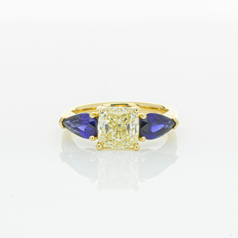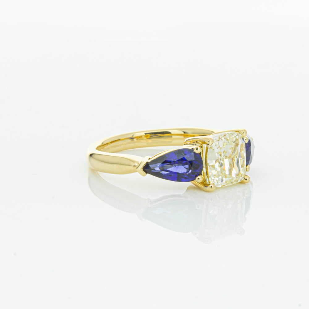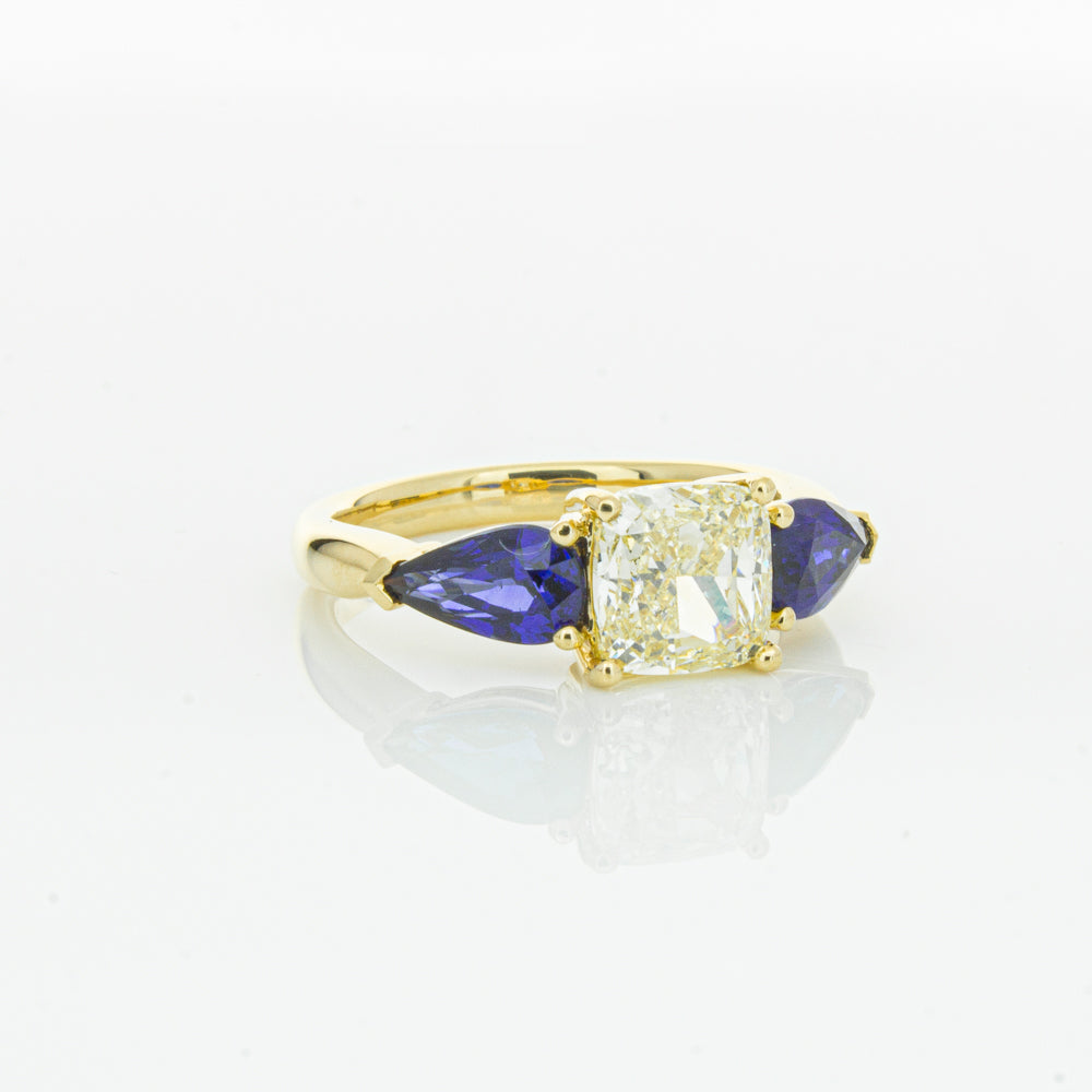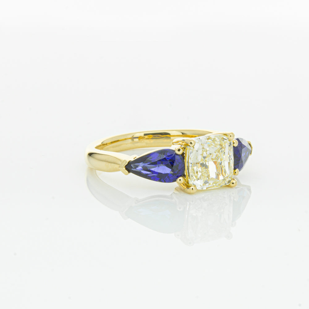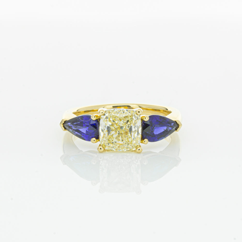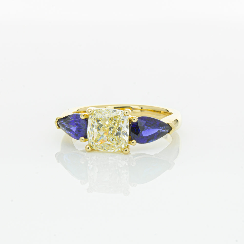 Boasting a stunning cushion cut yellow diamond and two pear faceted sapphires you will be the definition of beauty and elegance in this Ayla ring from our signature 1899 collection, beautifully set in 18ct yellow gold.