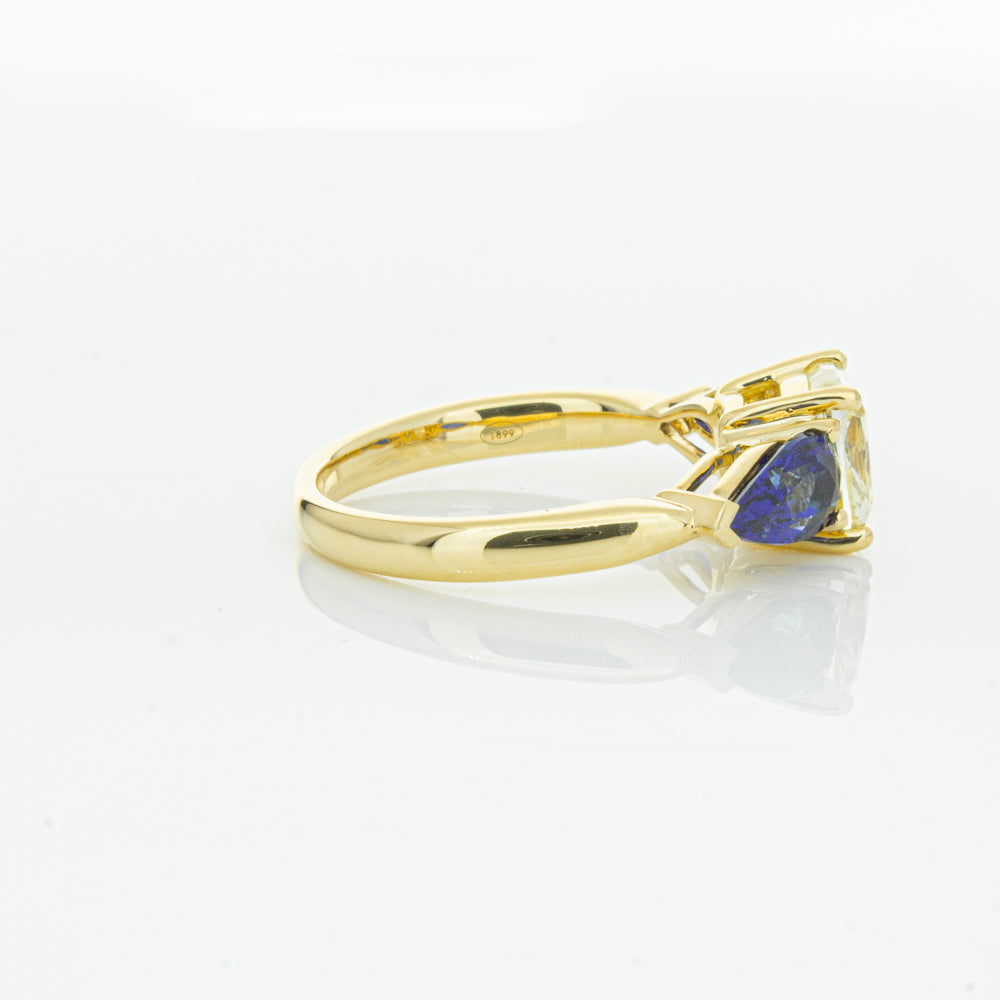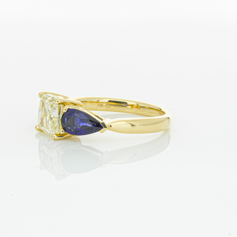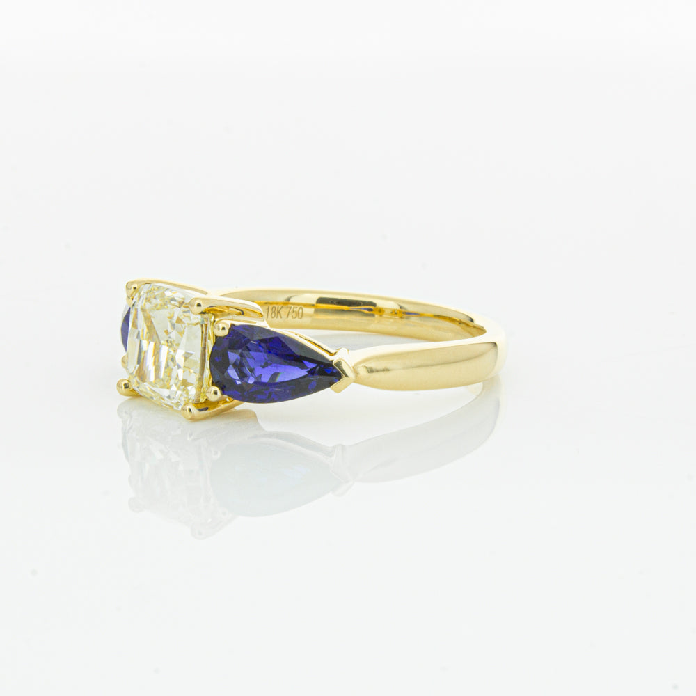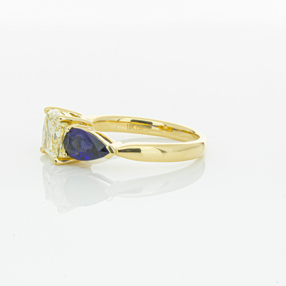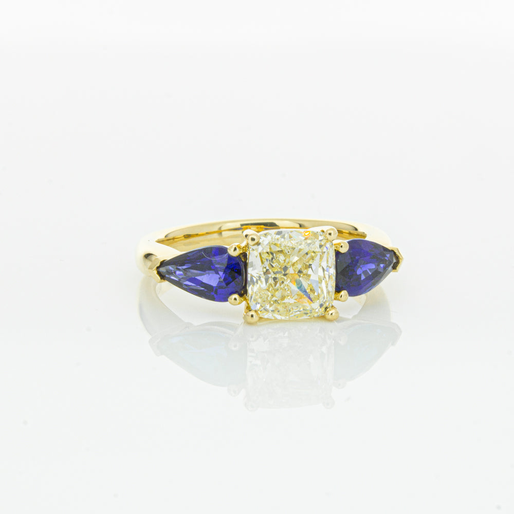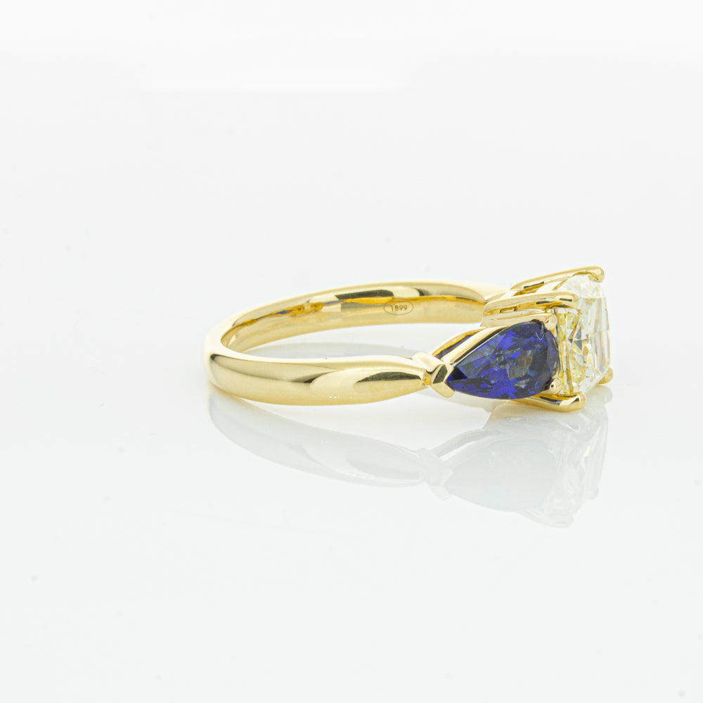 Boasting a stunning cushion cut yellow diamond and two pear faceted sapphires you will be the definition of beauty and elegance in this Ayla ring from our signature 1899 collection, beautifully set in 18ct yellow gold.