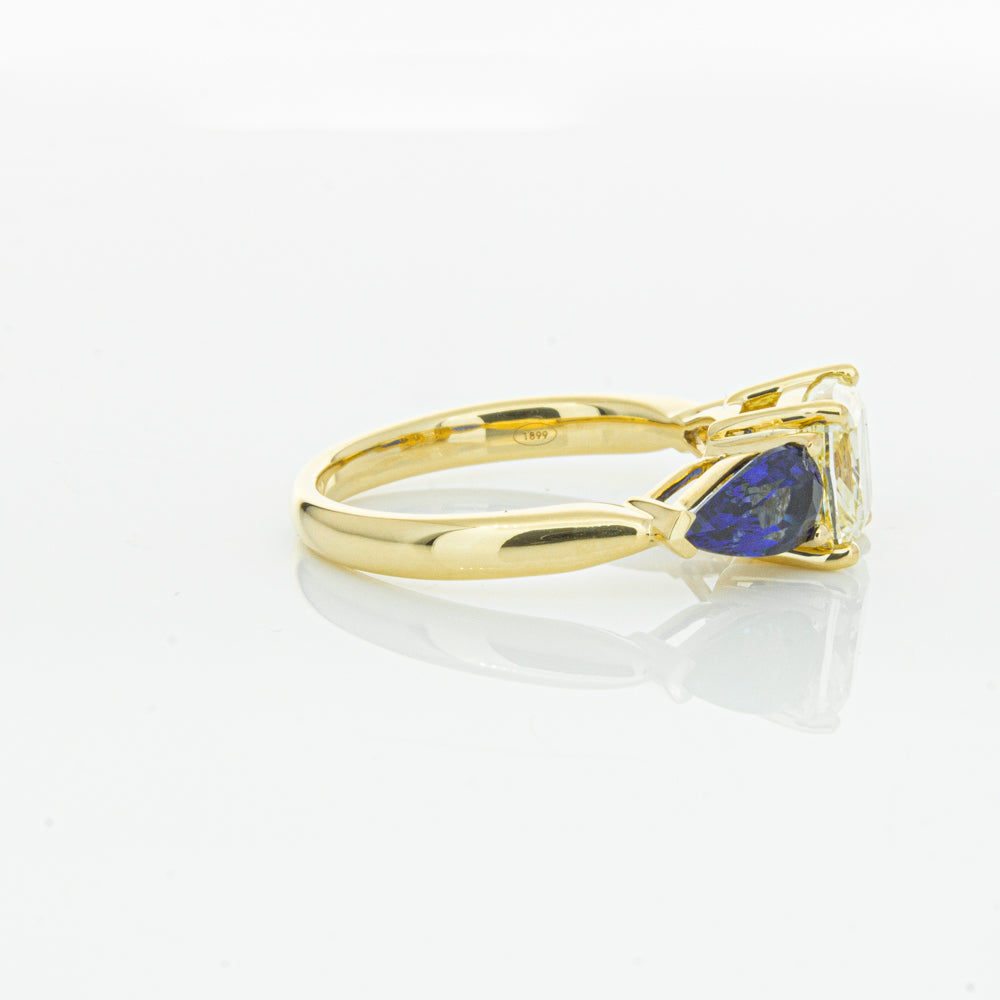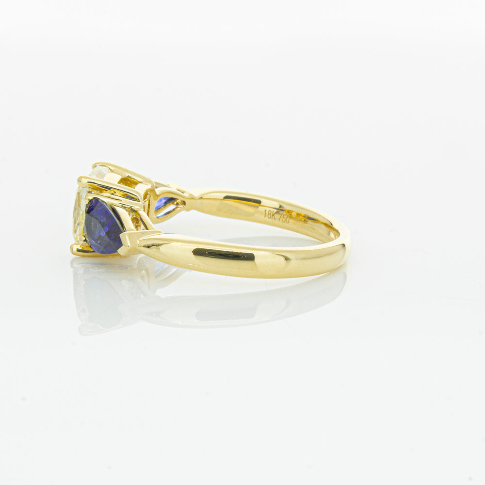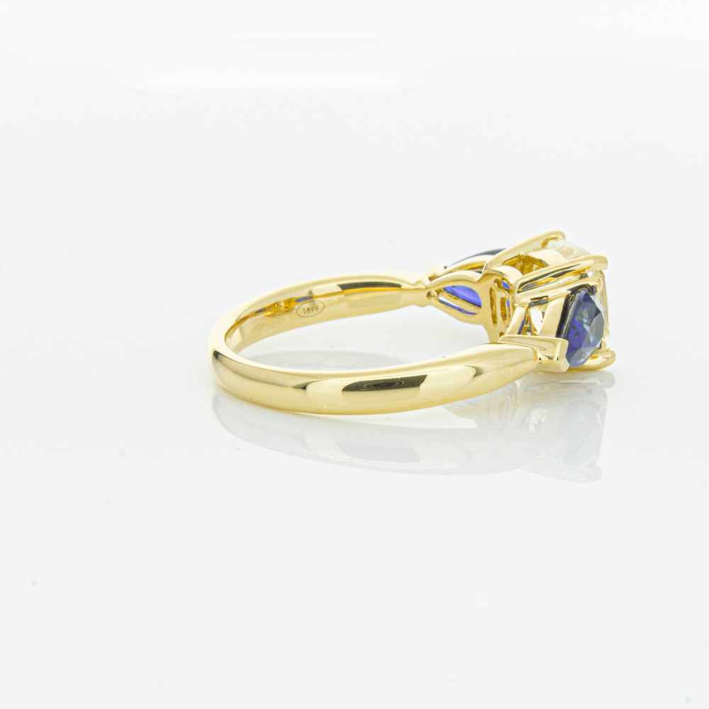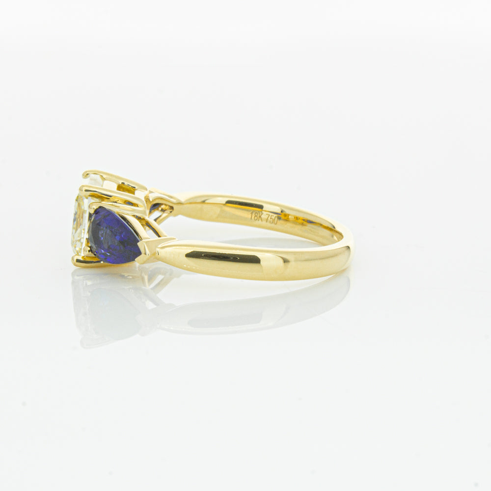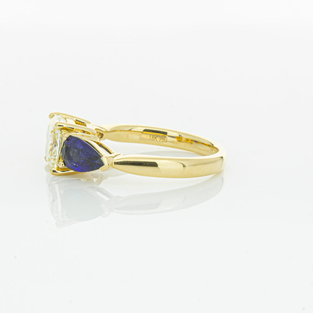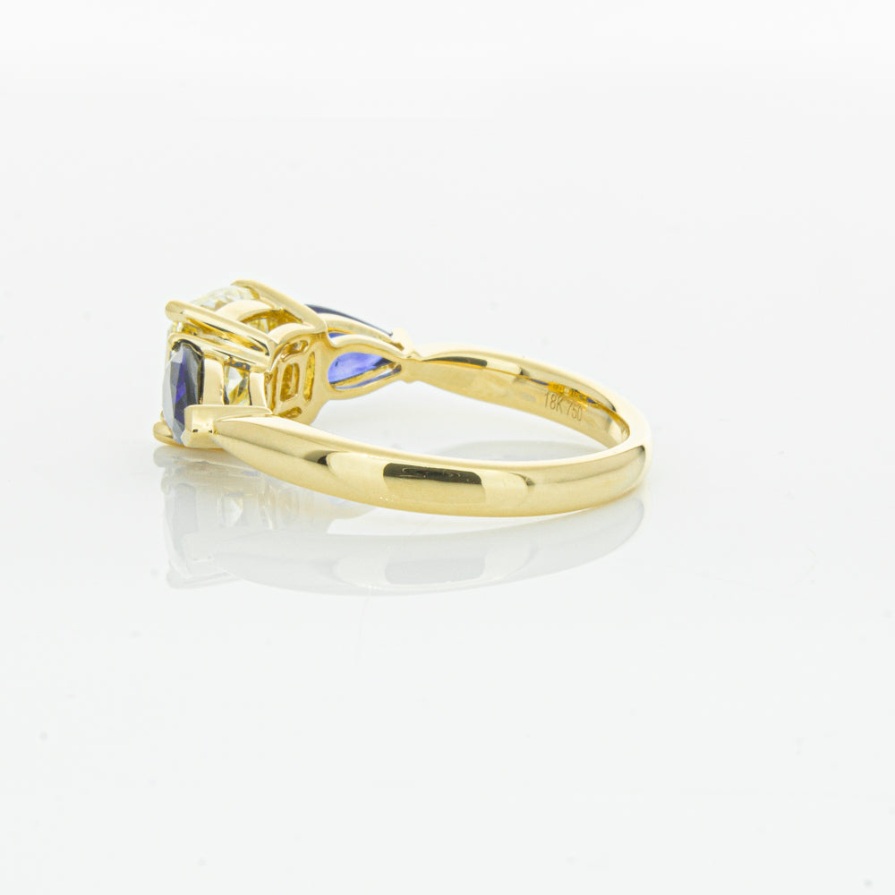 Boasting a stunning cushion cut yellow diamond and two pear faceted sapphires you will be the definition of beauty and elegance in this Ayla ring from our signature 1899 collection, beautifully set in 18ct yellow gold.