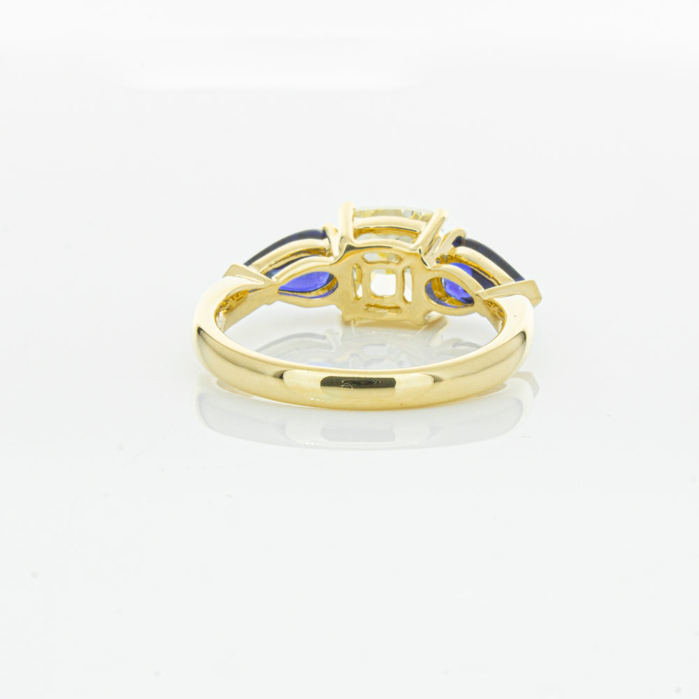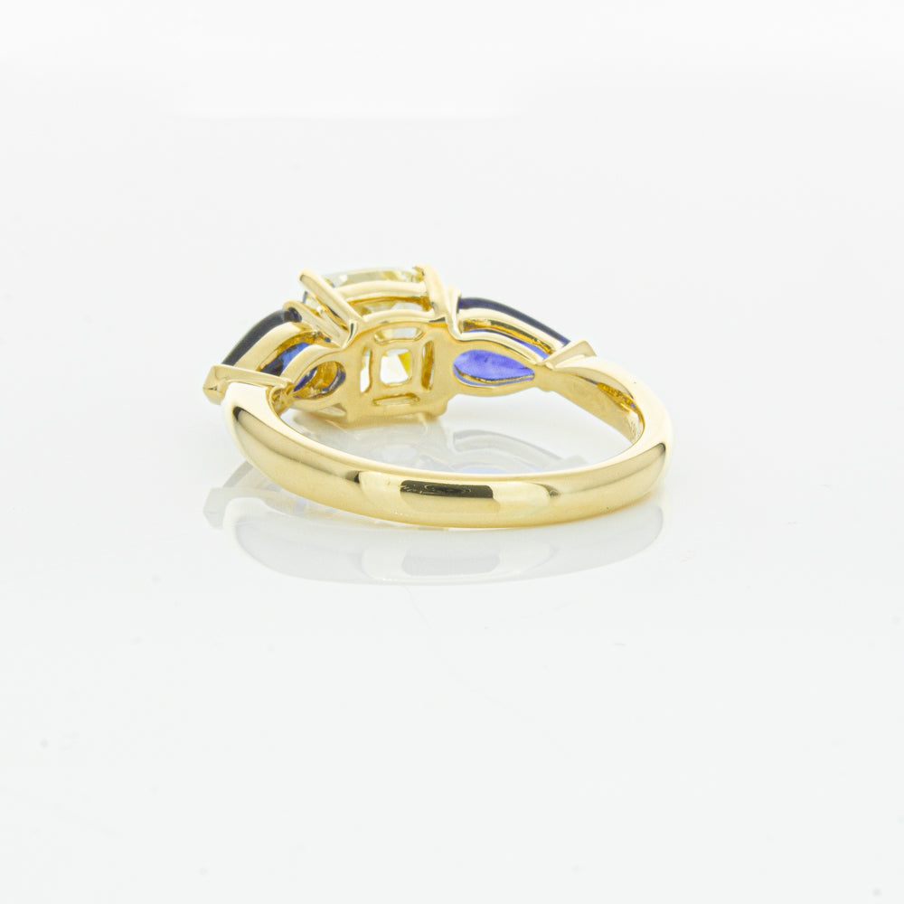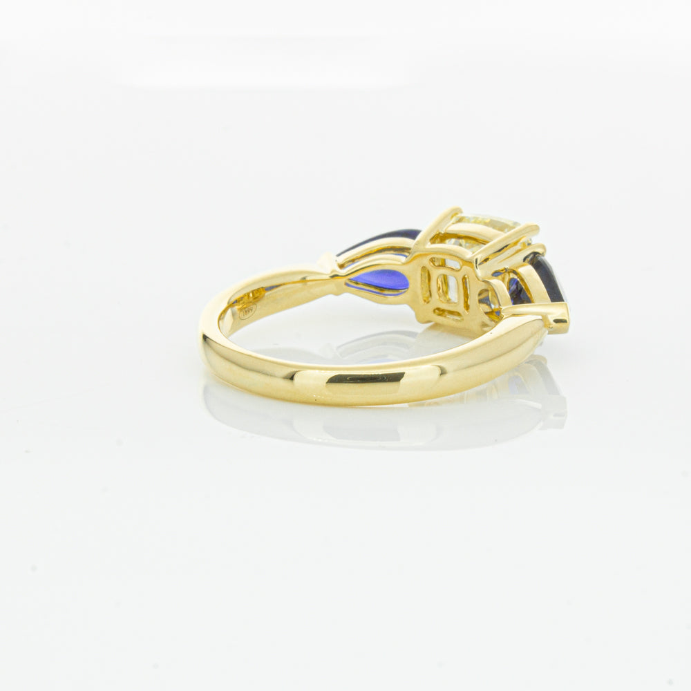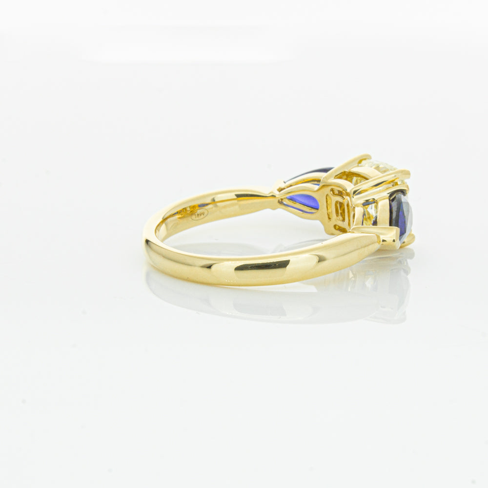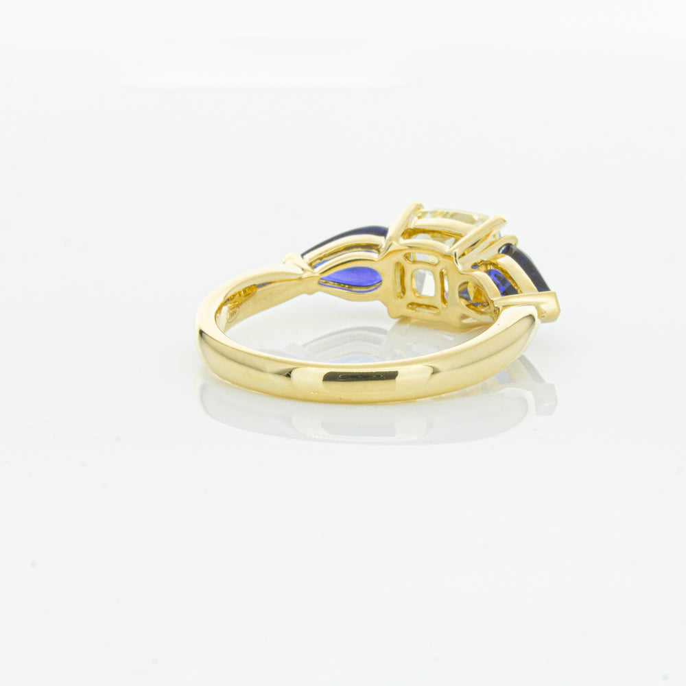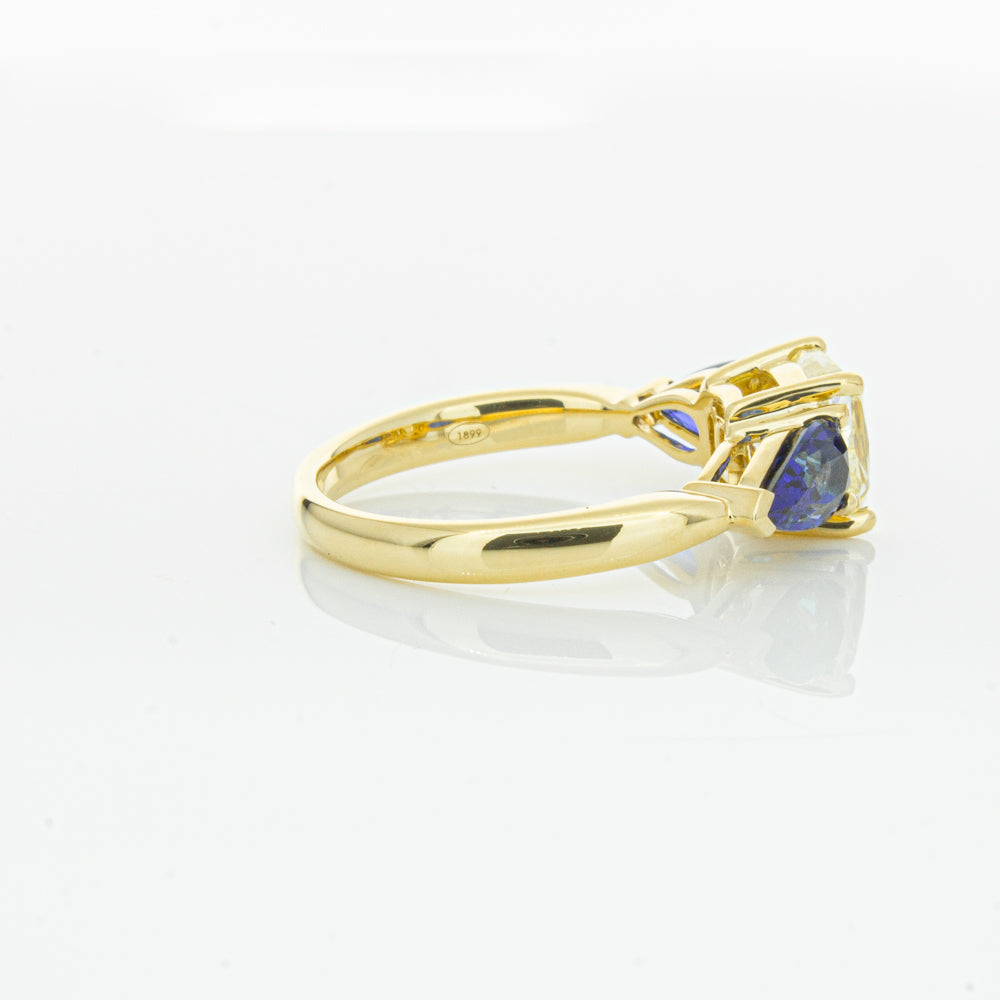 Boasting a stunning cushion cut yellow diamond and two pear faceted sapphires you will be the definition of beauty and elegance in this Ayla ring from our signature 1899 collection, beautifully set in 18ct yellow gold.