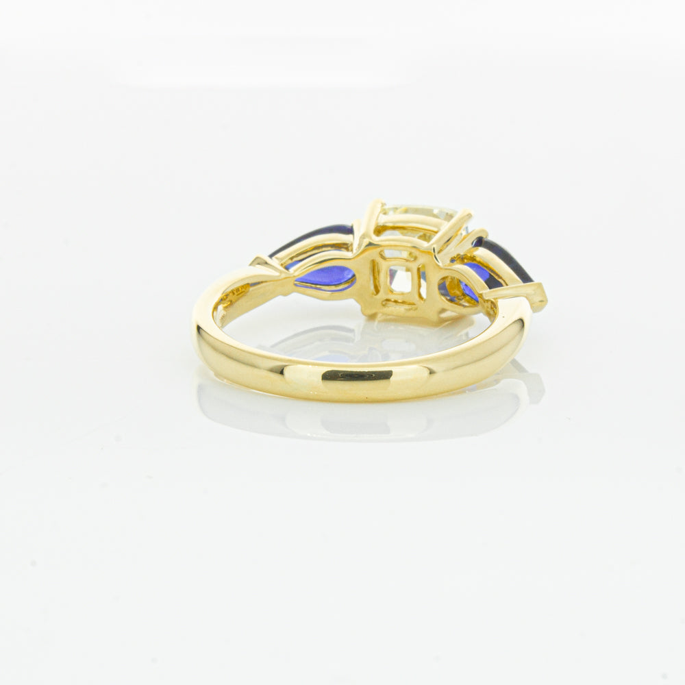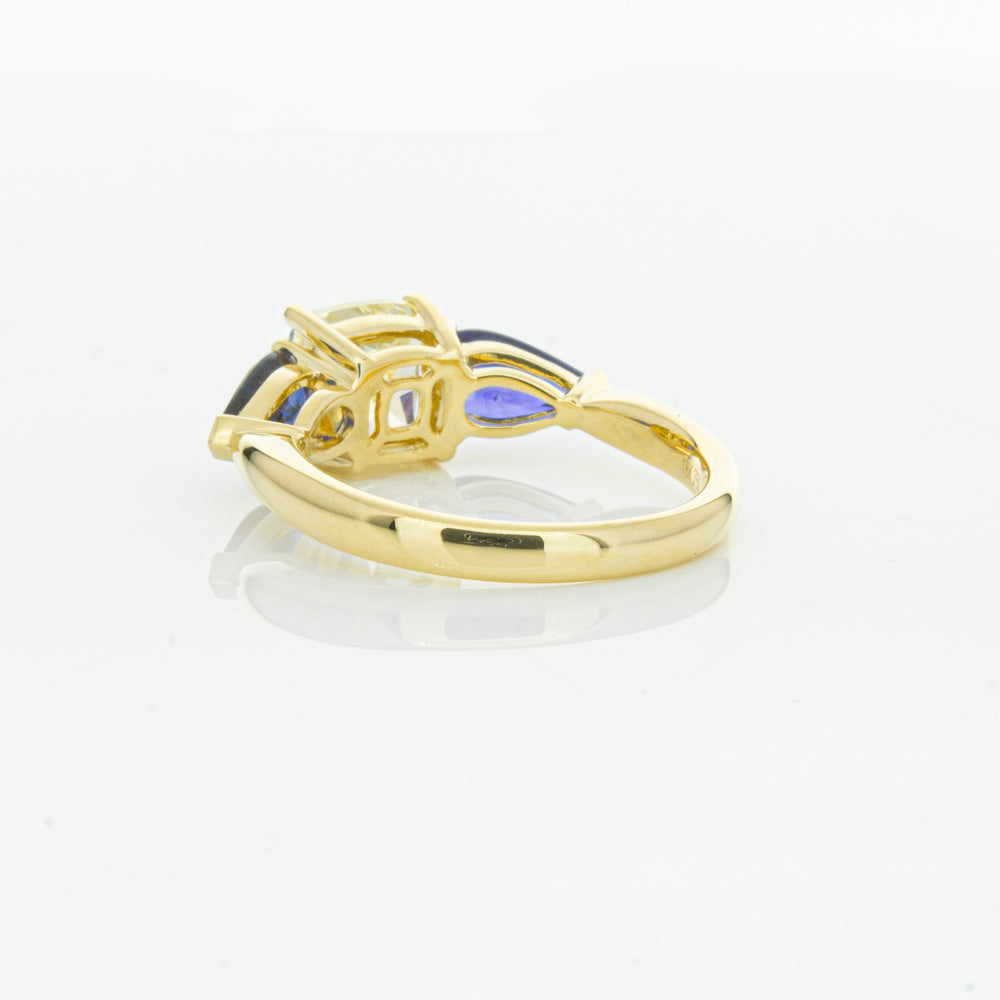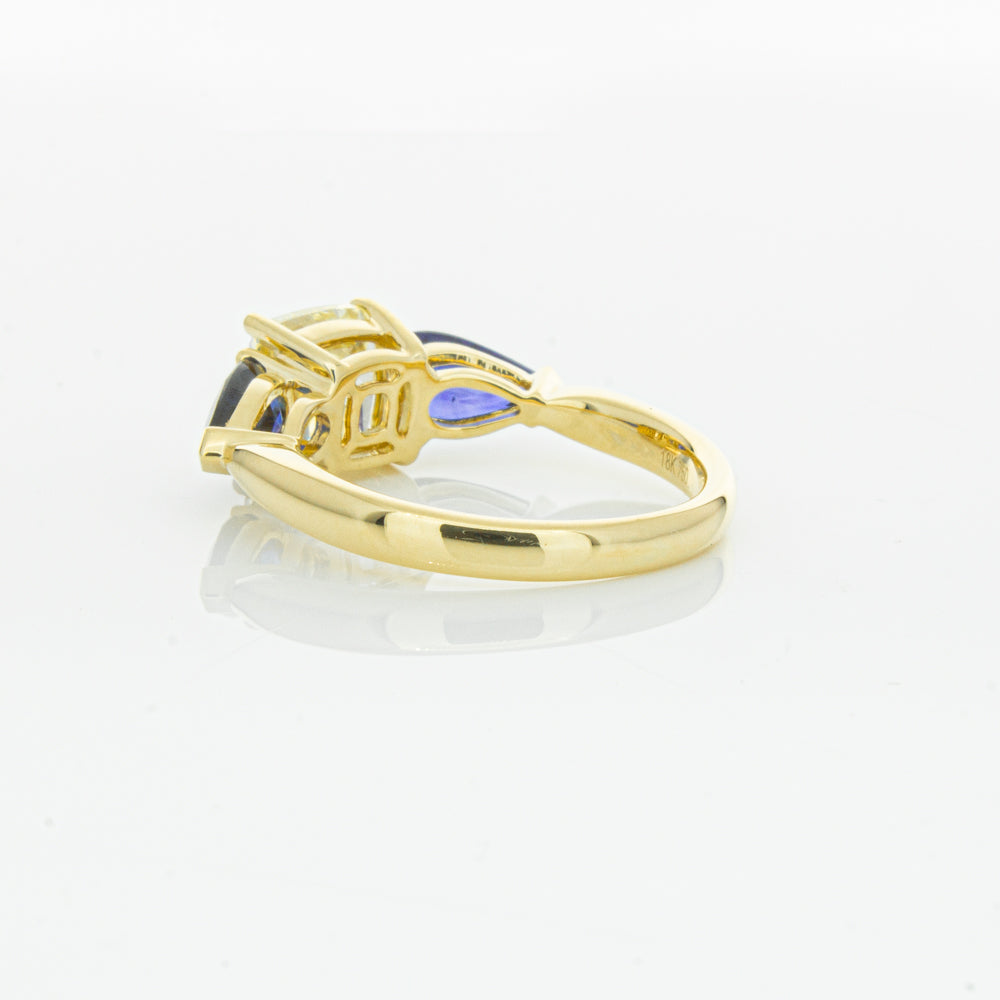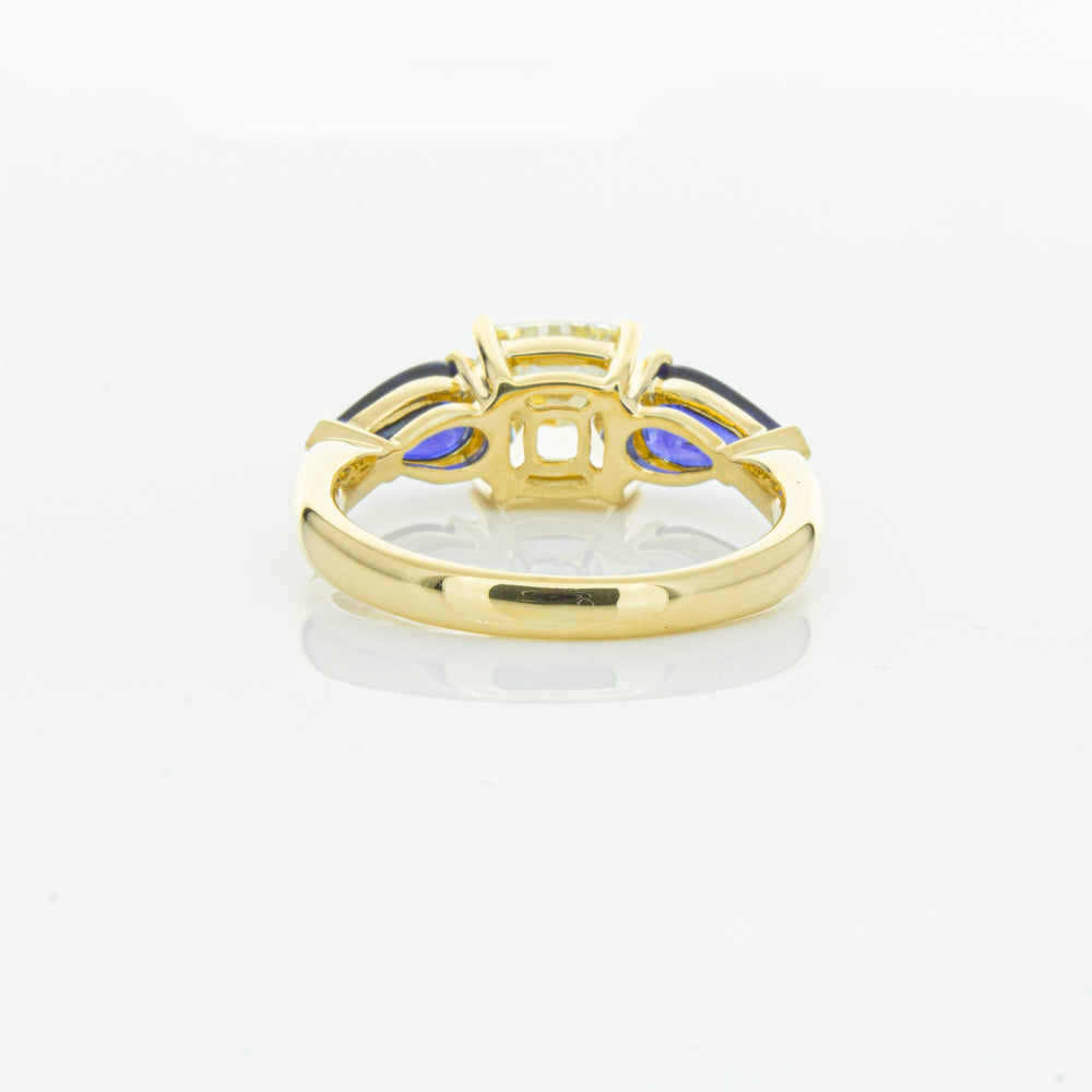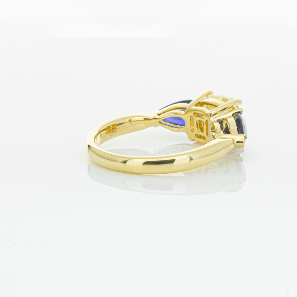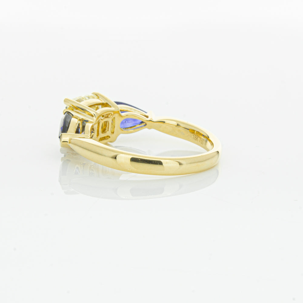 Boasting a stunning cushion cut yellow diamond and two pear faceted sapphires you will be the definition of beauty and elegance in this Ayla ring from our signature 1899 collection, beautifully set in 18ct yellow gold.